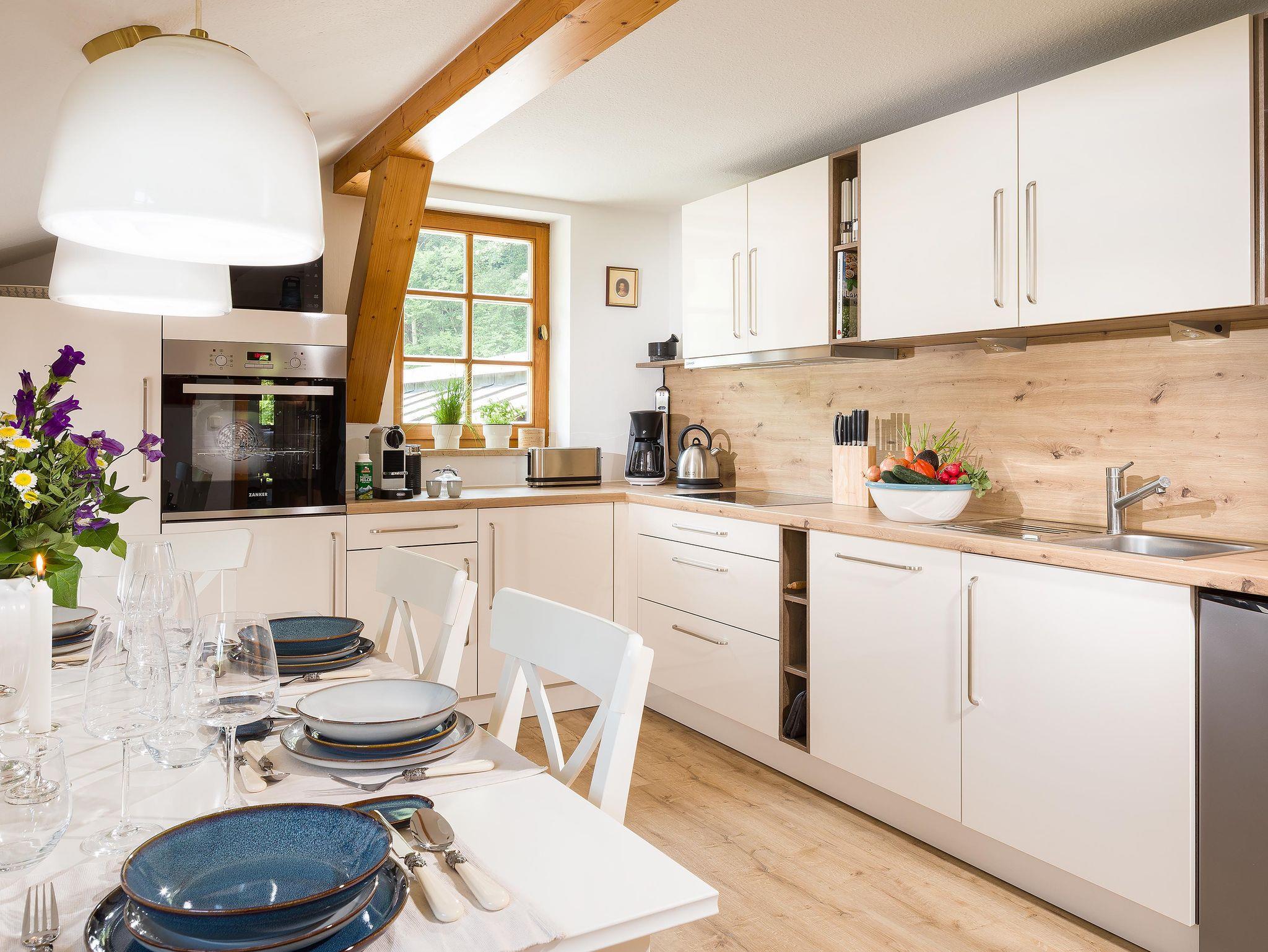 Die komplett eingerichtete Küche mit Espressomaschiene, Spühlmaschiene, Herd, Mikrowelle und ausreichenden Küchenutensielien bietet genügend Platz für gemeinsame Kochabende und Mahlzeiten.
