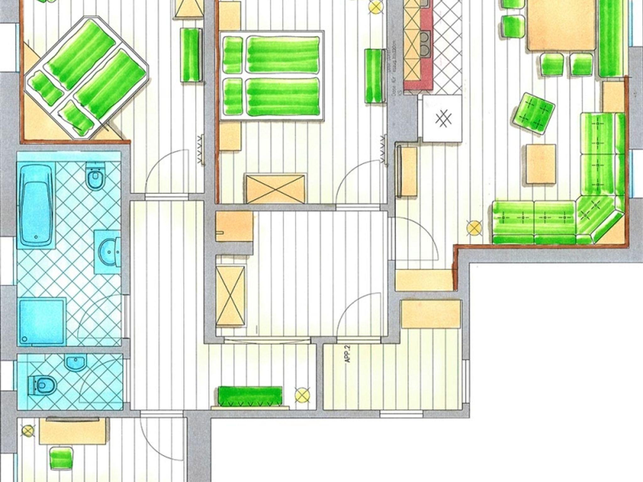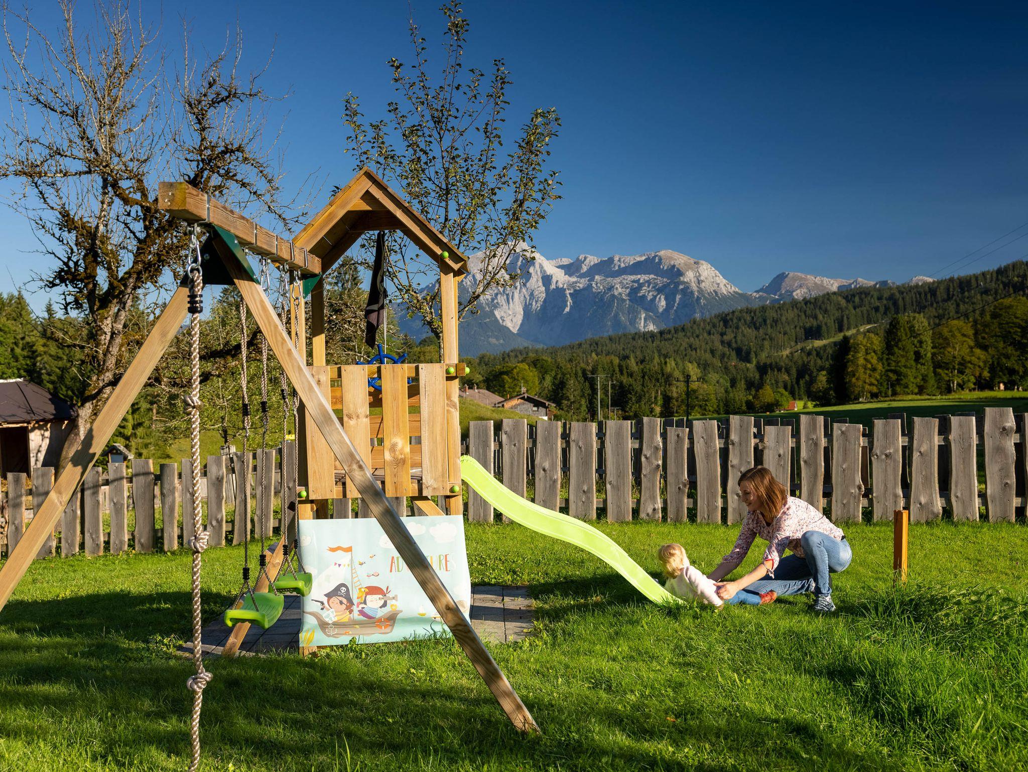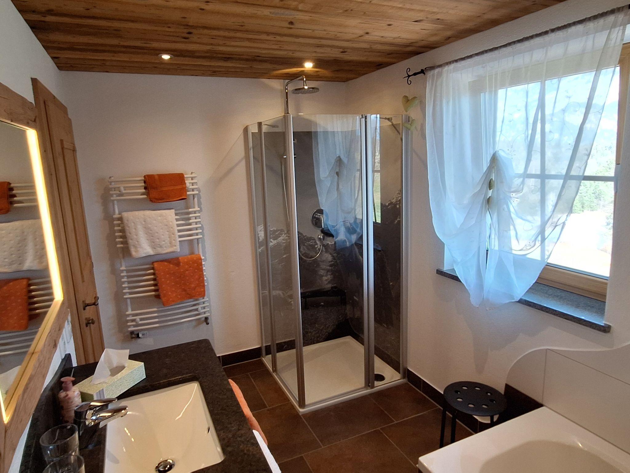 Die Ferienwohnung besteht aus: * einem 30 m² großen Wohn-/Küchenbereich mit einer voll ausgestatteten Küchenzeile, Eckbank, Esstisch, Stühlen und Couch * einem separaten Schlafzimmer mit erhöhtem Doppelbett (Länge 2,10 m) und Zudecke in Übergröße * einem zusätzlichen Schlafzimmer wie oben ausgestattet * einem Badezimmer mit Dusche, separater Badewanne und WC * einem separaten WC mit Außenfenster * einem Leseraum, der auch als Schlafzimmer genutzt werden kann * einem großen Balkon mit herrlicher Aussicht. Die Ferienwohnung besticht durch uriges Alm-Ambiente mit exklusiver Altholzausstattung.
