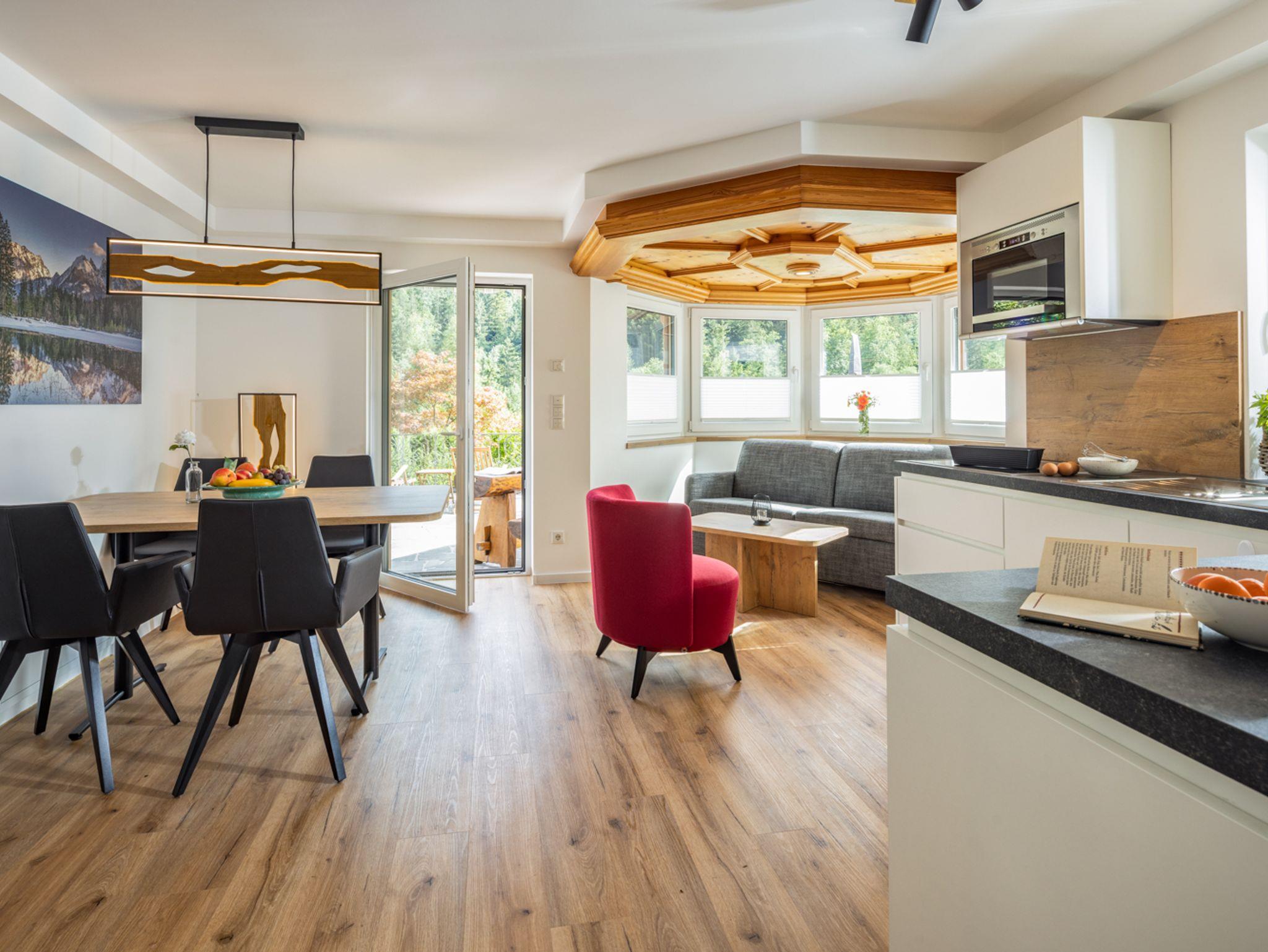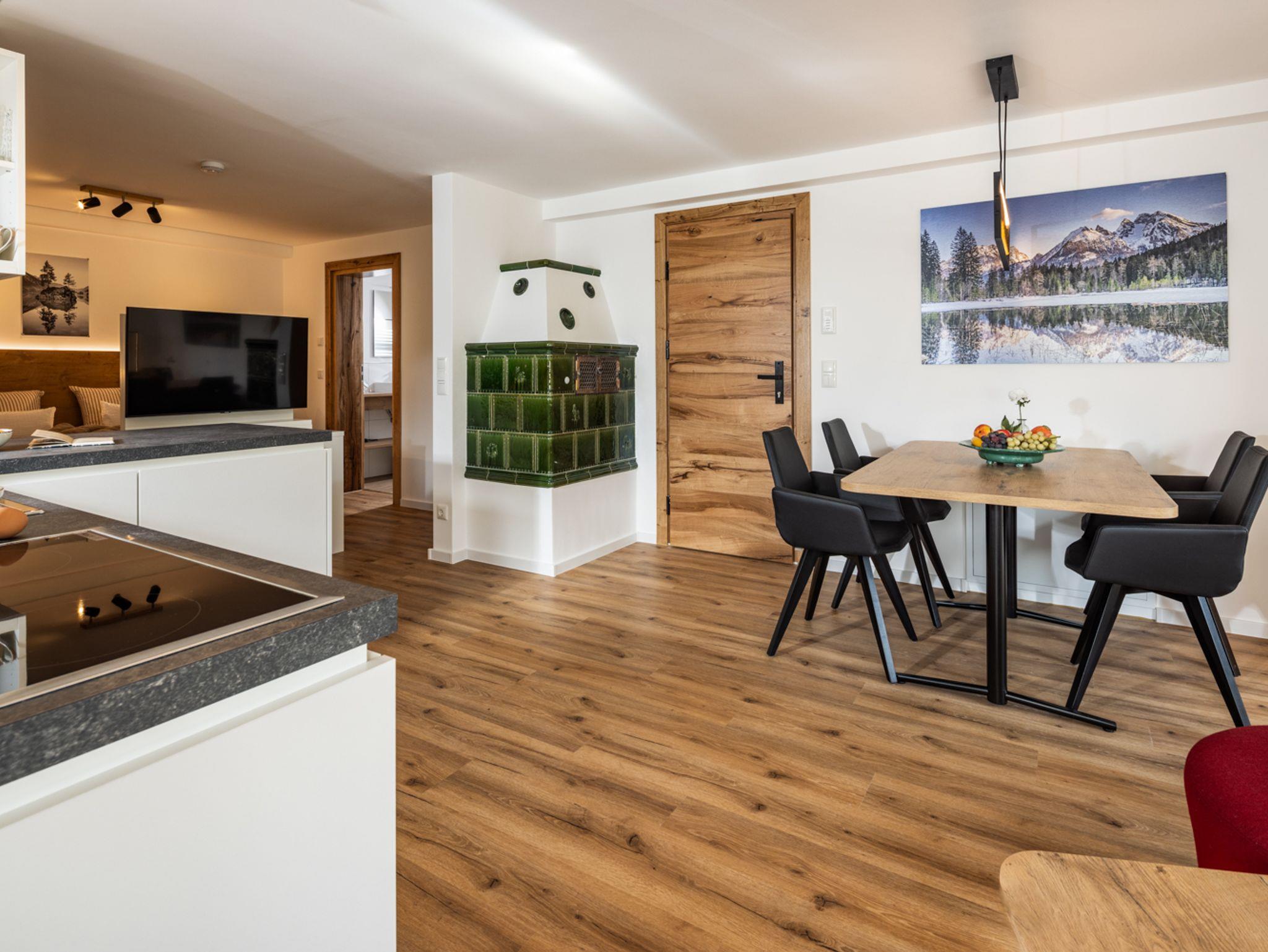 Die Wohnung „Hochkalter“ ist im Appartement-Stil mit kombiniertem Wohn- Schlafraum, großzügigem Küchenbereich sowie modernem Badezimmer eingerichtet. Sie befindet sich im Erdgeschoss des Haupthauses mit Platz für bis zu vier Personen.