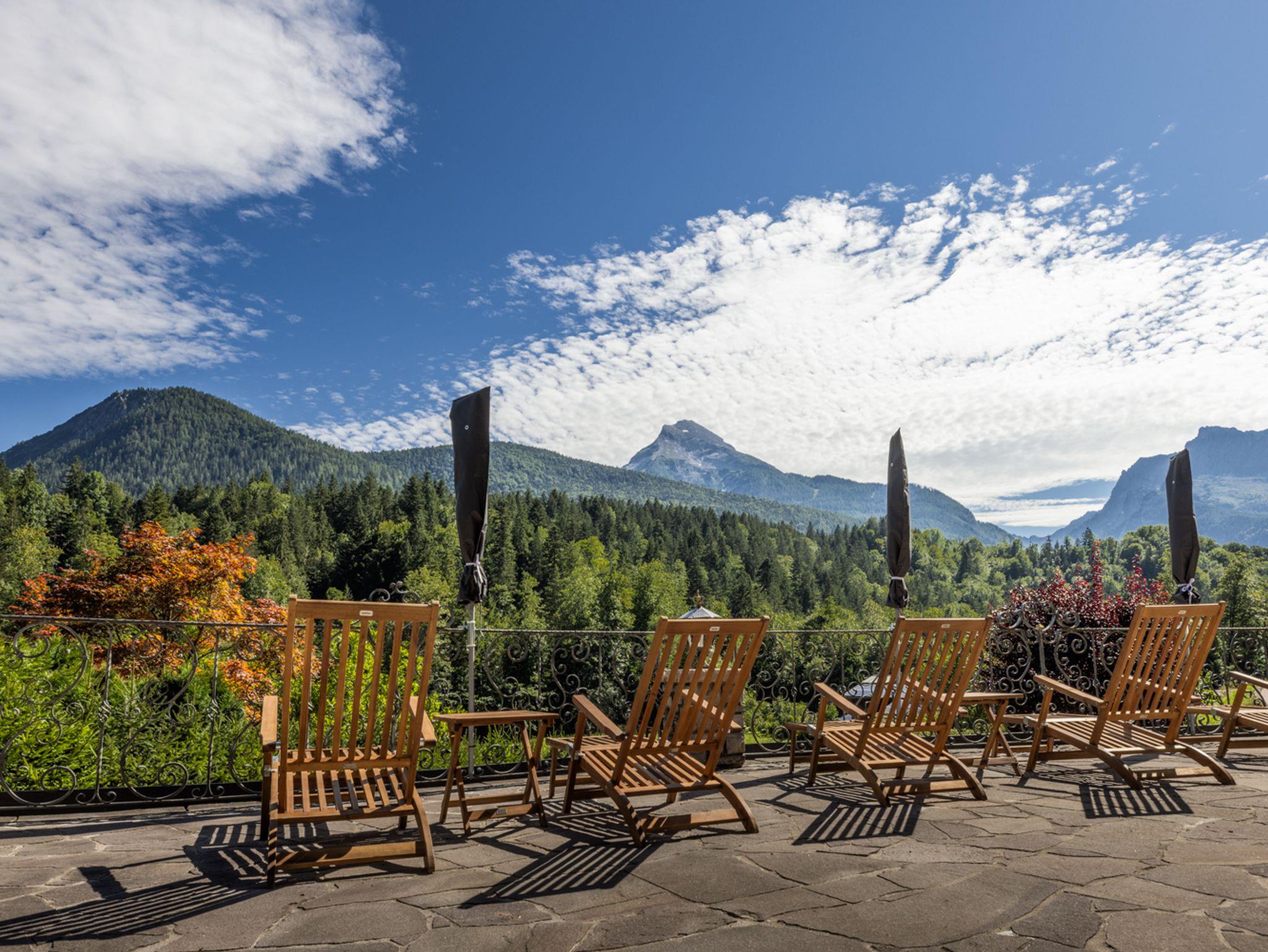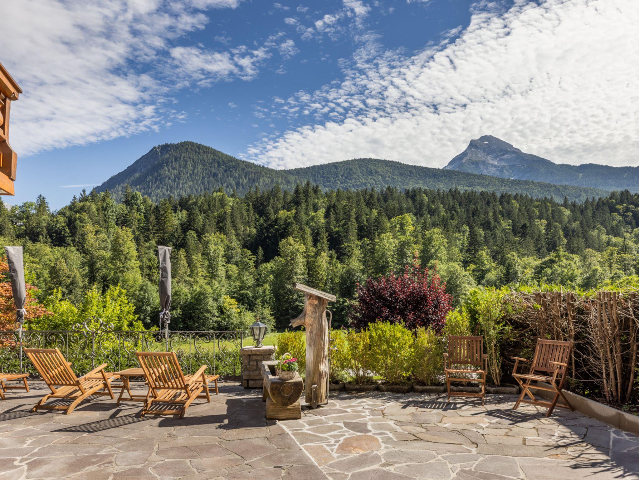 Die von der Wohnung aus zugängliche Terrasse bietet von der überdachten Sitzecke aus einen wunderschönen Blick auf das beeindruckende Panorama der Berchtesgadener Alpen und den majestätischen Watzmann.
