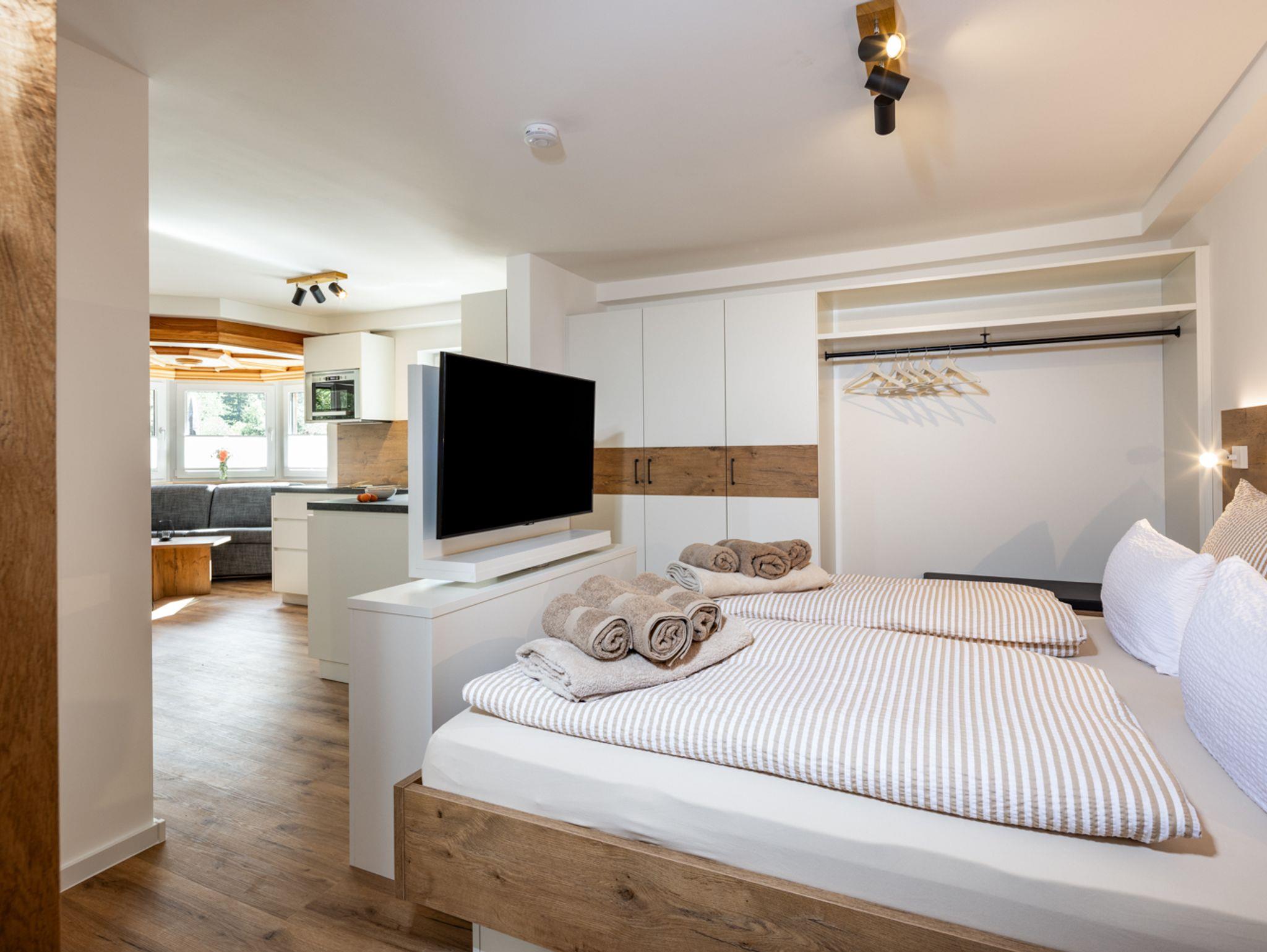 Ein drehbarer Flachbild-Smart-TV trennt den Wohnbereich optisch vom Schlafbereich ab. Dort bilden das bequeme, hinterleuchtete Doppelbett in der Größe 180×200 cm mit hochwertigen Tonnentaschenfederkernmatratzen, der großzügige Kleiderschrank mit angrenzender Garderobe sowie Kofferablage und integriertem Laptopsafe eine harmonische Einheit. Im Wohn-/ Essbereich steht für die 3. und 4. Person ein Dauerschläfer-Sofa mit Matratze in der Größe 140×200 cm zur Verfügung. Die vollausgestattete Einbauküche mit Marken-Elektrogeräten inklusive Spülmaschine, Induktionskochfeld sowie Mikrowelle mit Backfunktion hat einen großen Esstisch mit vier Armlehnstühlen.