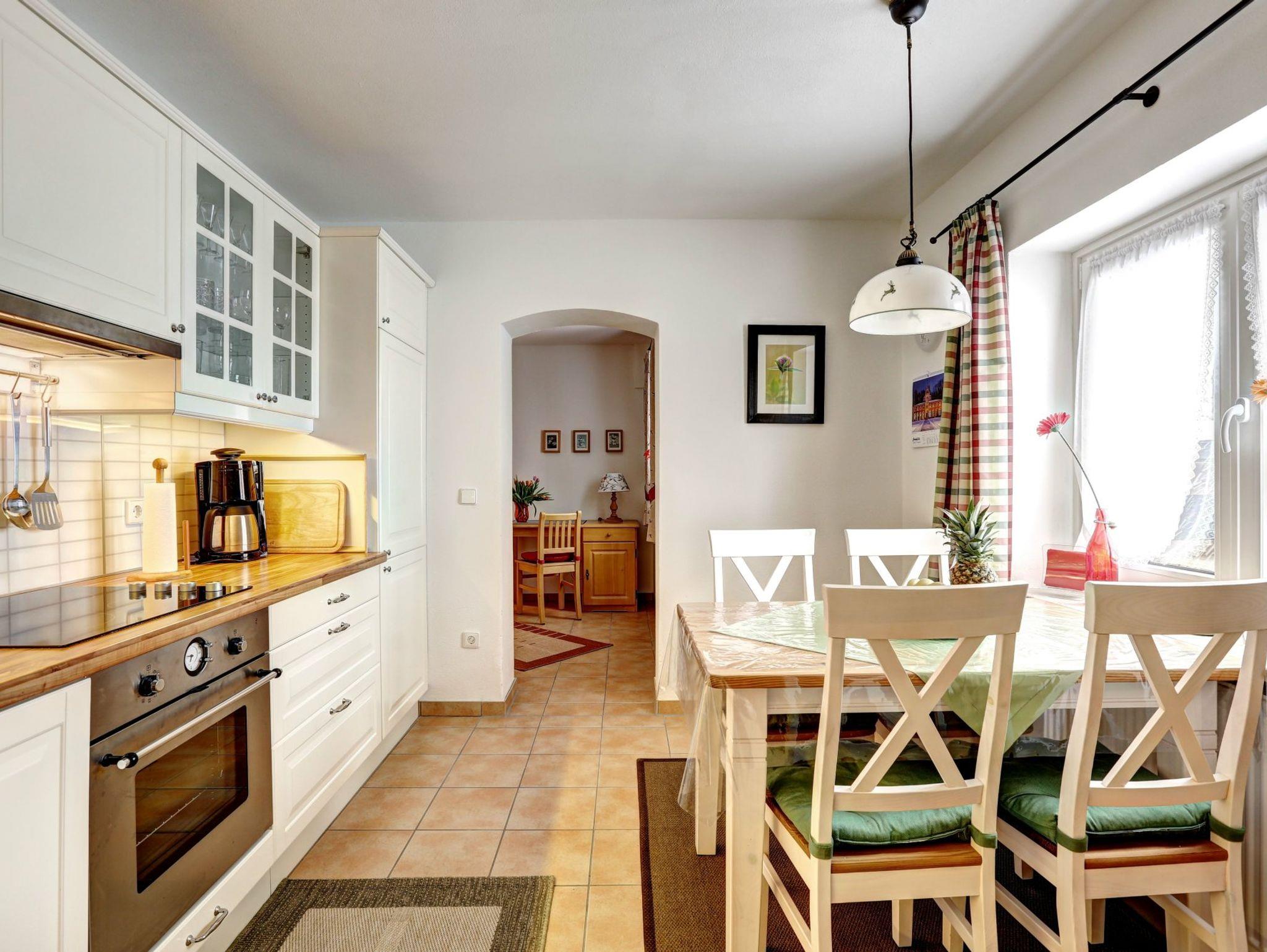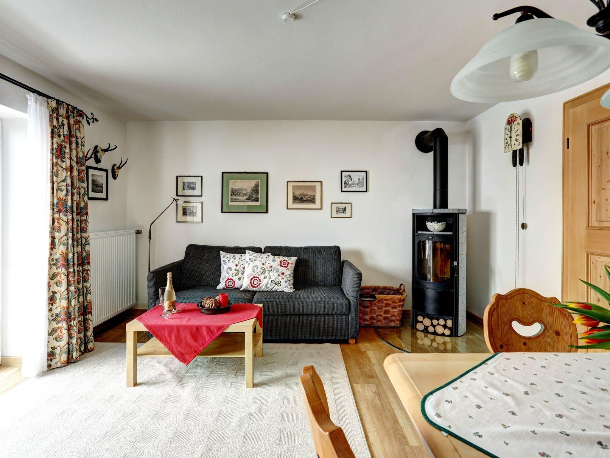 Die Ferienwohnung besteht aus einem Wohn-Schlafzimmer mit Eckbank, Schlafcouch, Flachbild-TV sowie Holzofen einer Wohnküche mit Esstisch inkl. 4 Stühlen und Einbauküche