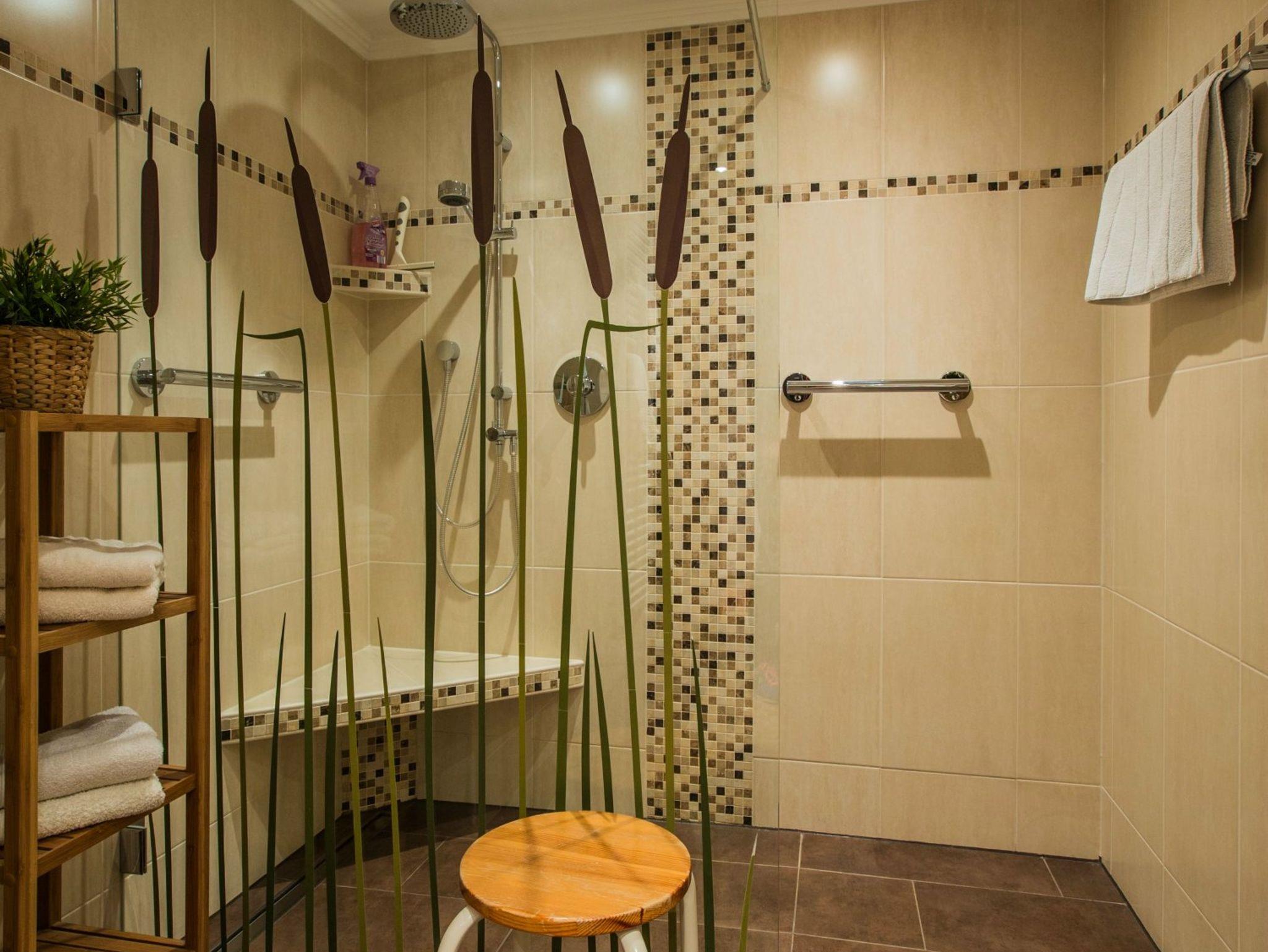 einem separatem Schlafzimmer mit Doppelbett (2 m) sowie Schlafcouch für 1 Person einem Bad mit WC, behindertengerechten Dusche sowie Waschbecken und Fußbodenheizung,