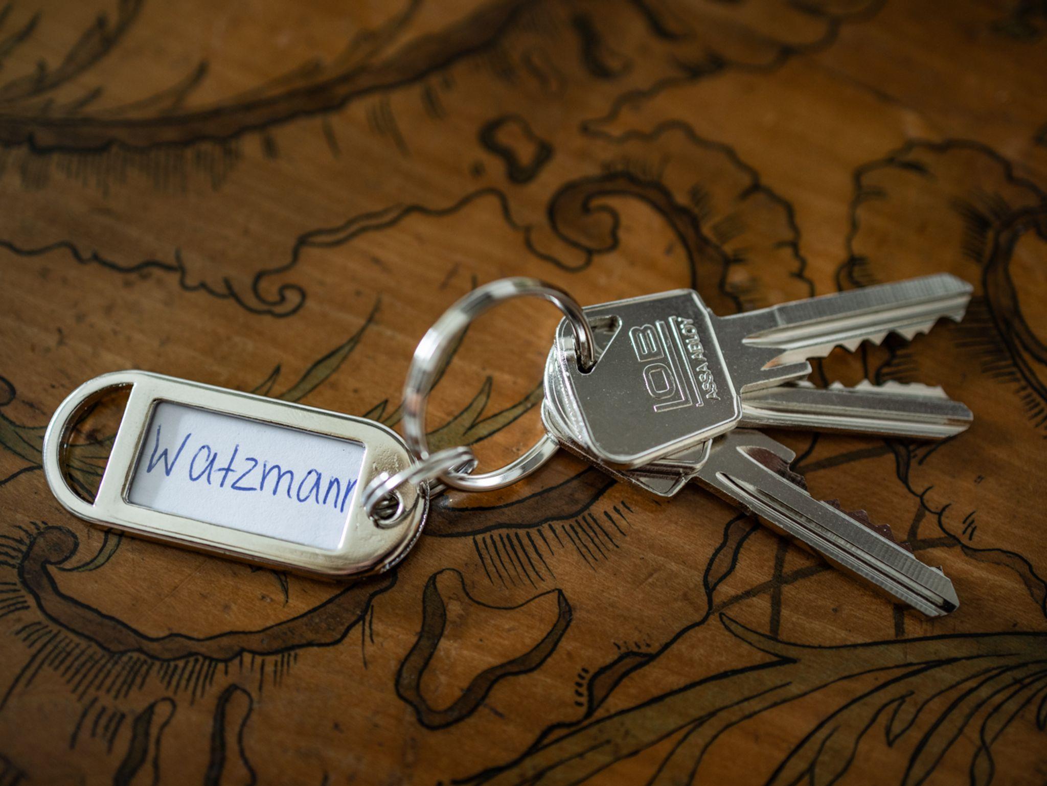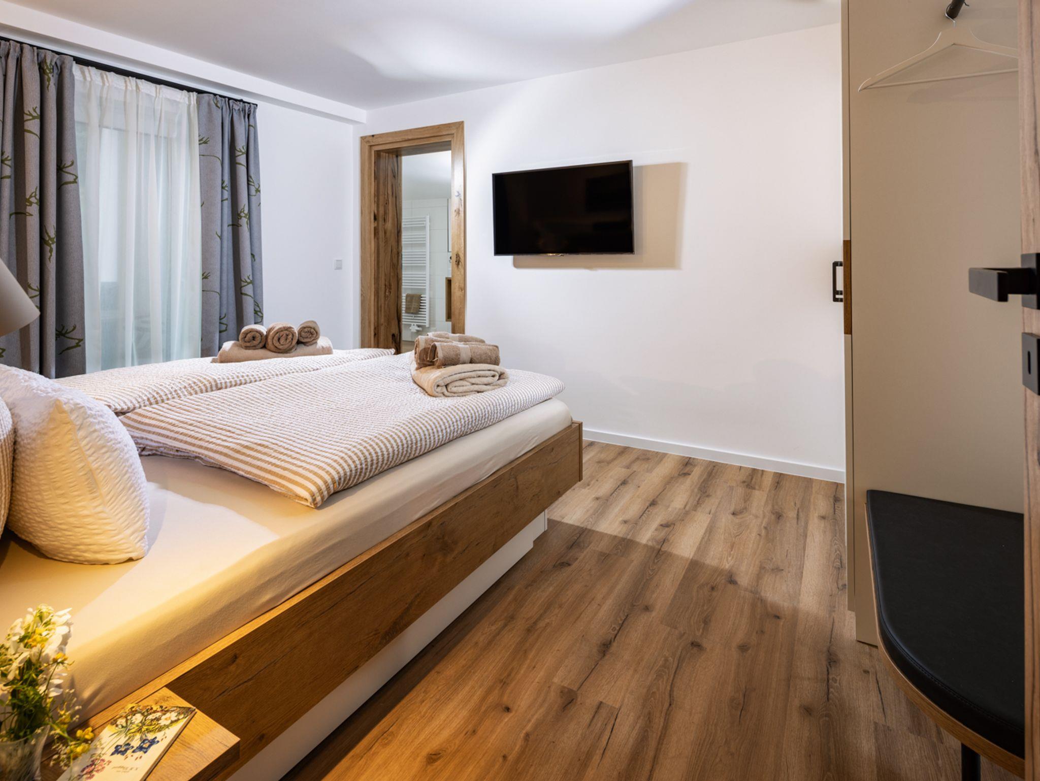 Die Wohnung „Watzmann“ besteht aus einem Schlafzimmer, kombiniertem Wohn-/ Essbereich, geräumigem Badezimmer mit großer Dusche und hat einen umlaufenden Balkon. Sie befindet sich im ersten Obergeschoss des Haupthauses mit Platz für bis zu vier Personen.