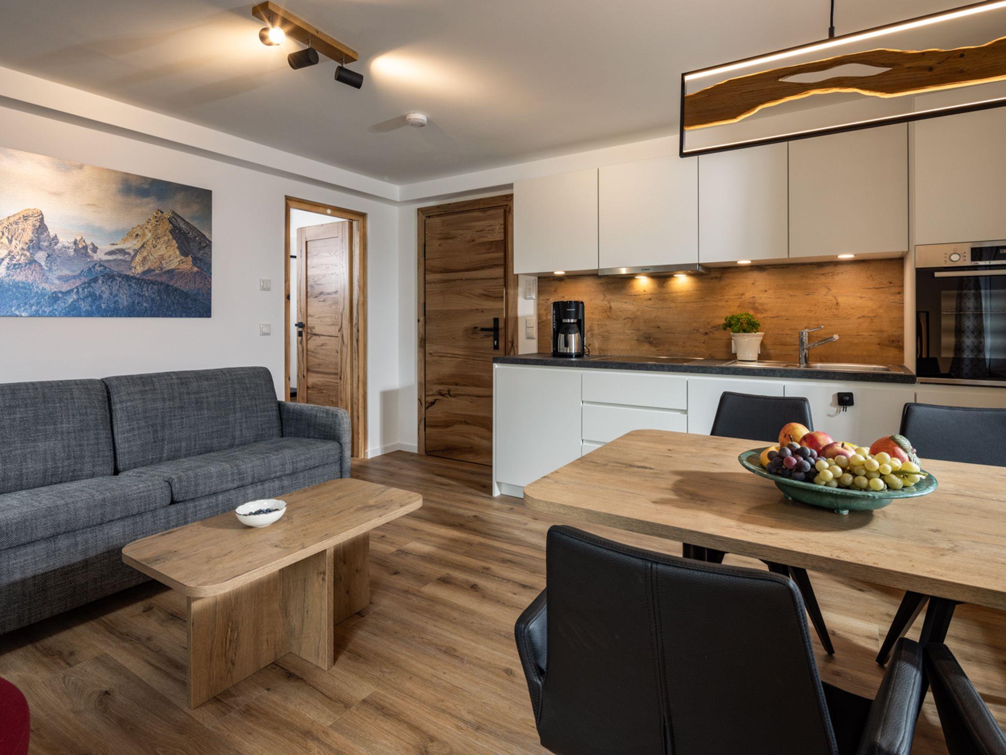 Die vollausgestattete Einbauküche verfügt über Marken-Elektrogeräte inklusive Spülmaschine, Induktionskochfeld und Backofen. Ein großer Esstisch mit vier Armlehnstühlen lädt zum Verweilen ein. Sowohl vom Wohnbereich als auch vom Schlafzimmer aus gibt es einen direkten Zugang auf den Richtung Süden und Westen ausgerichteten überdachten Balkon mit gemütlicher Sitz- und Essecke. Von diesem haben Sie einen unverbauten atemberaubenden Blick auf das beeindruckende Panorama der Berchtesgadener Alpen und den majestätischen Watzmann.