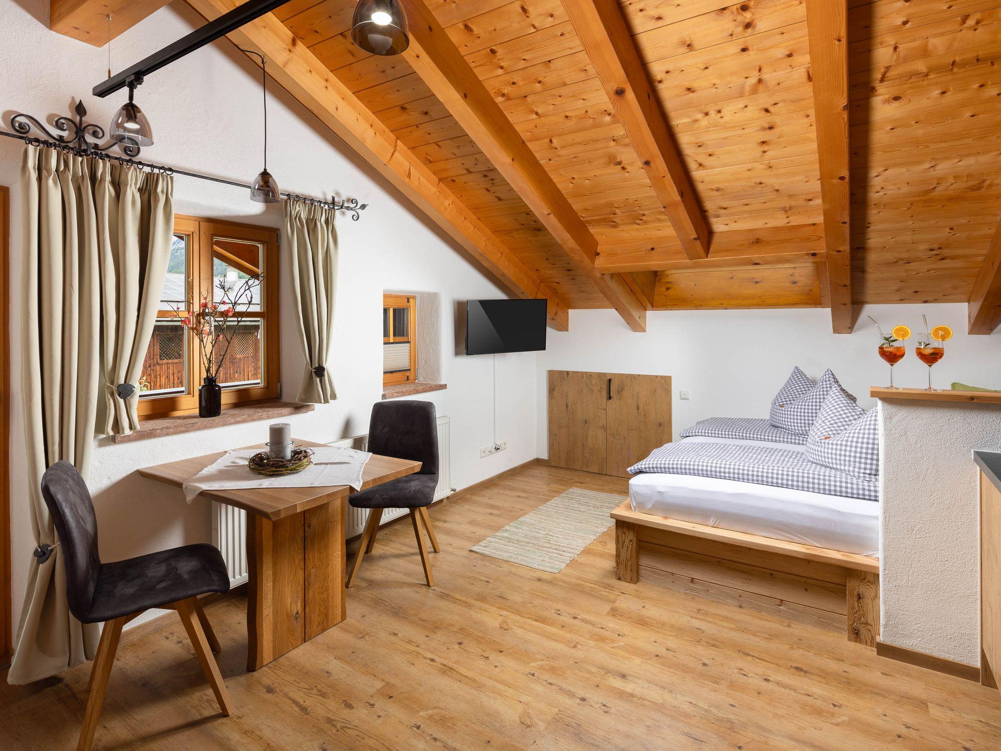 Die Wohnung Schwalbennest (22m²) ist Wohn-/Schlafraum mit vollausgestatteter Küchenzeile. Kuscheliges Doppelbett in Wohlfühl-Zirbenholzausstattung; separater großzügiger Balkon mit Abendsonne; Badezimmer mit ebenerdiger Dusche/WC