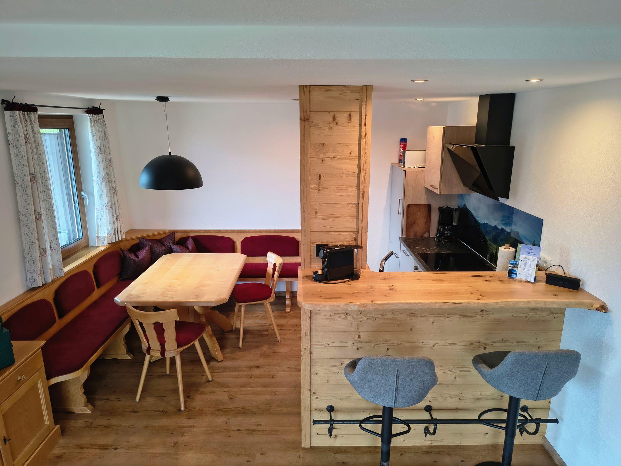 In dem offenen Wonbereich befindet sich ein großes Panoramafenster, welches einen atemberaubenden Blick auf die Berchtesgadener Alpen bietet. Ebenso finden Sie in dem Wohnbereich gemütliche Sitzmöglichkeiten, im Essbereich mit Eckbank und ein Tresen mit zwei Barhockern gegenüber der Küche.