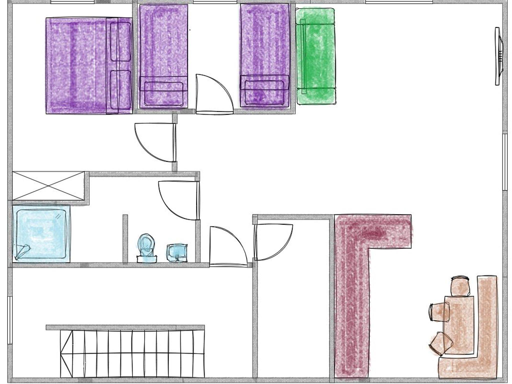 Das zweite Schlafzimmer ist mit drei vollwertigen Betten ausgestattet, davon zwei als Stockbett.