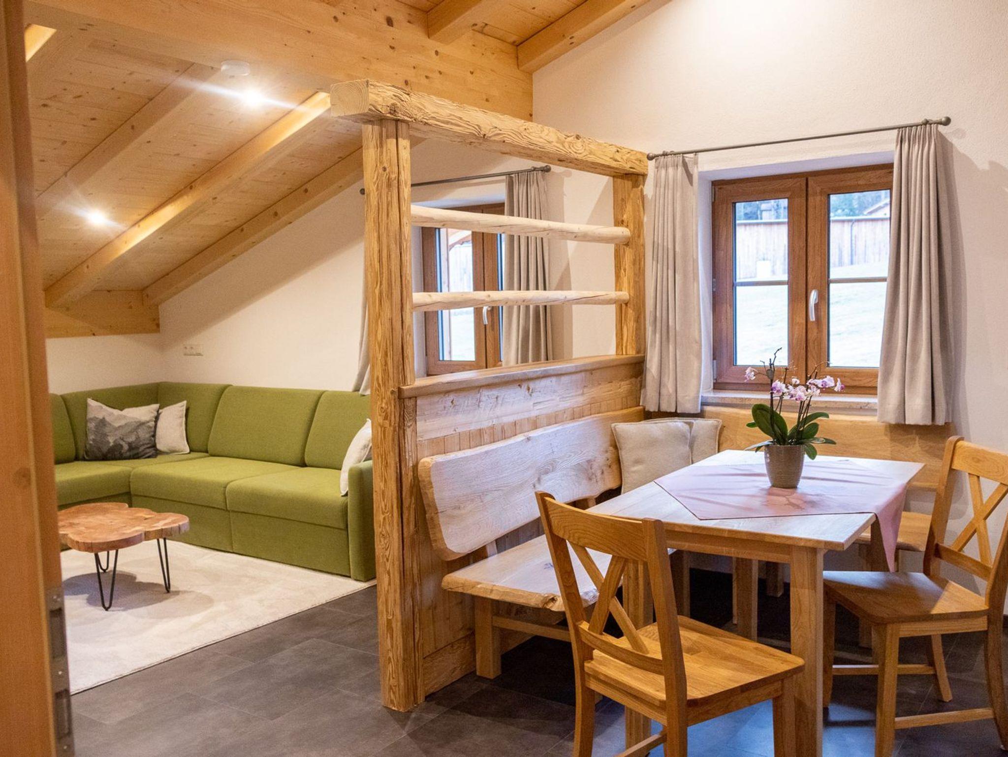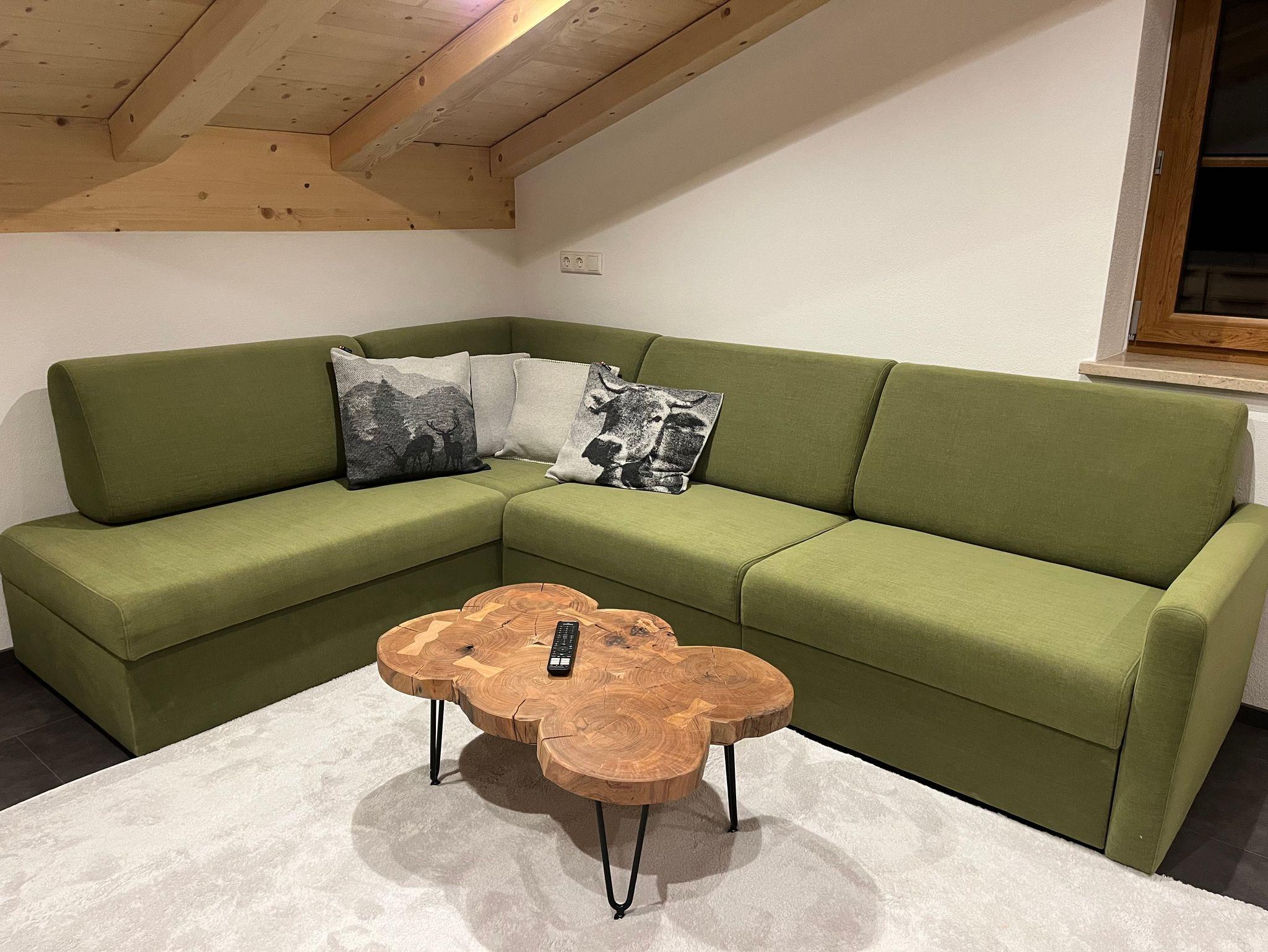 1 Wohnküche mit ausziehbarer Couch und gemütlicher handgefertigter Eckbank