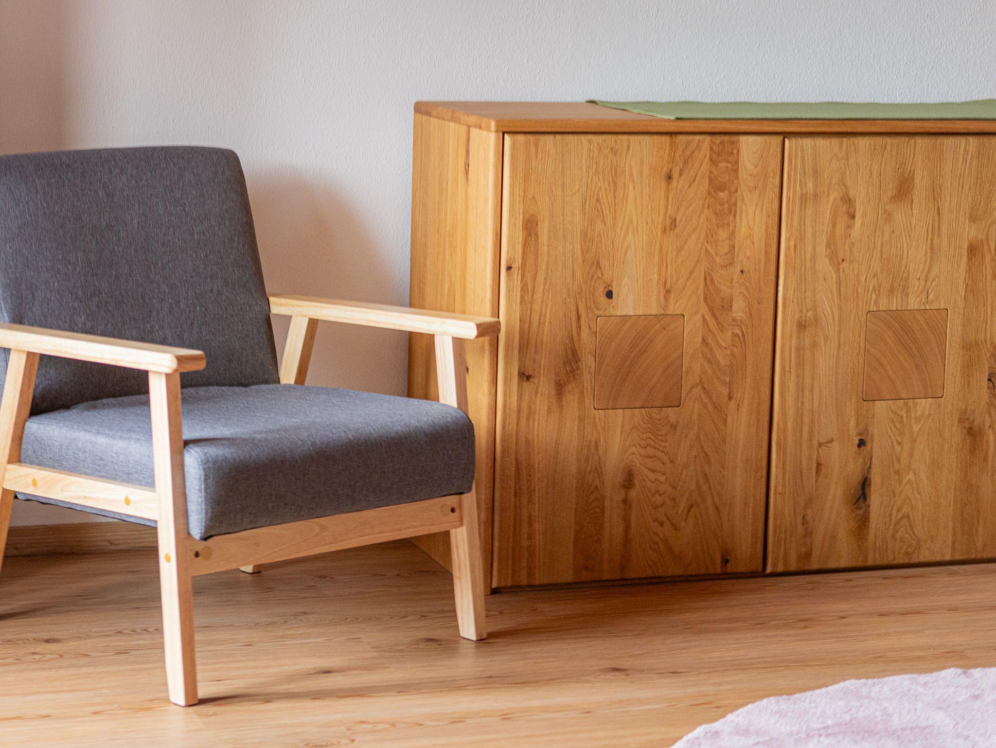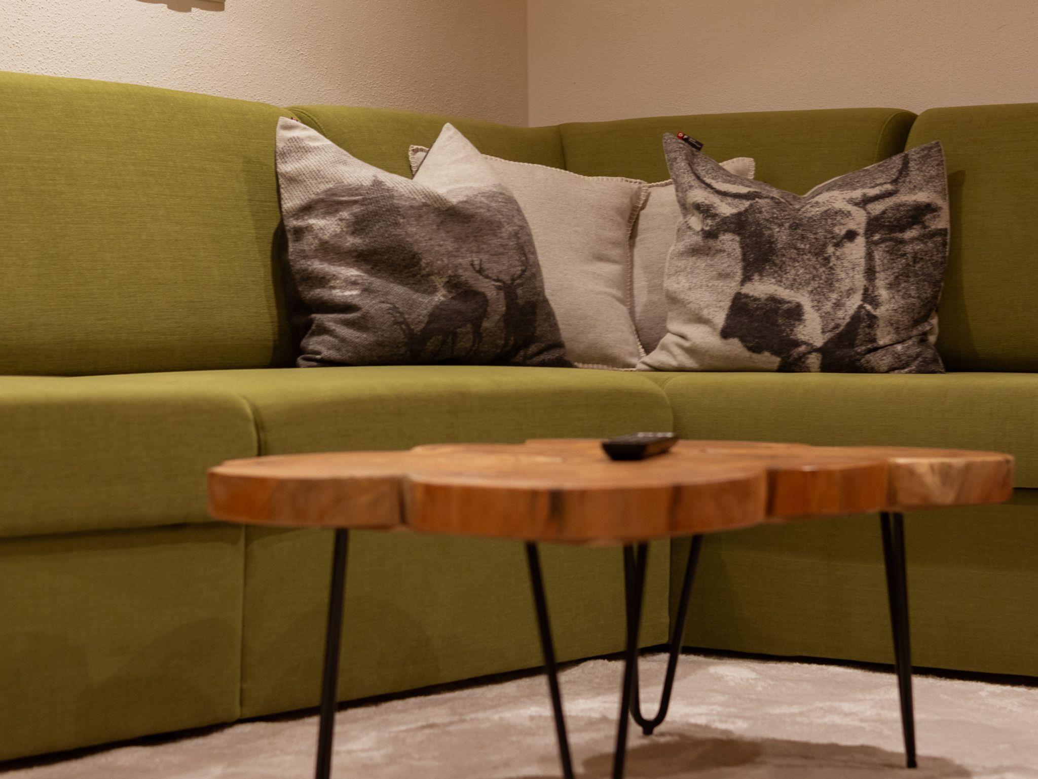 1 Wohnküche mit ausziehbarer Couch und gemütlicher handgefertigter Eckbank