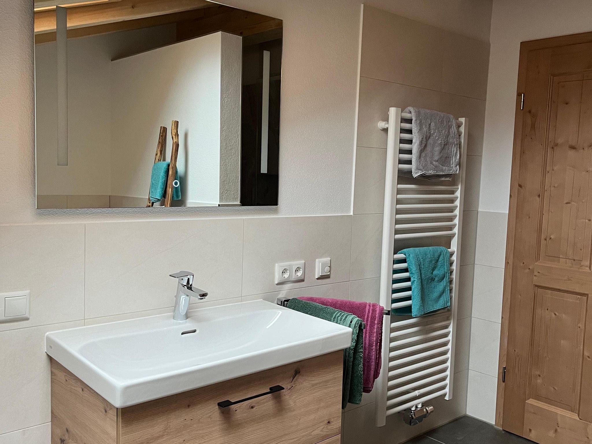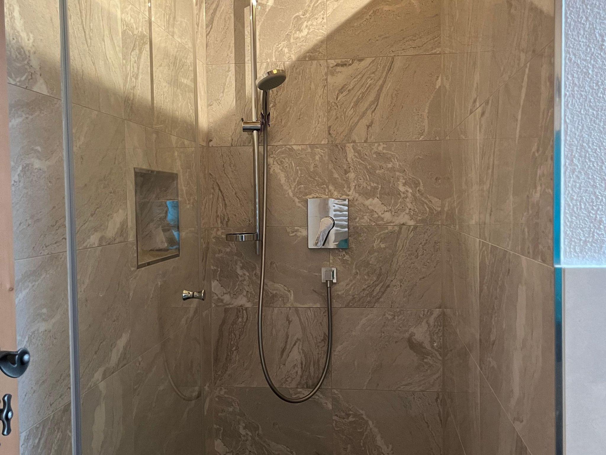 Badezimmer mit Badewanne, ebenerdige Dusche und Fön
