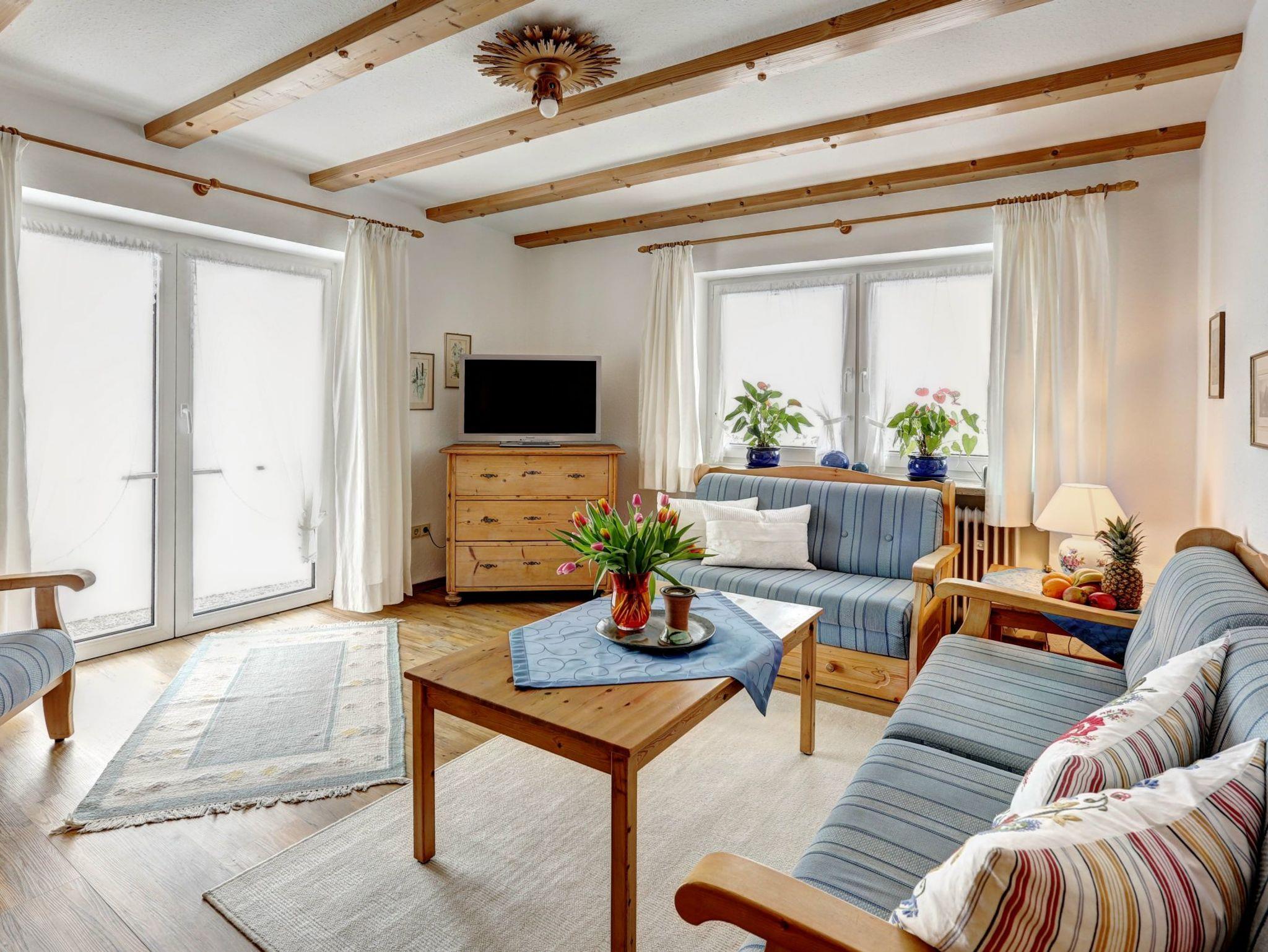 Unsere Ferienwohnung Watzmann mit 54 m² Wohnfläche befindet sich im Erdgeschoß unseres Hauses.Die gemütliche Wohnung bietet Platz für 2 bis 4 Personen.Die Ferienwohnung besteht aus einem Wohn-Schlafzimmer mit Sitzgruppe (Schlafcouch) und Flachbild-TV, einer Wohnküche mit Essecke und Einbauküche inkl. Spülmaschine, einem separaten Schlafzimmer mit Doppelbett (2 m), einem Bad mit Dusche und Waschbecken, einem separaten WC und einer Terrasse mit Gartenmöbel.