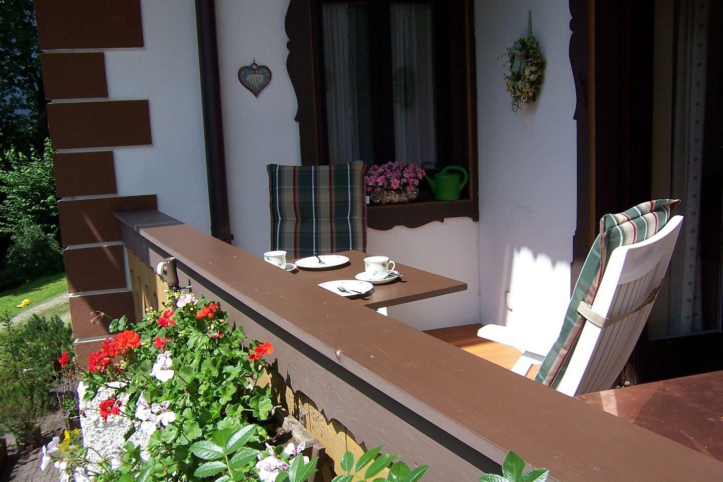 Die Nichtraucher Ferienwohnung mit Balkon befindet sich im 1. Obergeschoss des Hauses. Sie bietet auf 45qm ein gemütliches Wohnzimmer mit offener Küche und einem Essbereich im Erker, ein Schlafzimmer mit französischem Doppelbett (140cm breit) und einem Einzelbett sowie ein Bad mit Dusche und WC. Vom sonnigen Balkon genießen Sie einen herrlichen Bergblick.