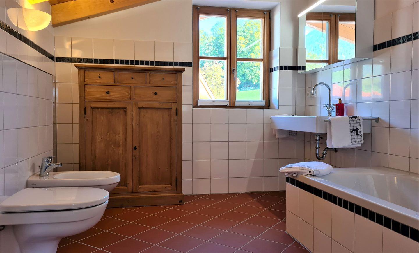 Für Ihre Wohlfühlmomente sorgt das Badezimmer mit Badewanne, ein weiteres Badezimmer mit Dusche, sowie ein zusätzliches Gäste-WC. Handtücher und Bettwäsche sind vorhanden.