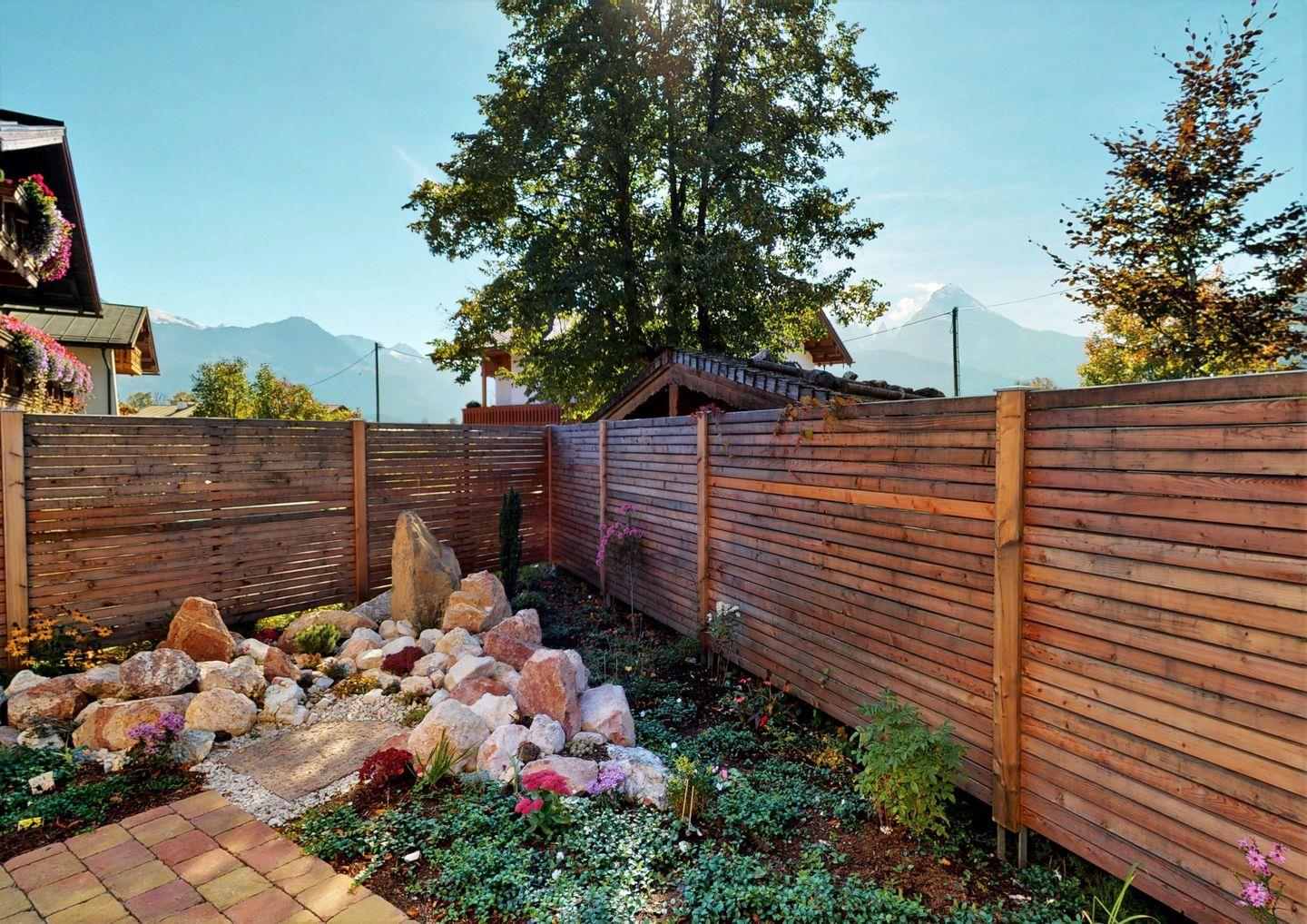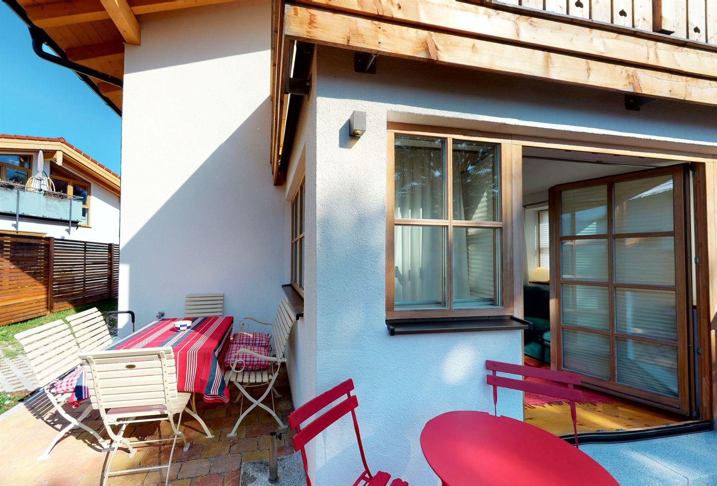 Das Ferienhaus Schneewittchen überzeugt auch durch seine Außenanlagen: die Terrasse mit Gartenmöbeln und Sonnenliegen lädt dazu ein, die frische Bergluft zu genießen und die Aussicht auf die umliegenden Berge zu bewundern. Kinder sind herzlich willkommen und können im abgeschlossenen Garten spielen, während Sie sich entspannen.