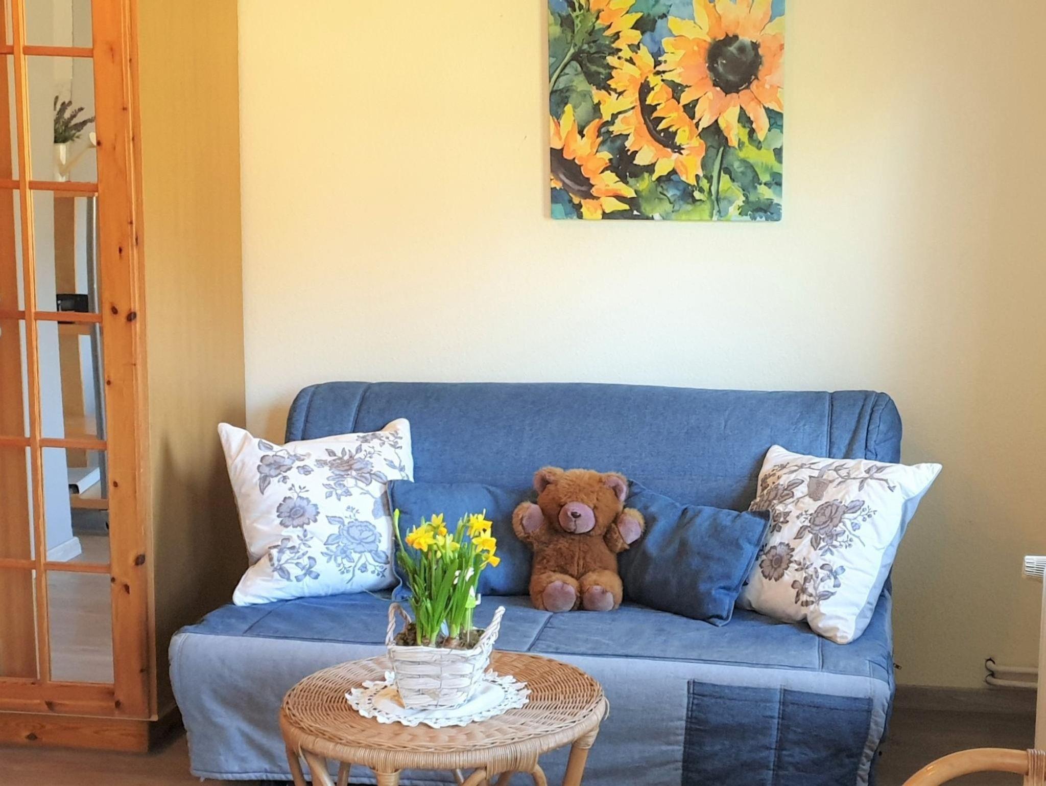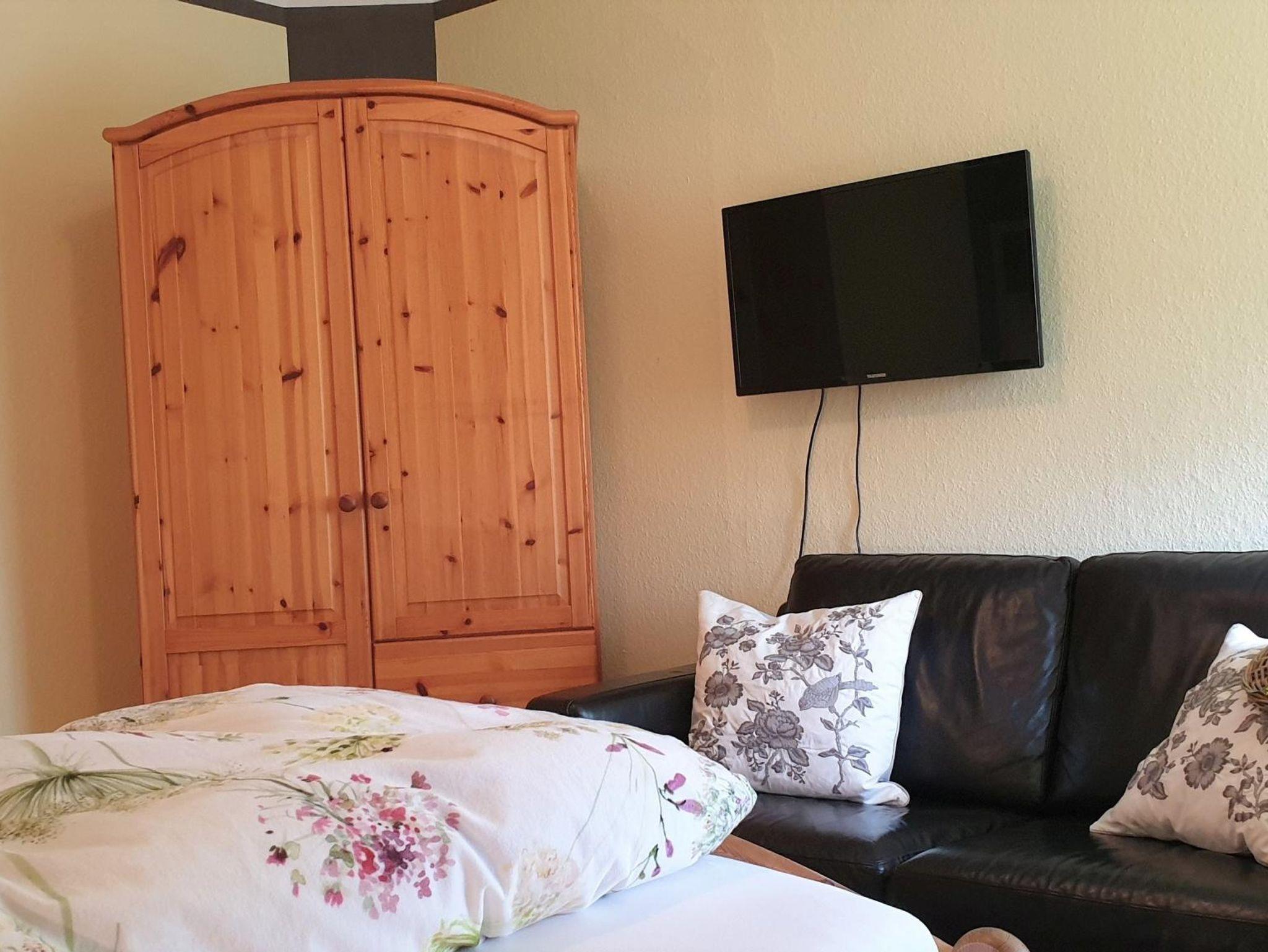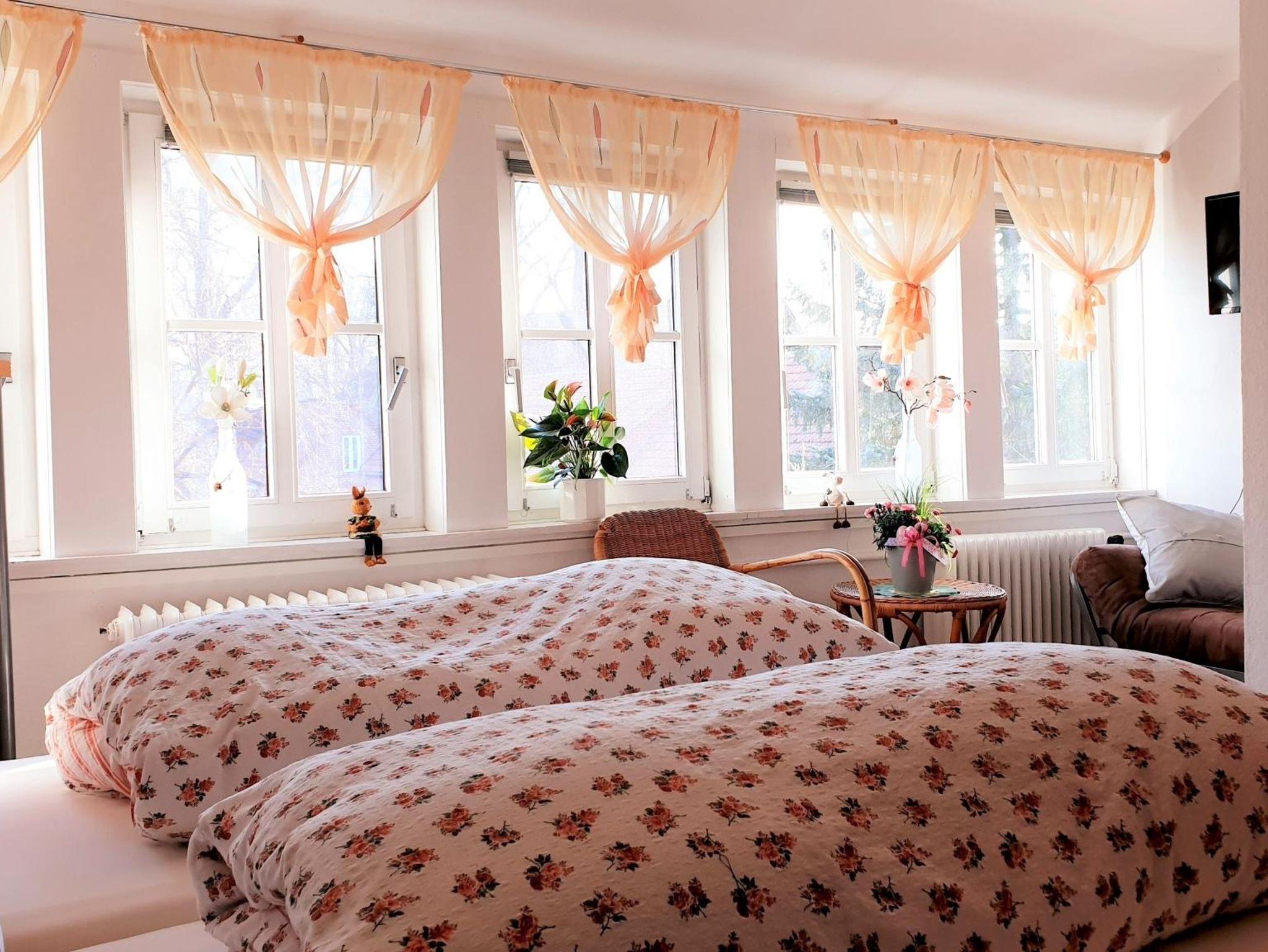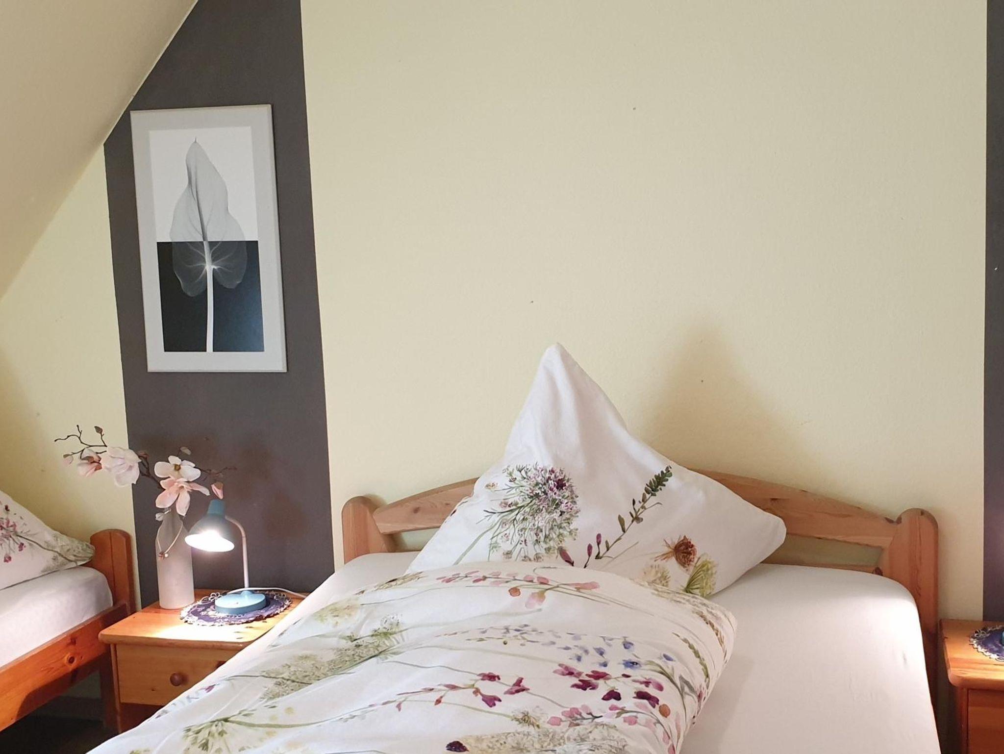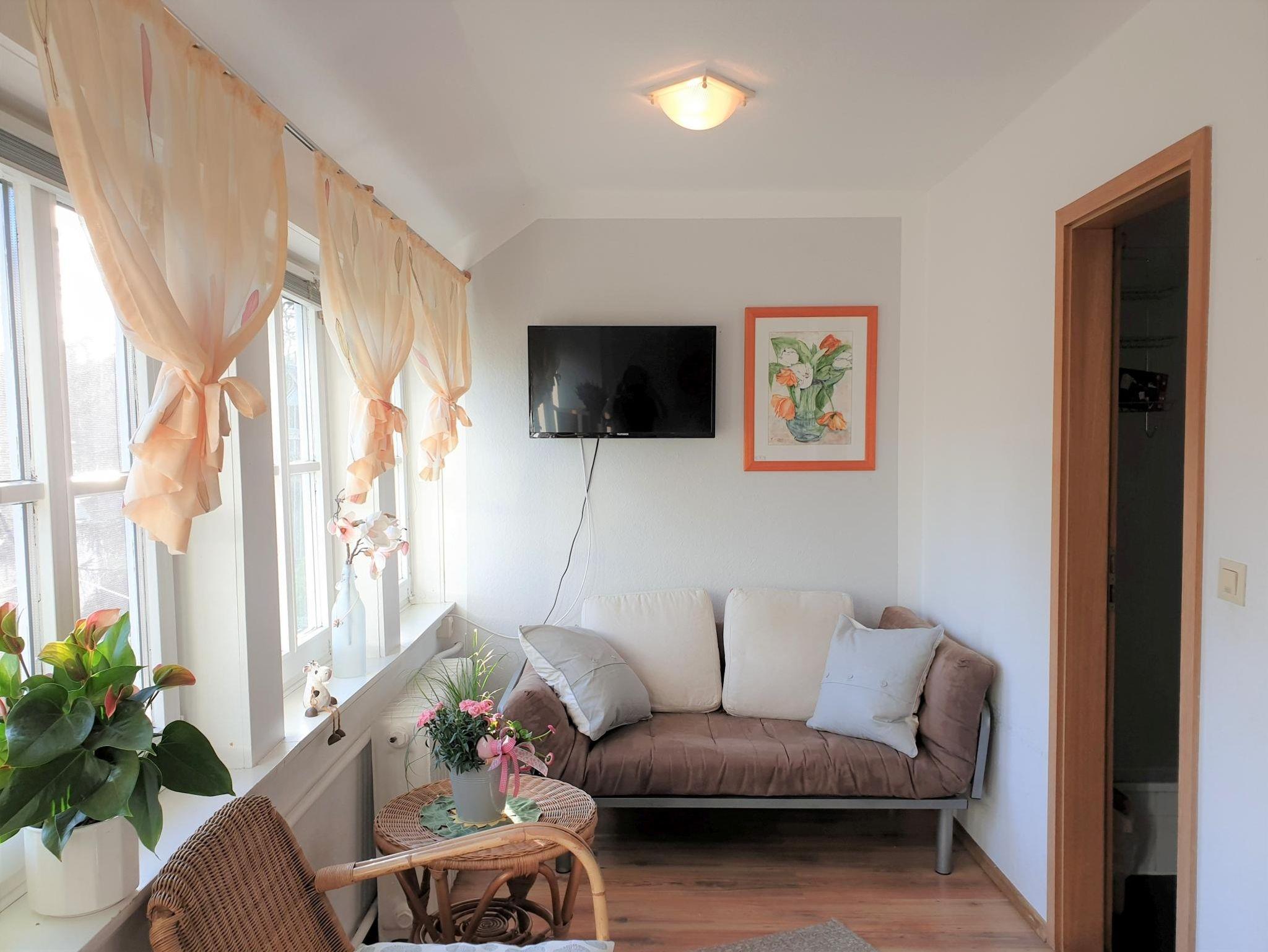 Ferienwohnung im OG des Gästehauses für 4 bis max. 6 Personen. 2 Schlafzimmer, Wohnküche mit ausgestatteter Küchenzeile und 3xDu/WC. Die Schlafzimmer sind mit insges. 5 Betten (2xDoppelbett, ein Einzelbett) und jeweils mit Sitzecke ausgestattet. Wohnküche mit ausgestatteter Küchenzeile und Schlafsofa für weitere Personen. In jedem Raum befinden sich TV, Radio/CD und kostenloses WLAN. Der Garten vor dem Gästehaus lädt zum Entspannen und zu gemütlichen Stunden ein.