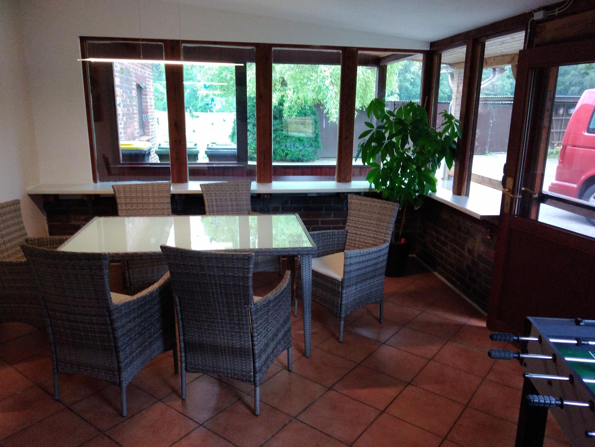 Als zusätzlicher Aufenthaltsraum steht ein Wintergarten mit Sitzecke, Dartscheibe und Kicker zur Verfügung.