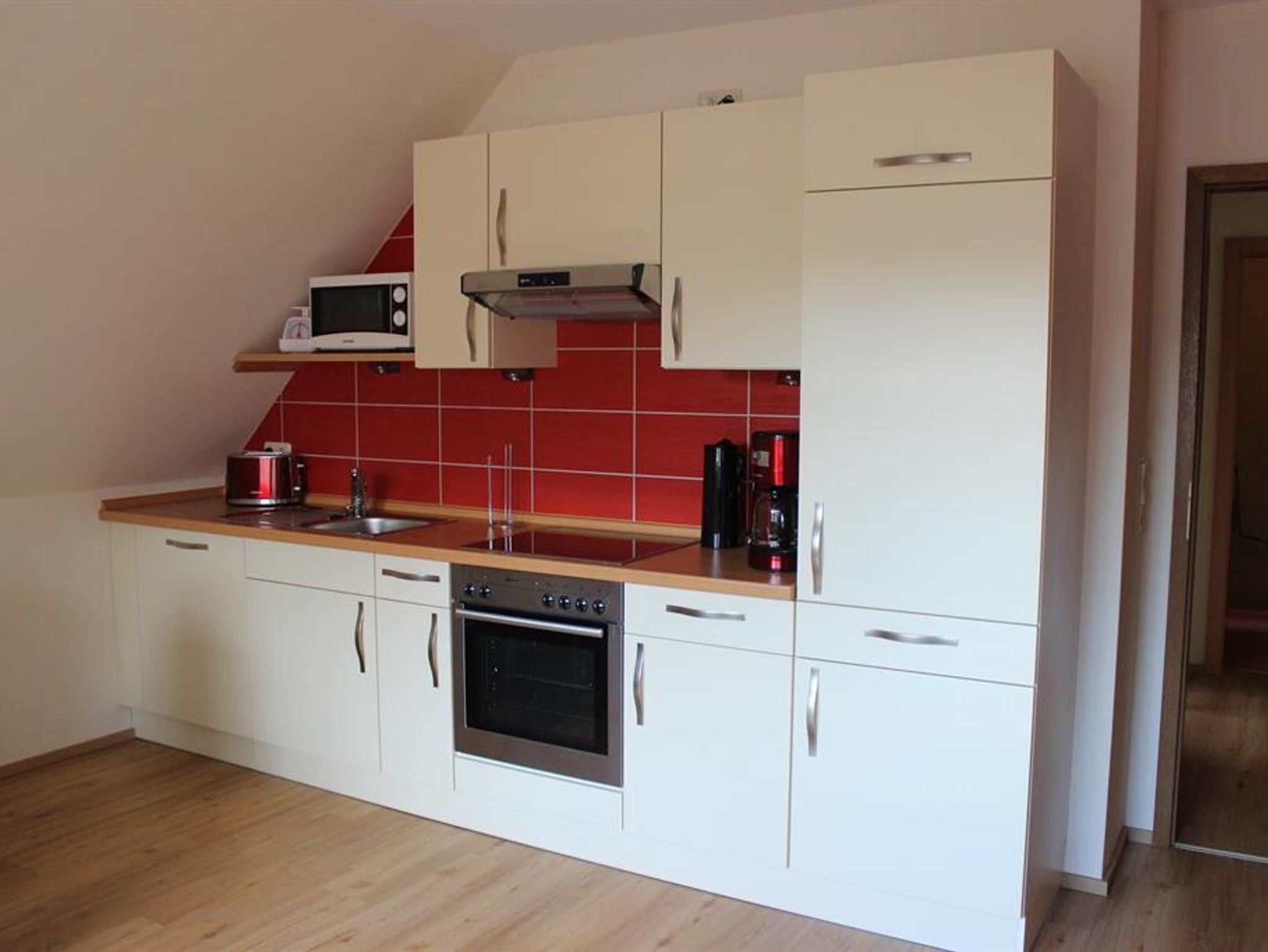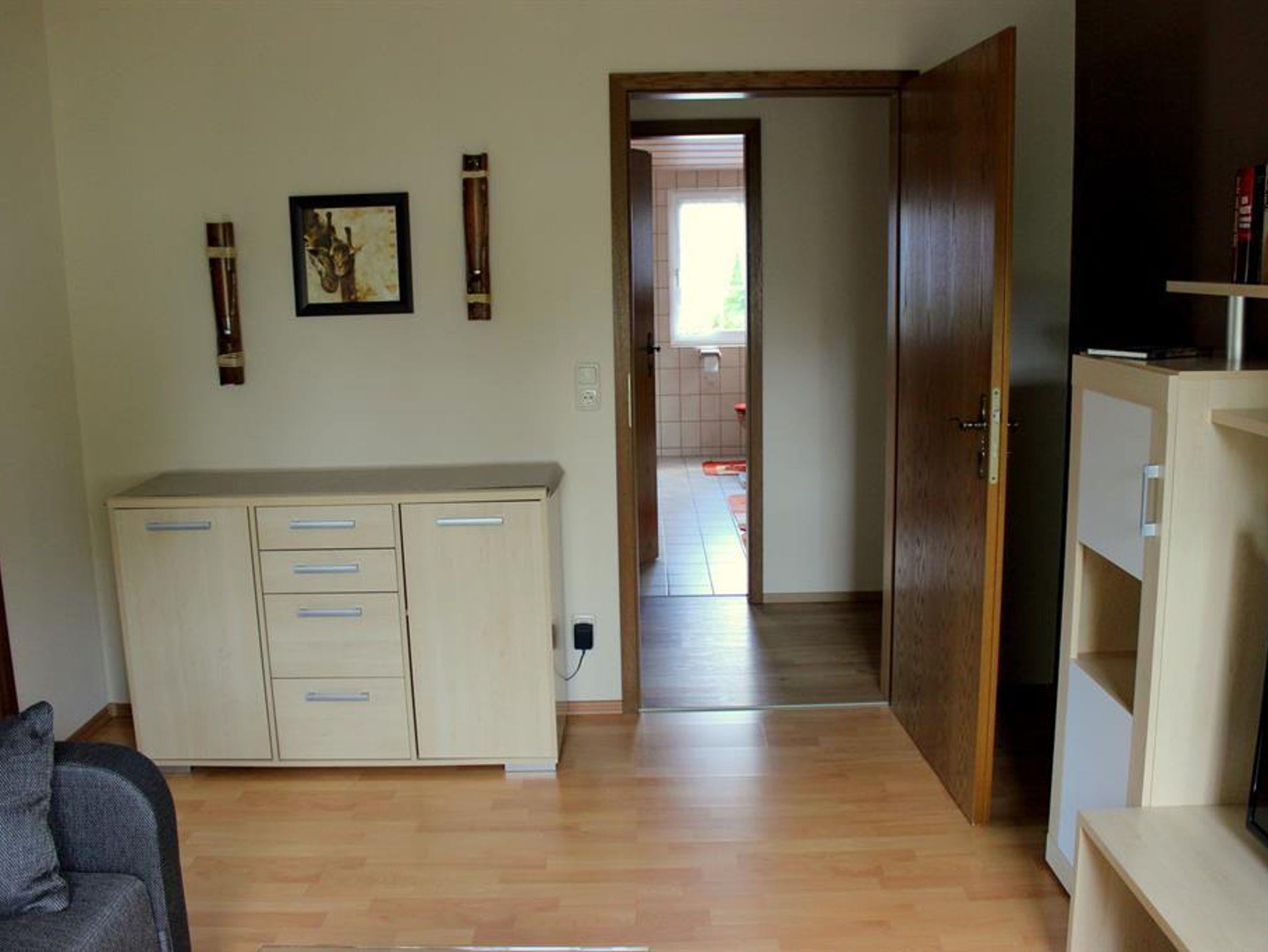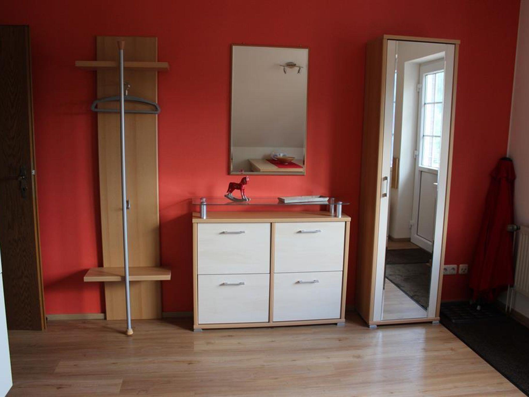 Die Ferienwohnung befindet sich im 1. Stock eines Einfamilienhauses. Zugang von Außen über eine separate Treppe an deren Ende ein Balkon von einer Größe von 2,5 x 3 Meter anschließt. Von dort ist die Wohnung zu betreten. Oben an der Treppe kann ein Türgitter angebracht werden. Im Eingangsbereich befindet sich eine Garderobe, eine Küchenzeile und eine Essecke. Ausserdem sind noch ein Wohnzimmer und ein Schlafzimmer vorhanden. Im Bad gibt es 2 Waschbecken, Toilette, Dusche und Badewanne. Haustiere sind nicht erlaubt. Es handelt sich um eine Nichtraucherwohnung.