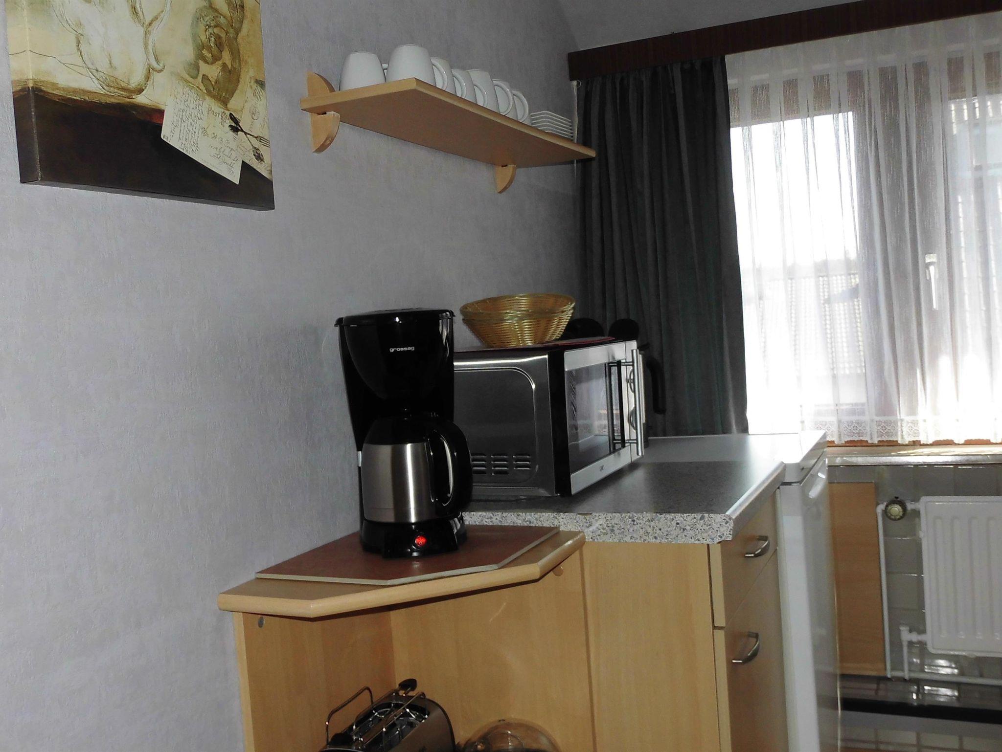 Komplett ausgestattete Küche mit Mikrowelle, Toaster, Kaffeemaschine, Wasser- und Eierkocher, Elektroherd und Backofen