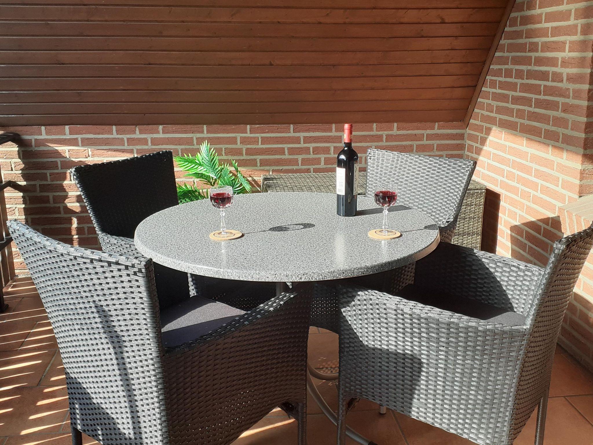 1 Wohnzimmer mit Ausgang zur geräumigen Loggia (Hollywoodschaukel und Gartenmöbel), Kabel-TV und DVD-Player