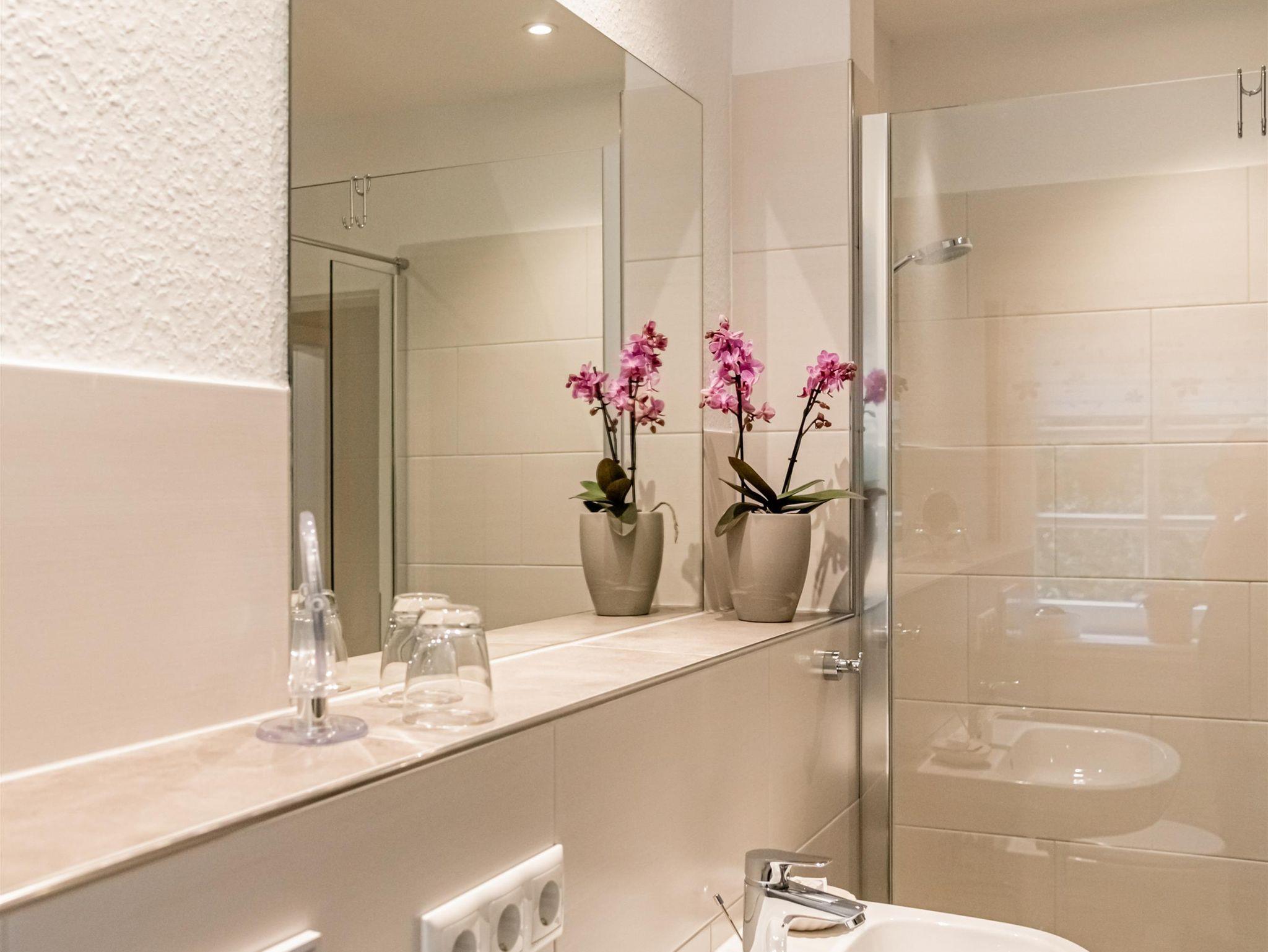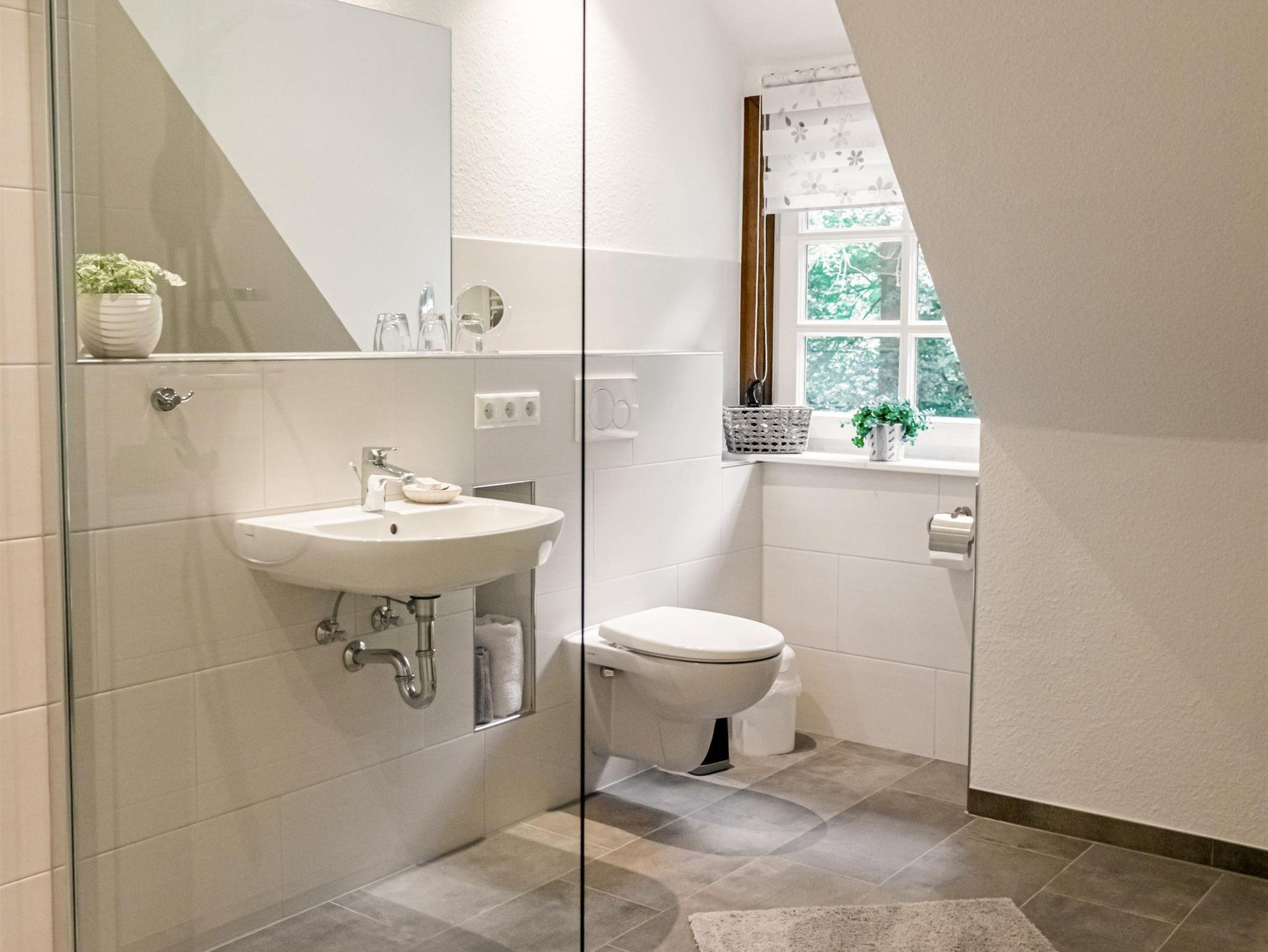 • modern ausgestattetes Bad mit Dusche, WC, Fußbodenheizung