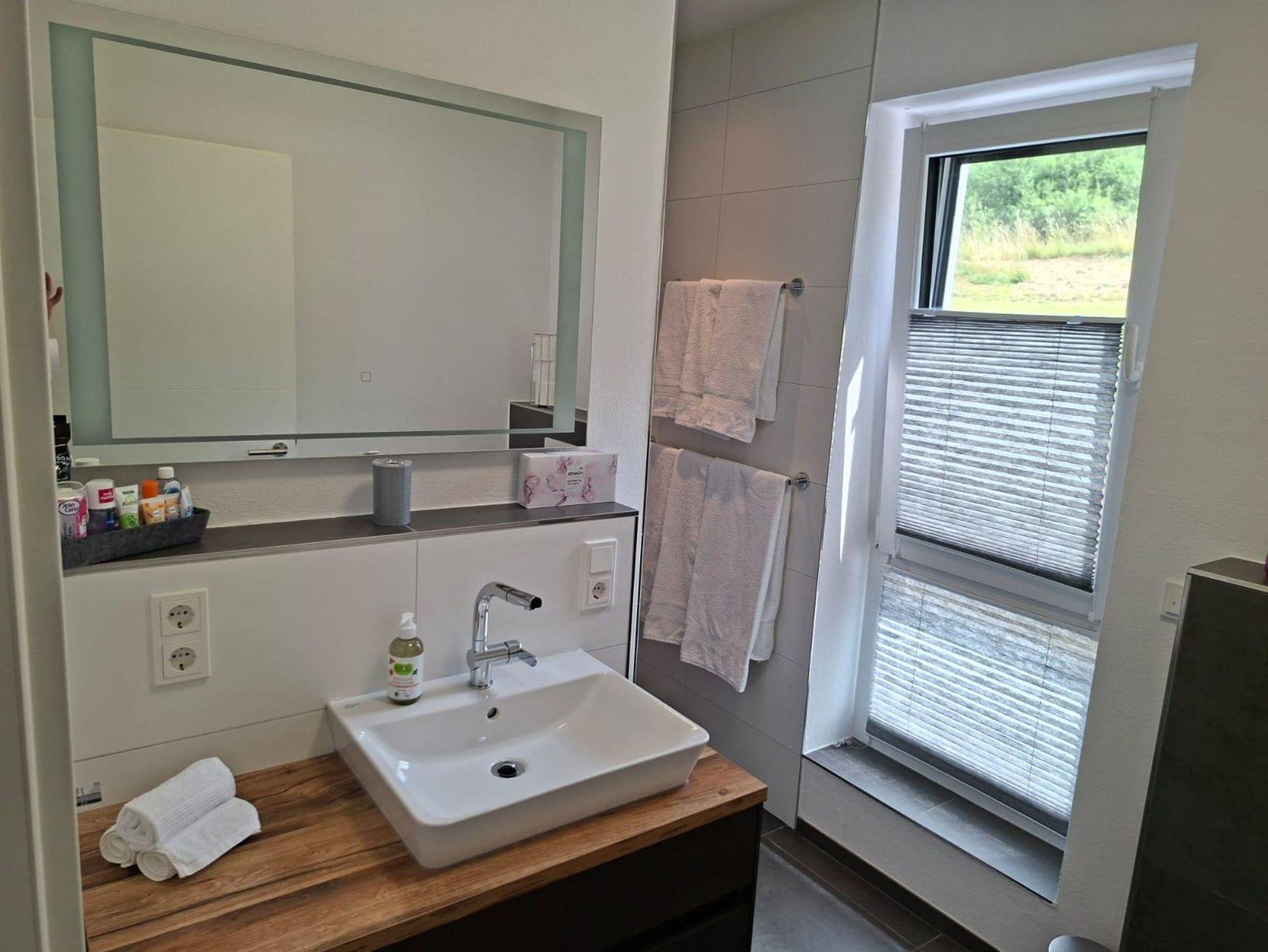 Das moderne Badezimmer ist mit einer Dusche, einem Waschbecken und WC ausgestattet. Es bietet Ihnen alle Annehmlichkeiten, die Sie für Ihren Aufenthalt benötigen, ist hell und freundlich gestaltet.