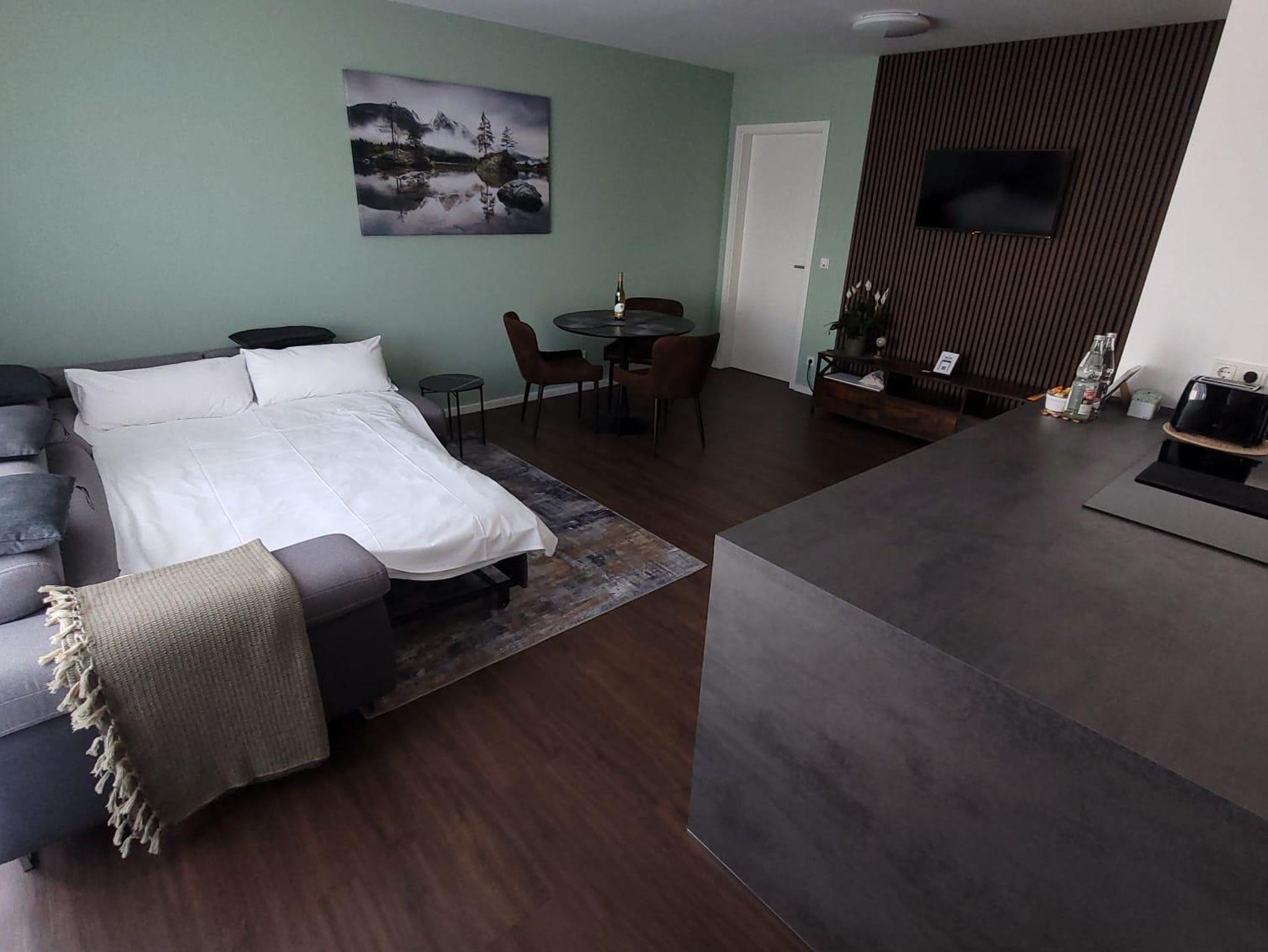 Das Herzstück der Wohnung ist das gemütliche Wohnzimmer, das mit einer bequemen Couch und einem Flachbildfernseher ausgestattet ist. Hier können Sie entspannen, ein gutes Buch lesen oder einen Filmabend genießen.