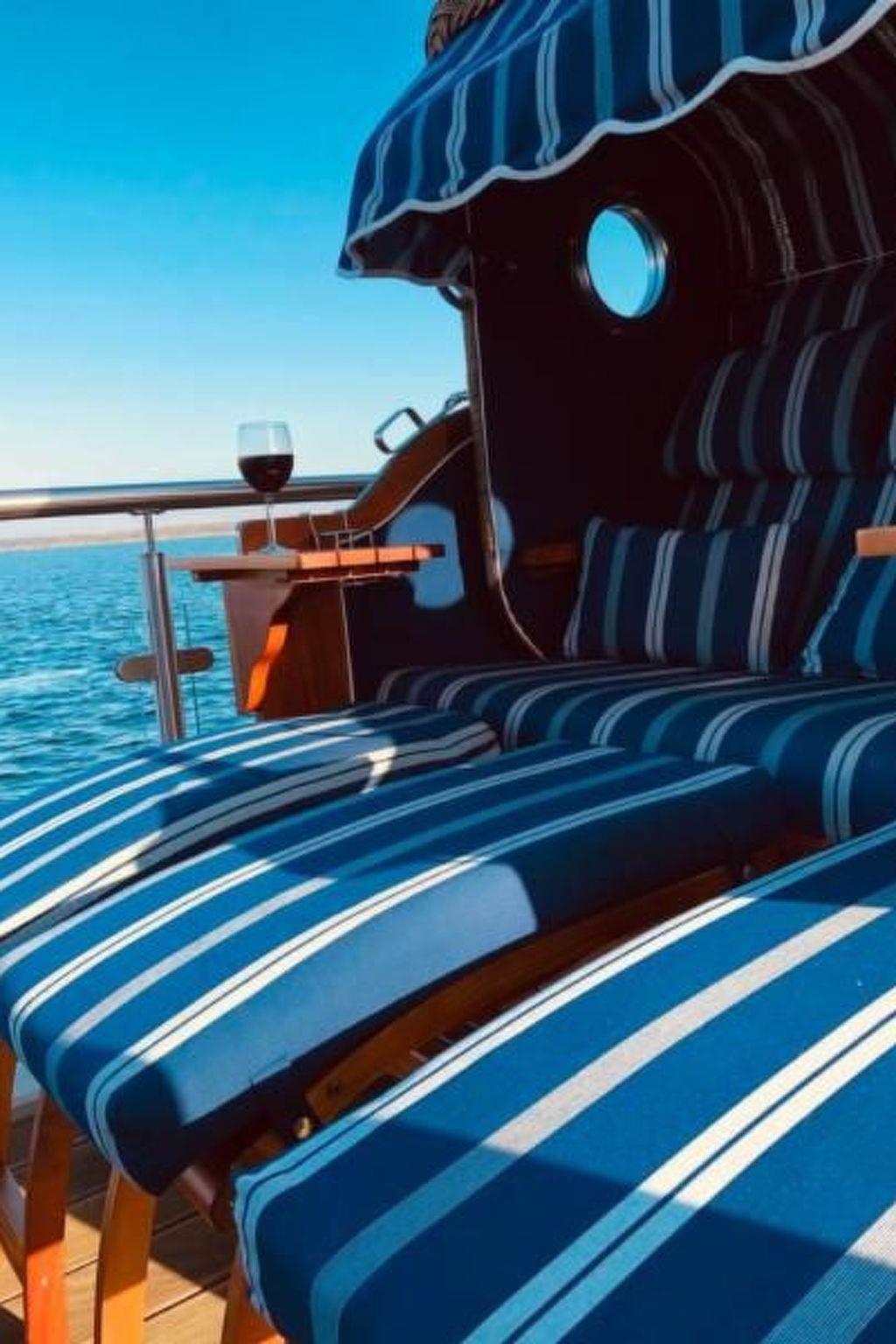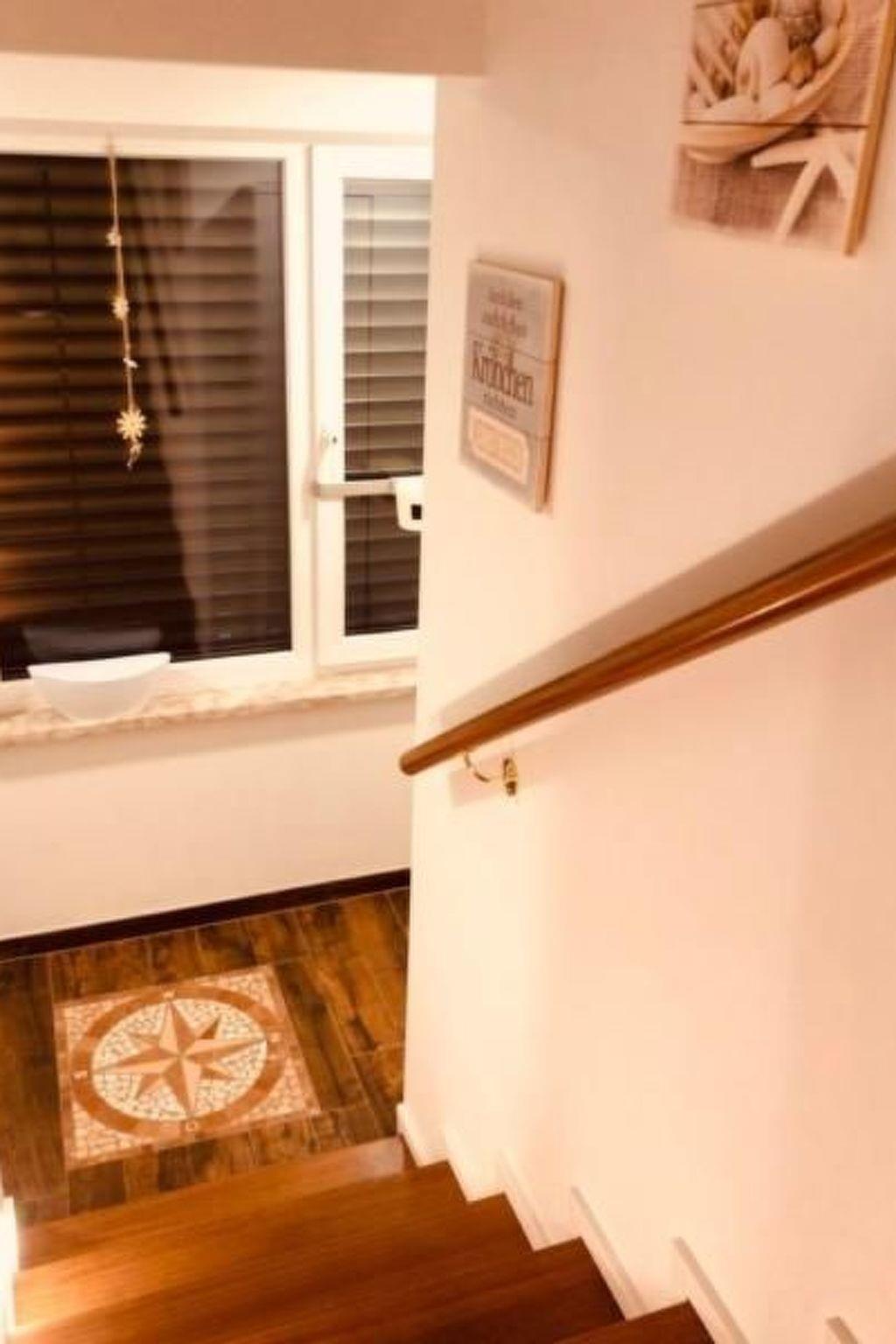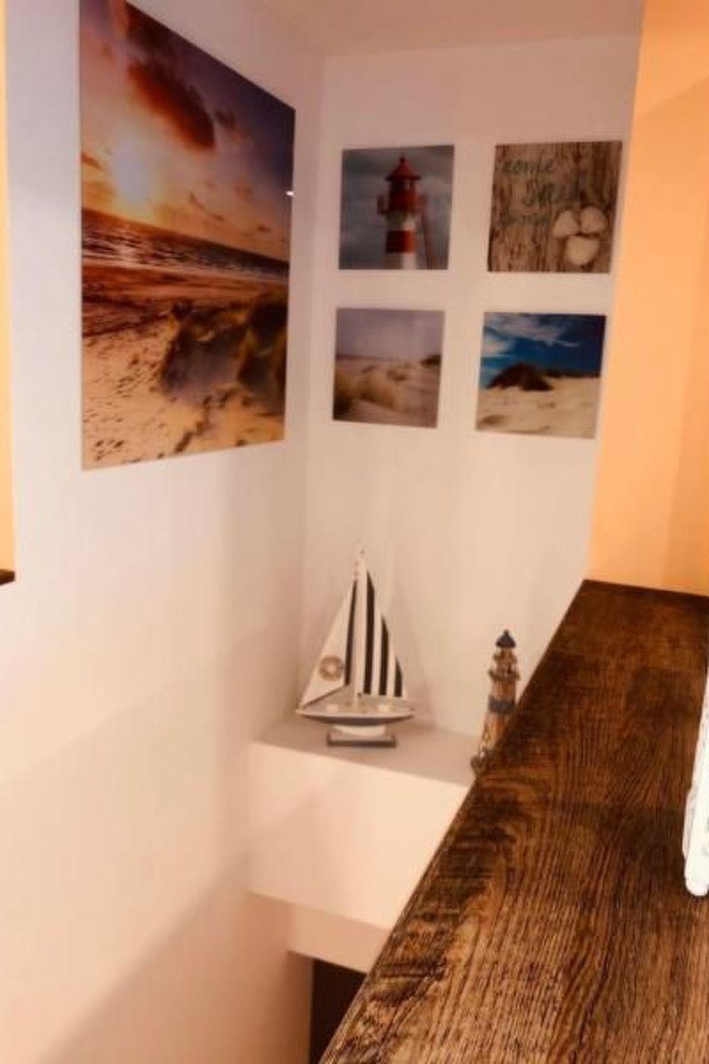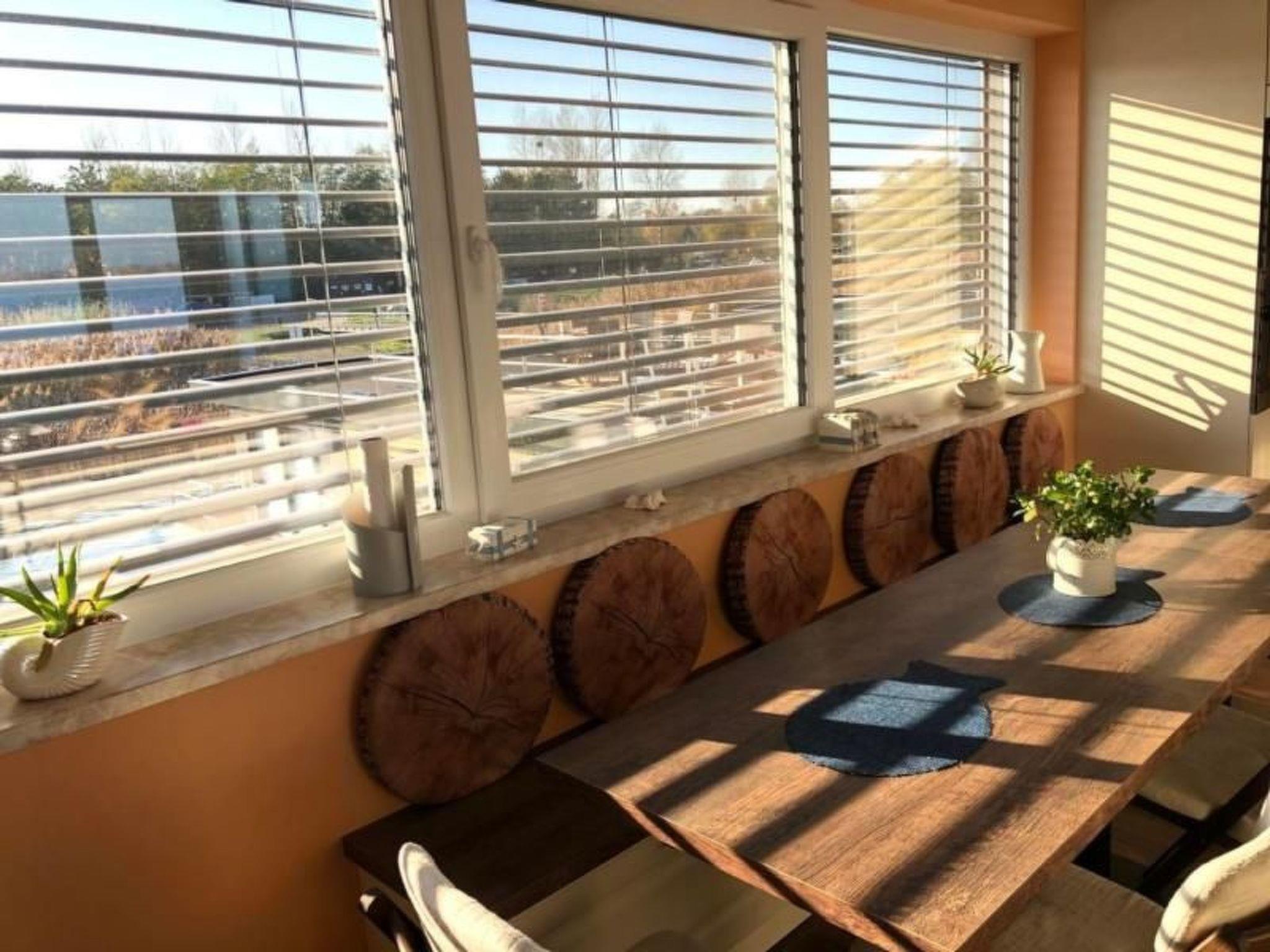 The spacious living room on the first floor offers a full 180-degree panoramic view of Lake Goitzsche. Stylish modern sofas & furniture with a maritime captain's flair offer comfortable space for 6 people. The corner fireplace provides a cosy feeling of peace and relaxation, especially in the cooler seasons. Of course there is also a large flatscreen TV, which is cleverly hidden in a cupboard and can be pulled out by remote control. The whole house has Wi-Fi coverage and every room has a LAN socket for free internet. The outside staircase leads to the sun deck on the roof.
