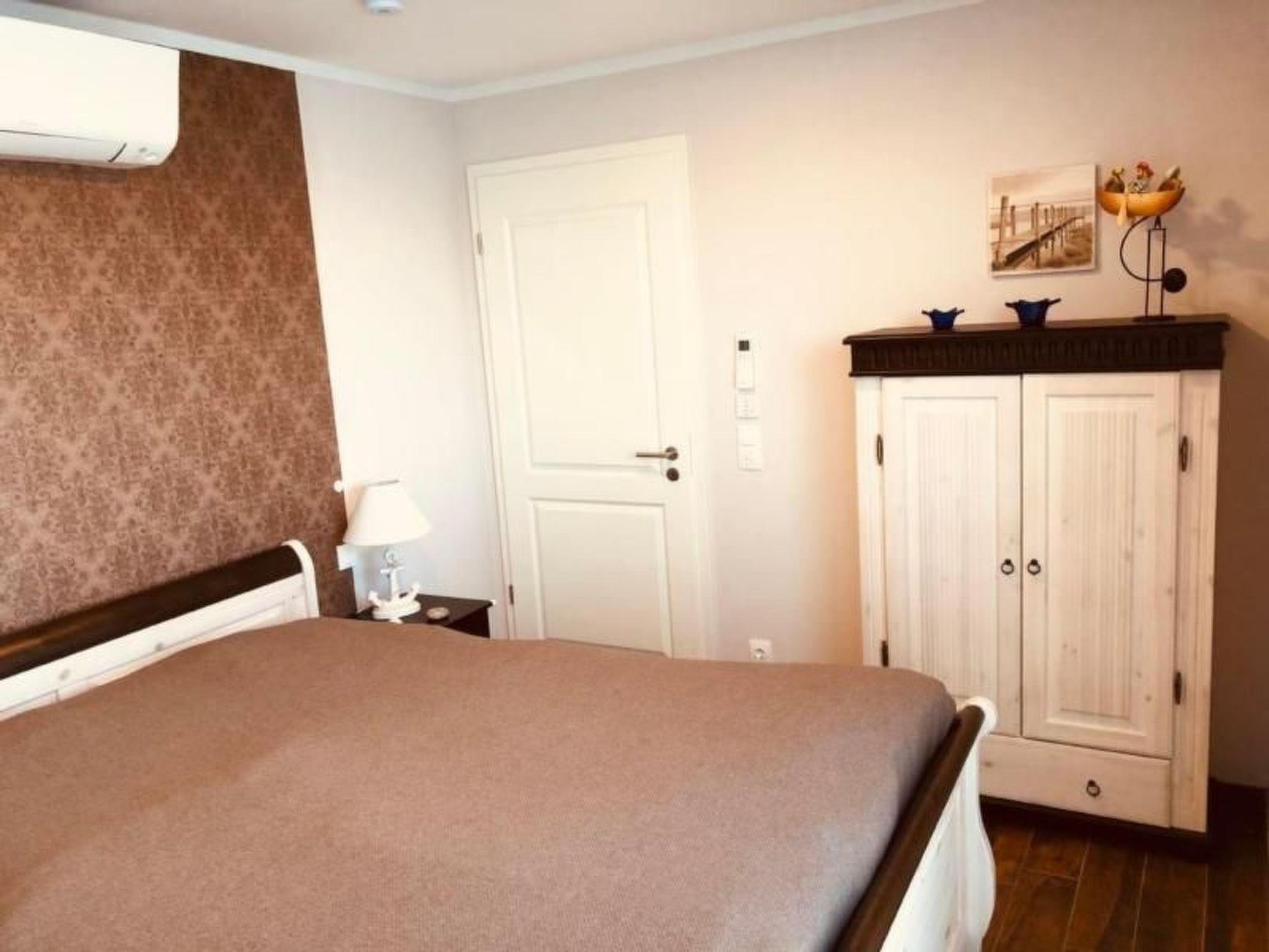 The 2 bedrooms and the large bathroom await you on the ground floor. The master bedroom with double bed and plenty of furniture for storage has a sensational panoramic view of the lake and direct access to the surrounding terrace, the XXL wicker beach chair and the water. There is also a TV and free W-LAN here.