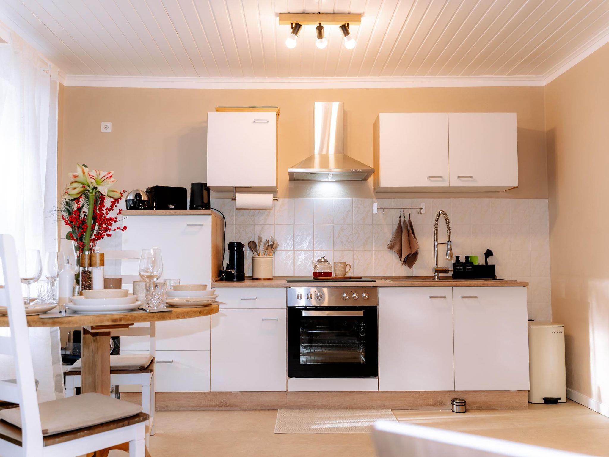 Die an den Raum angepasste Küche ist ausgestattet mit allen Geräten, die man sich wünscht: Kaffeemaschine, Wasserkocher, Eierkocher, Brotschneidemaschine, Mikrowelle, Milchaufschäumer, Toaster, ...). Hochwertiges Geschirr sowie Geschirr und alles Zubehör ist vorhanden (Pfannen, Töpfe, Kochutensilien, Gewürze, Siebe, Reiben, etc ...). Am restaurierten Altholz Esstisch für 6 Personen genießen Sie Mahlzeiten mit Blick auf die friedlich grasenden Galloway Rinder. Es besteht die Möglichkeit ein Frühstückspaket vorzubestellen aus regionalen Produkten. Einfach per Mail anfragen!