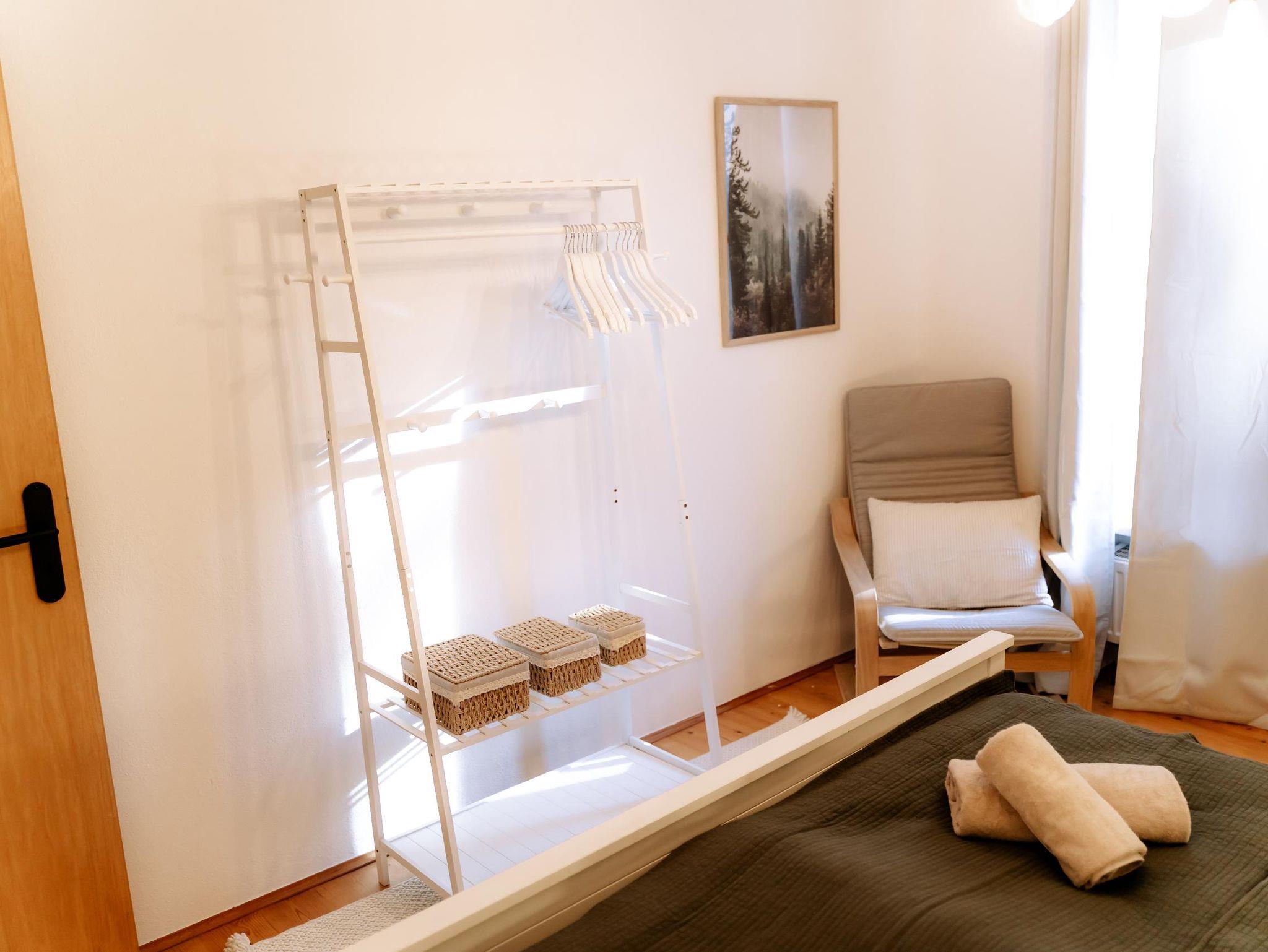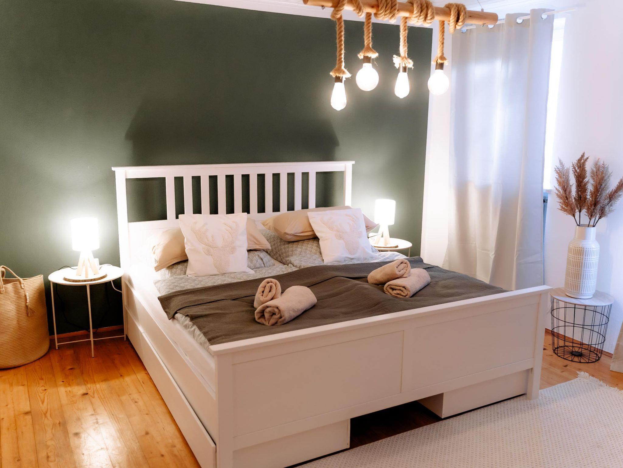 Die ruhigen Schlafzimmer bieten ein angenehmes Raumklima mit hohen Fenstern und einer Wohlfühlatmosphäre. Die großen Doppelbetten, bezogen mit Bettwäsche und zusätzlichen Kissen garantieren erholsame Stunden.