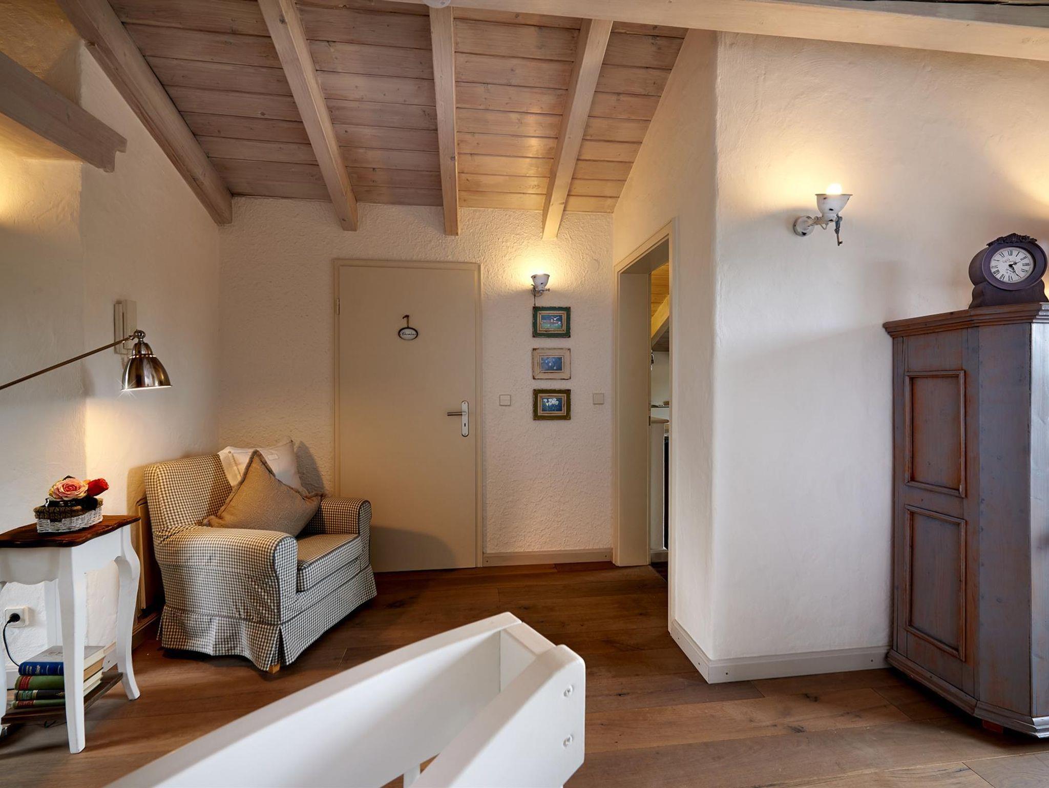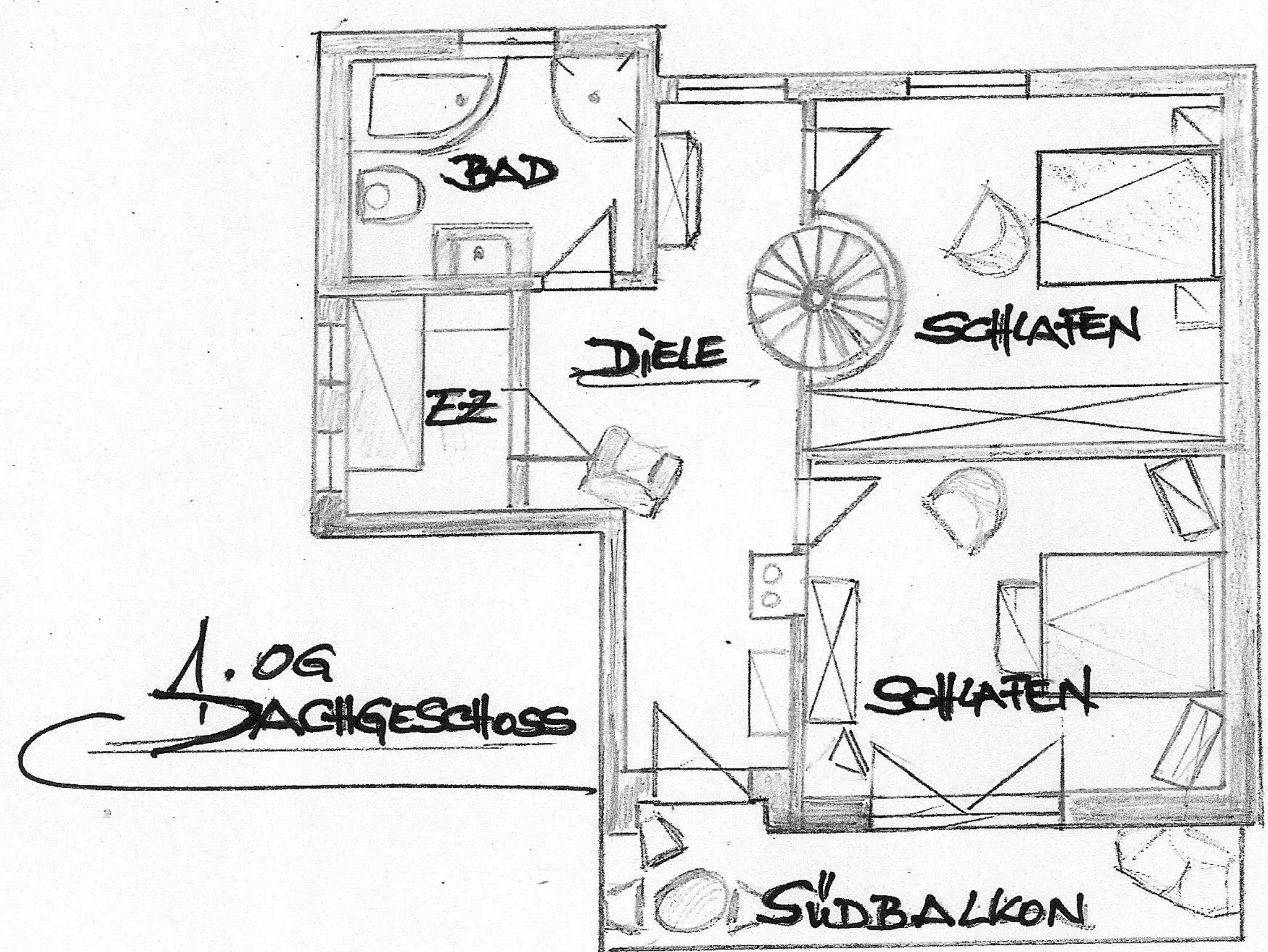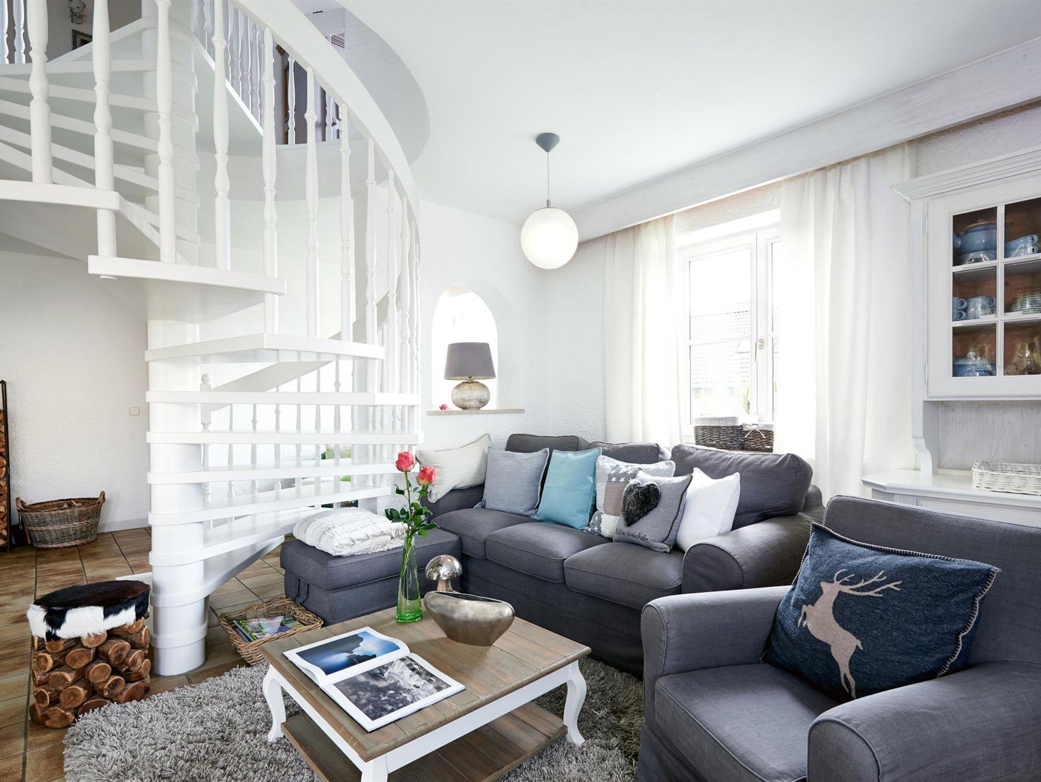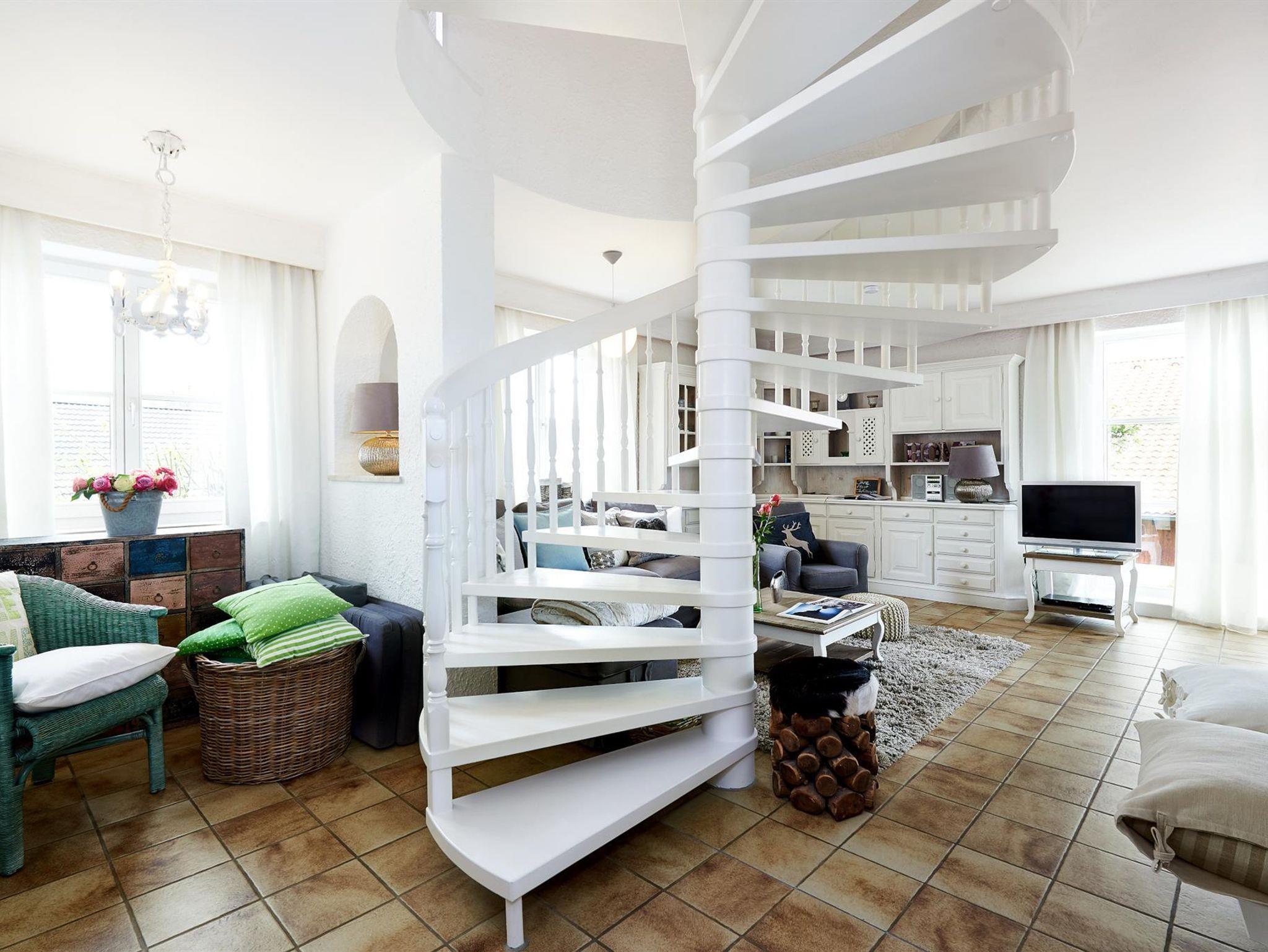 Die offene Bauweise mit zentral gelegener Wendeltreppe verbindet die einzelnen Räume. Die verwinkelten Bereiche bieten individuelle Rückzugsmöglichkeiten in romantischem Ambiente.