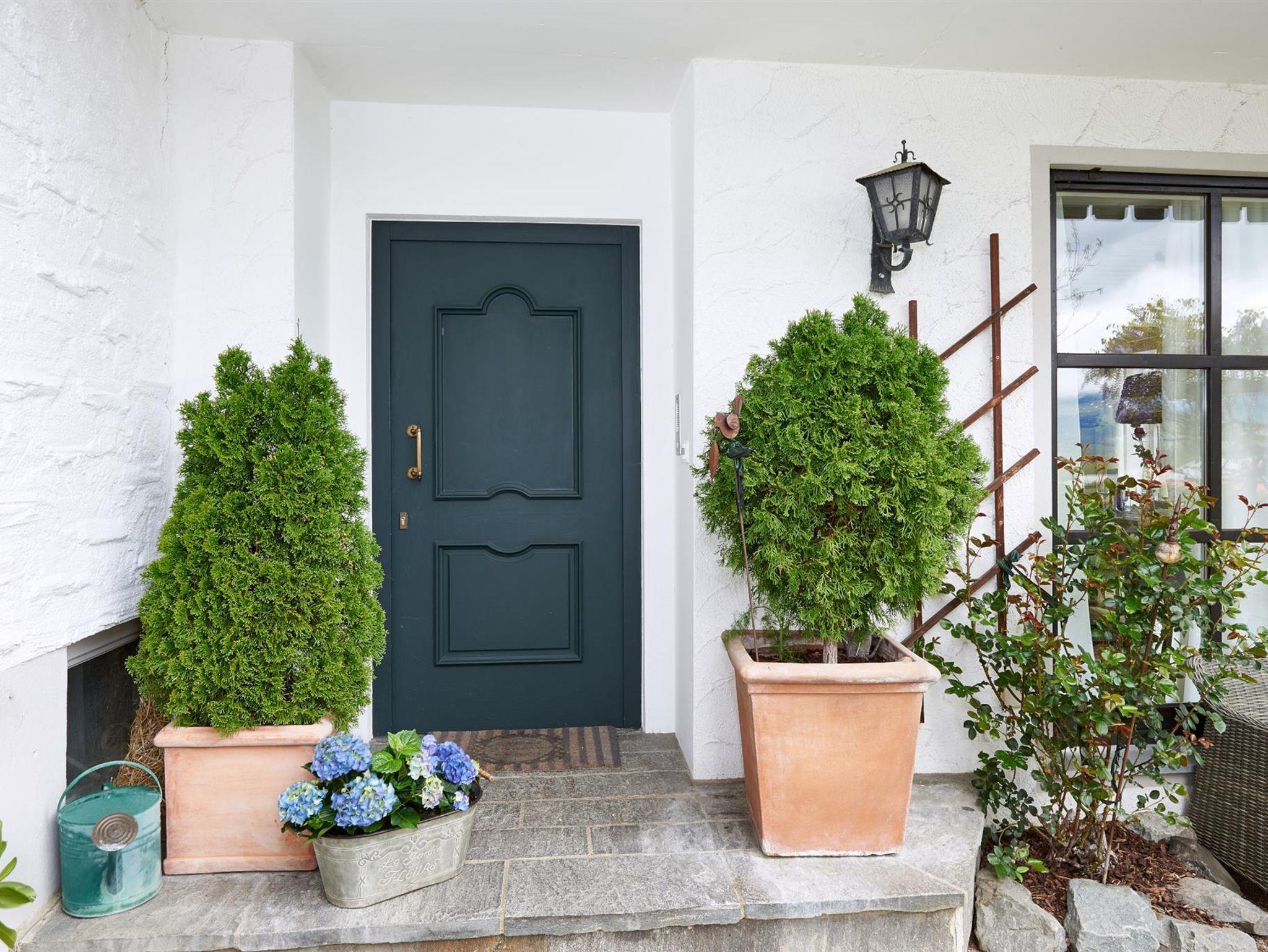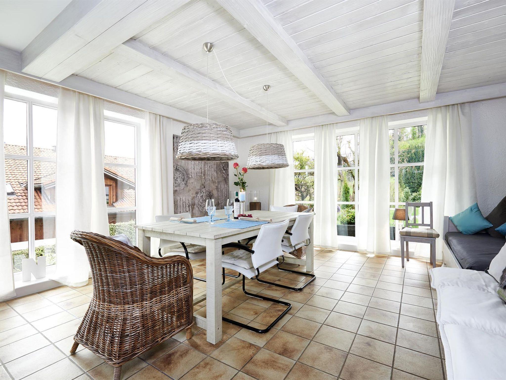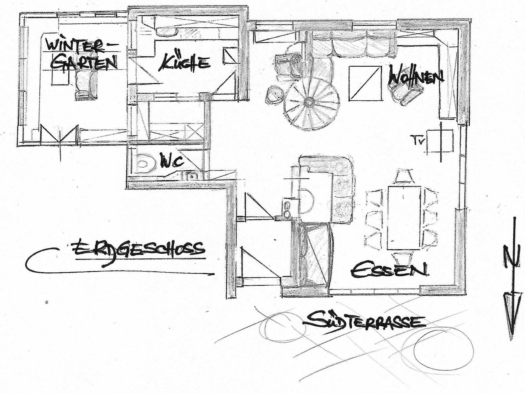 Erdgeschoss: Wohn- und Essraum mit Kachelofen, separate Küche, Gäste-WC, Wintergarten (nicht beheizbar), Süd-Terrasse mit Liegewiese und Bergblick.