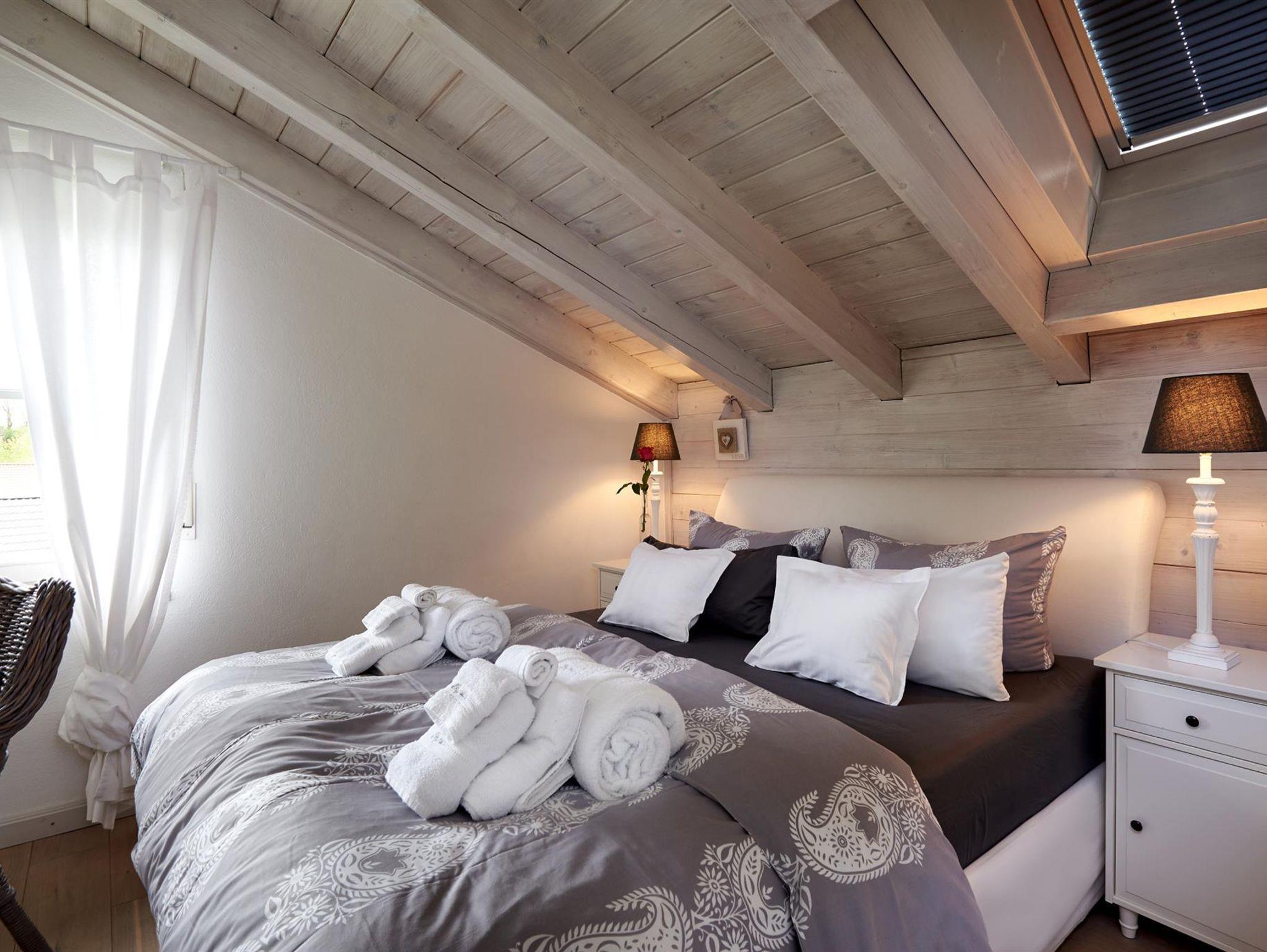 Dachgeschoss: 2 Doppelschlafzimmer, 1 kl. Kinderzimmer, Badezimmer, großer Süd-Balkon mit Bergblick.
