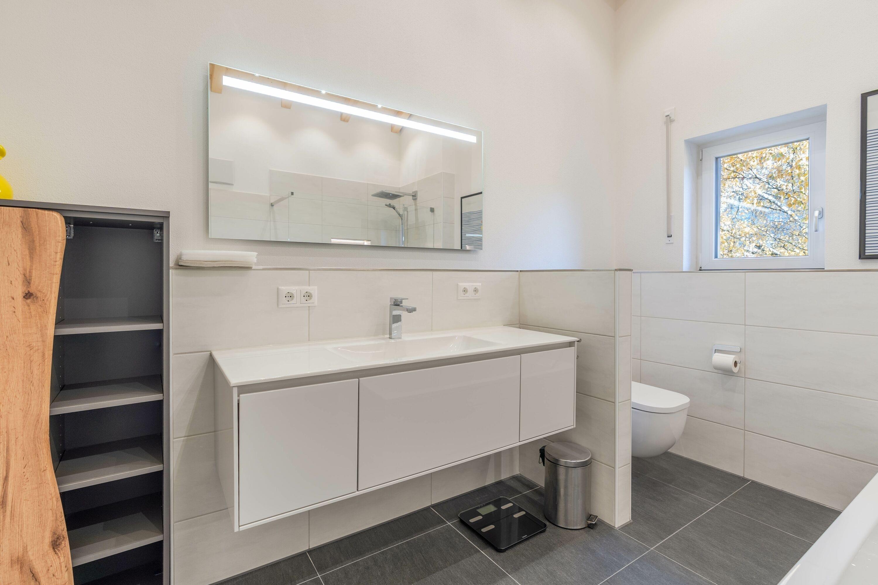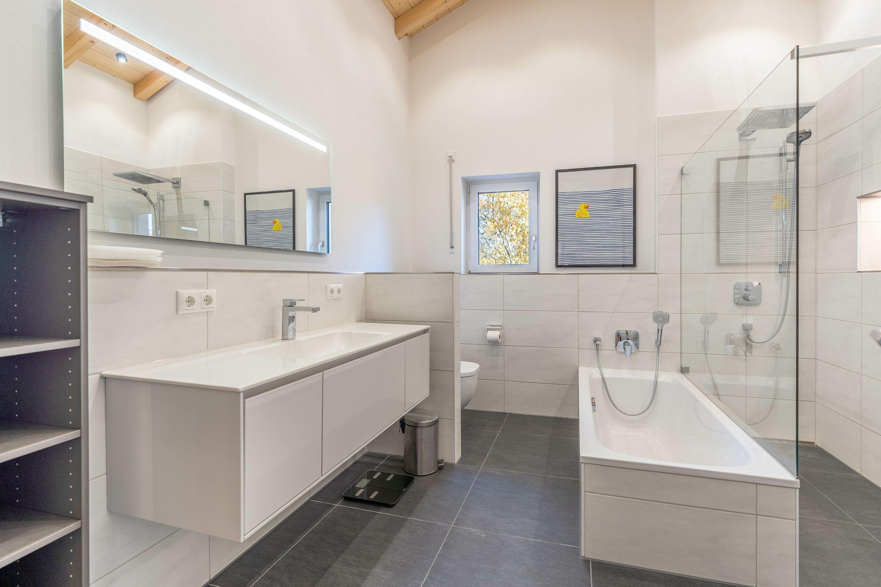 Das Badezimmer verfügt über einen großen Waschtisch, eine Badewanne, eine große Dusche und ein WC. Ihre Handtücher hängen angewärmt an der Handtuchheizung. Zusätzlich finden Sie ein separates Gäste-WC in der Wohnung.