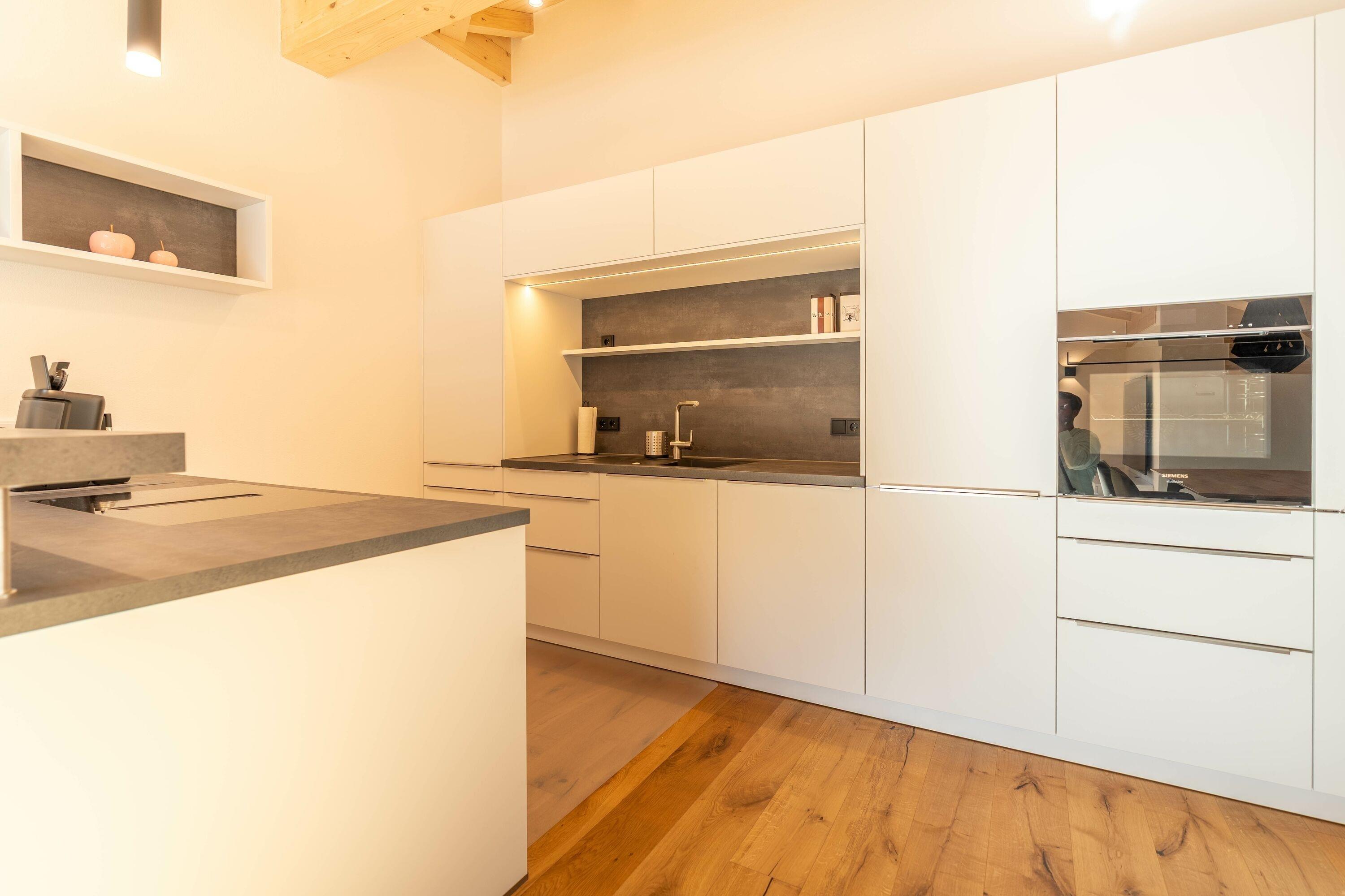 Außerdem finden Sie in der Wohnküche einen Essbereich und natürlich die hochmodern ausgestattete Küche (alle Elektrogeräte von Siemens) mit Theke und Barhockern. Hier können Sie Ihrer kulinarischen Kreativität freien Lauf lassen und gemeinsam feine Speisen zaubern.