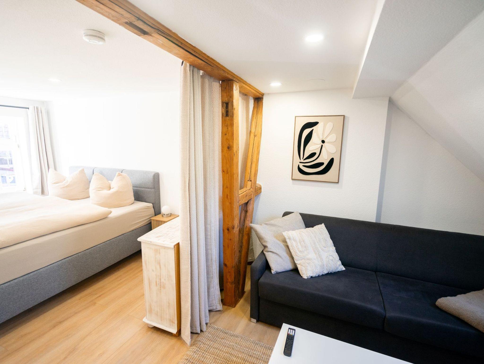 Unsere Ferienwohnungen Morgentau, Wanderlust, Harztraum und Bergmoment bieten für unterschiedliche Bedürfnisse den passenden Rückzugsort ? von gemütlichen Einheiten für Paare bis hin zu großzügigen Wohnungen für Familien oder Freunde. Die Wohnung Bergmoment befindet sich im oberen Geschoss des Hauses und bietet dort als ruhiger Rückzugsort über den Dächern der Altstadt besonders viel Privatsphäre. Alle Wohnungen überzeugen durch eine durchdachte Raumaufteilung, modernen Komfort und die besondere Lage direkt an der historischen Stadtmauer.