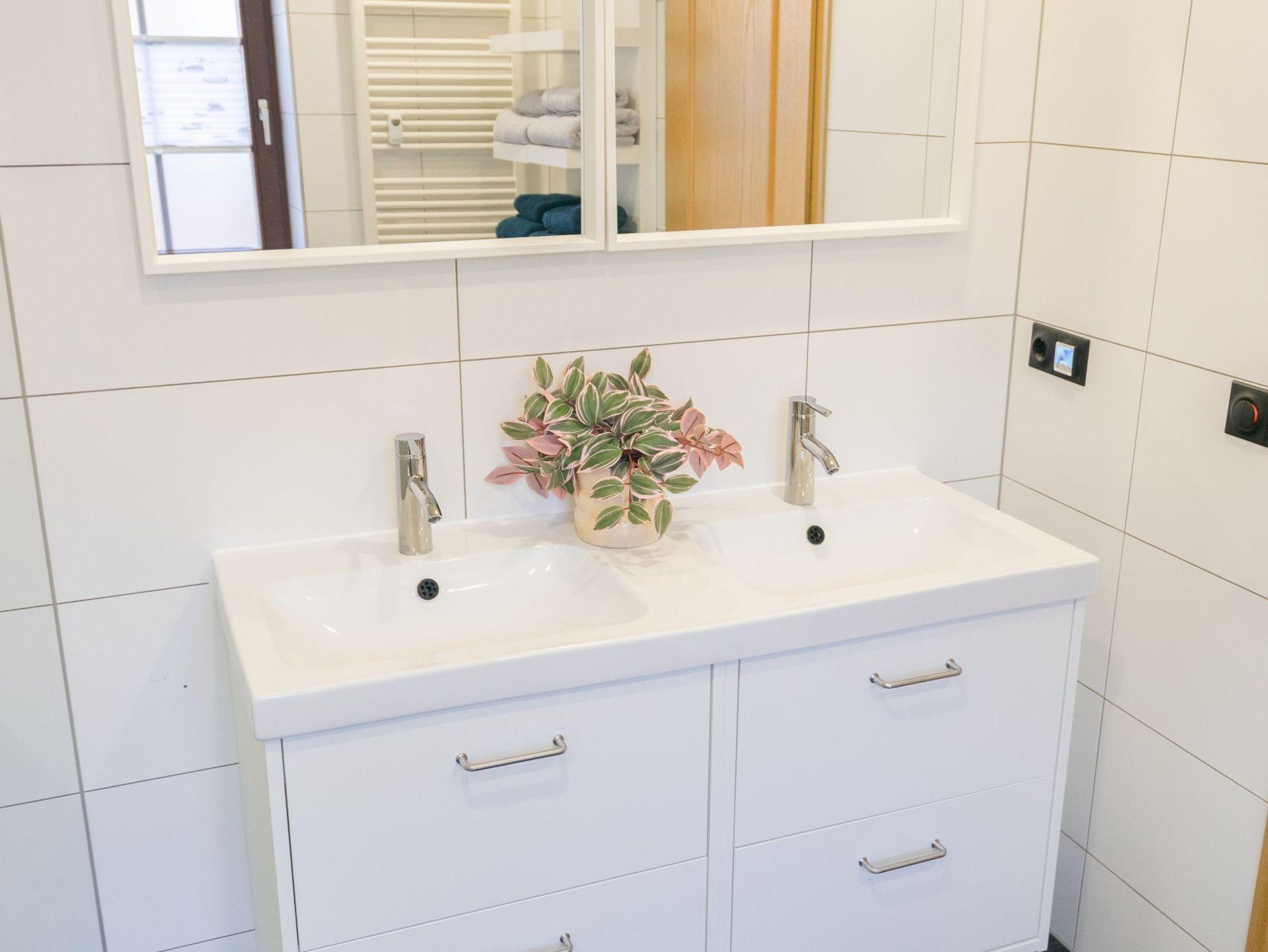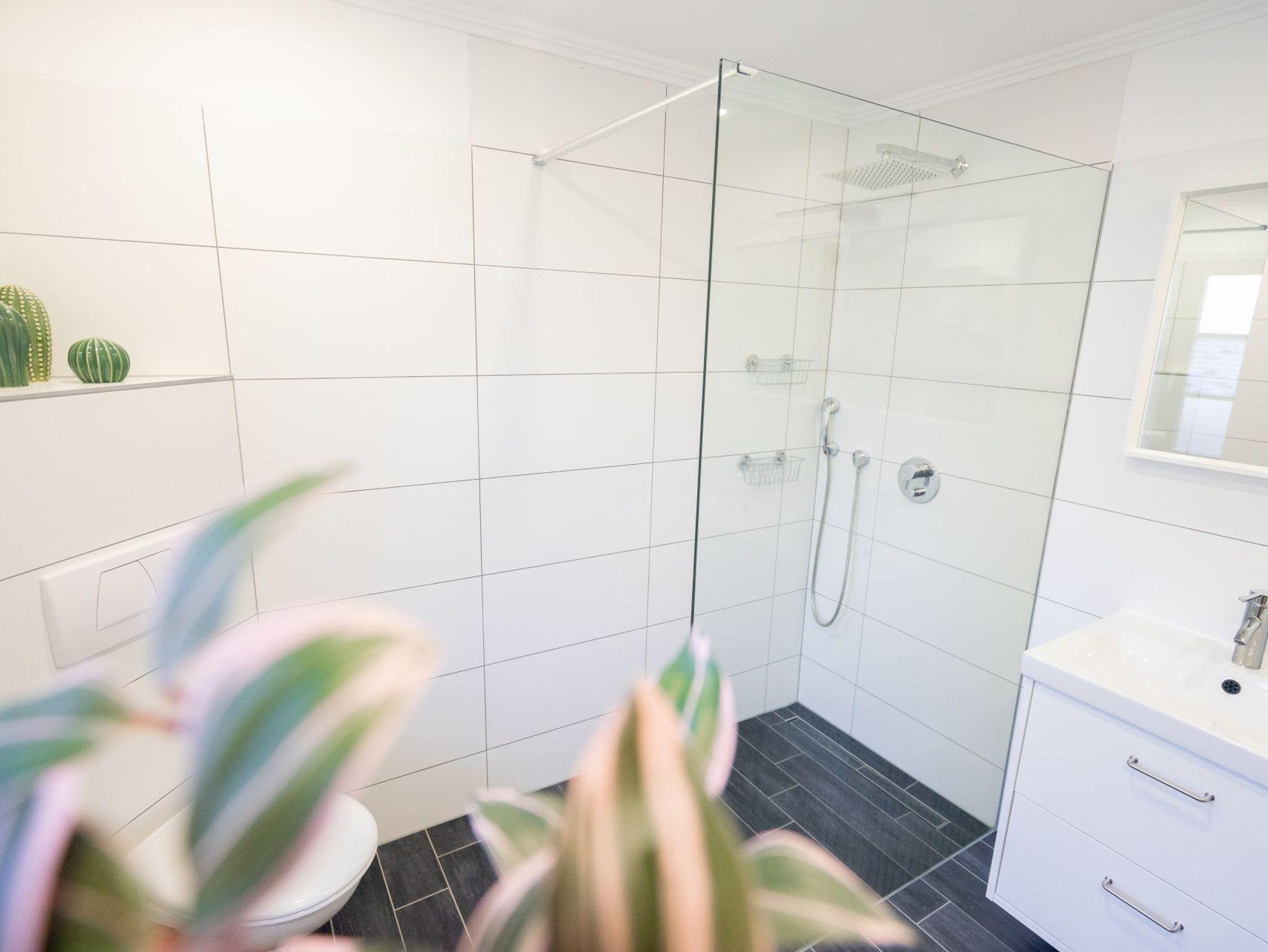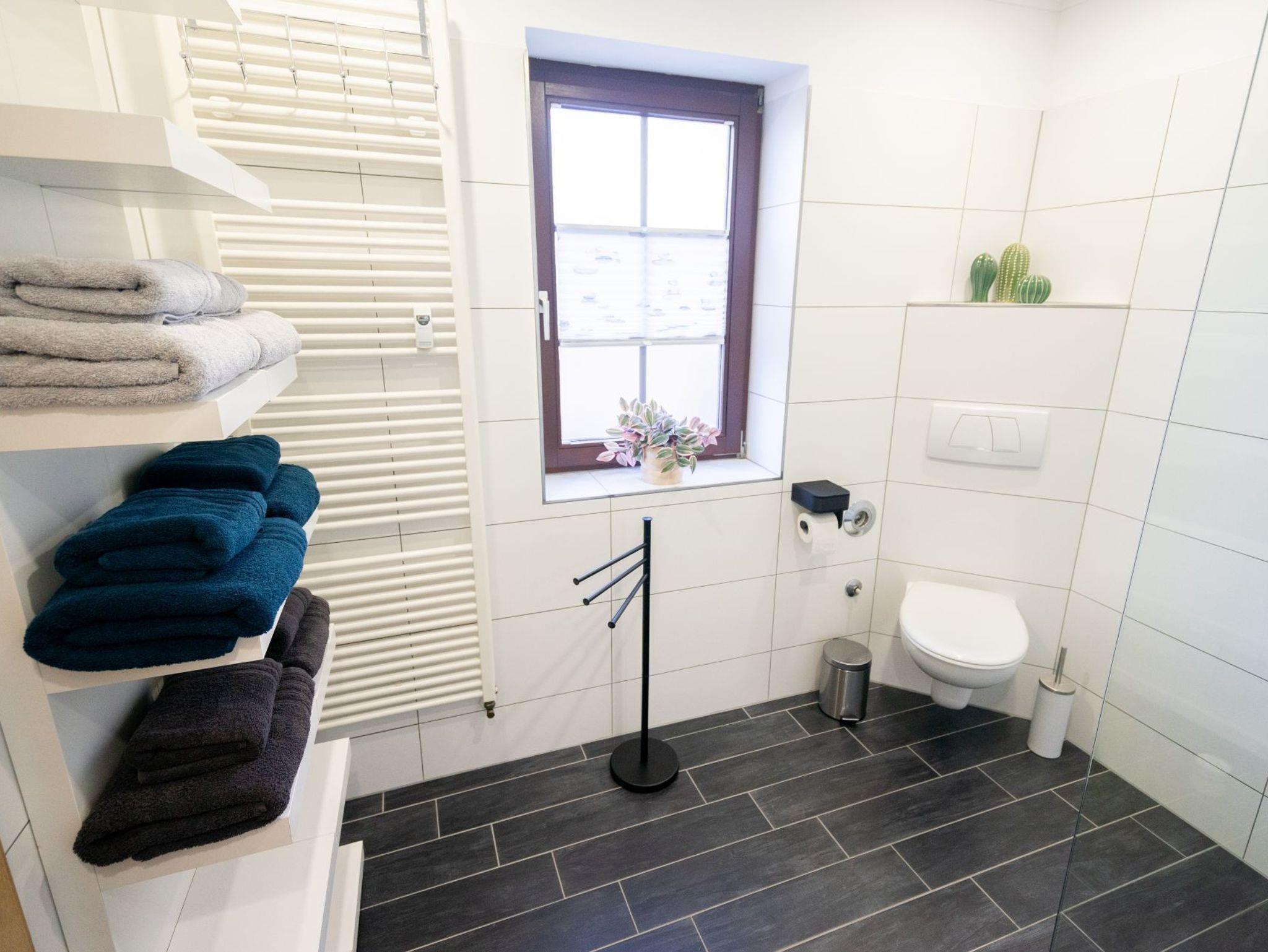 Das moderne Badezimmer ist großzügig gestaltet und bietet mit seiner komfortablen Dusche einen angenehmen Start in den Tag oder entspannte Momente nach einem erlebnisreichen Harztag.