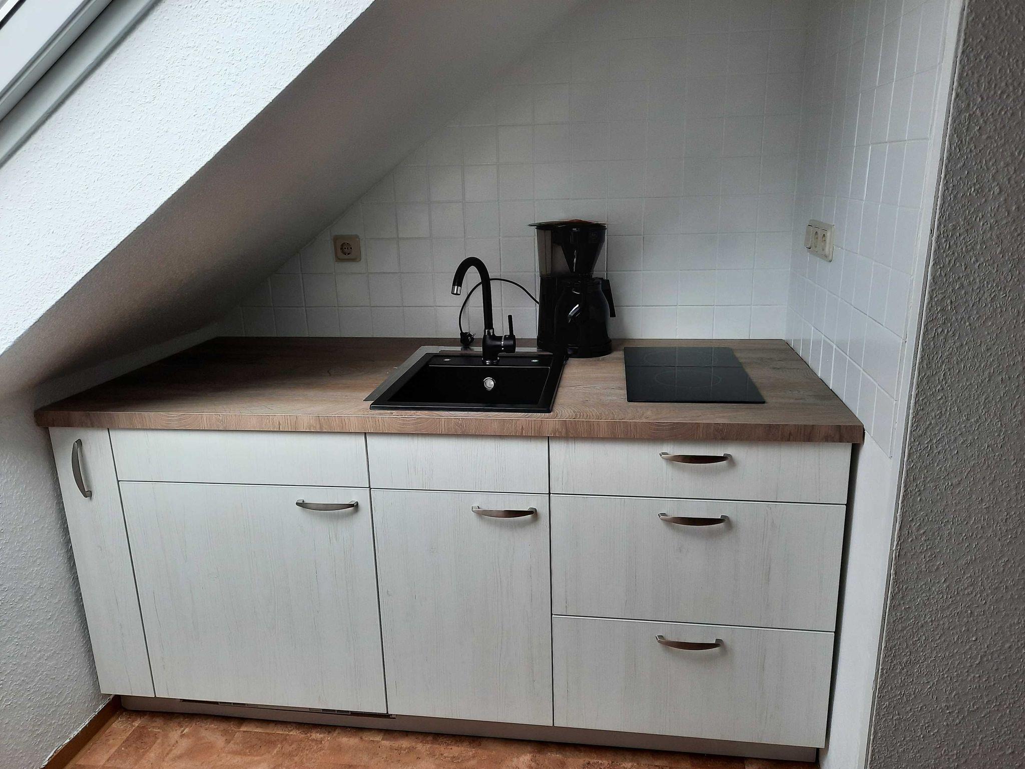 Ruhige aber zentrale Lage, Nichtraucher, Dachgeschoss (3. Etage), Parkplatz, Schlafzimmer mit Doppelbett, Wohnzimmer mit Schlafsofa und kleiner, zum Wohnraum geöffnete Küche.
