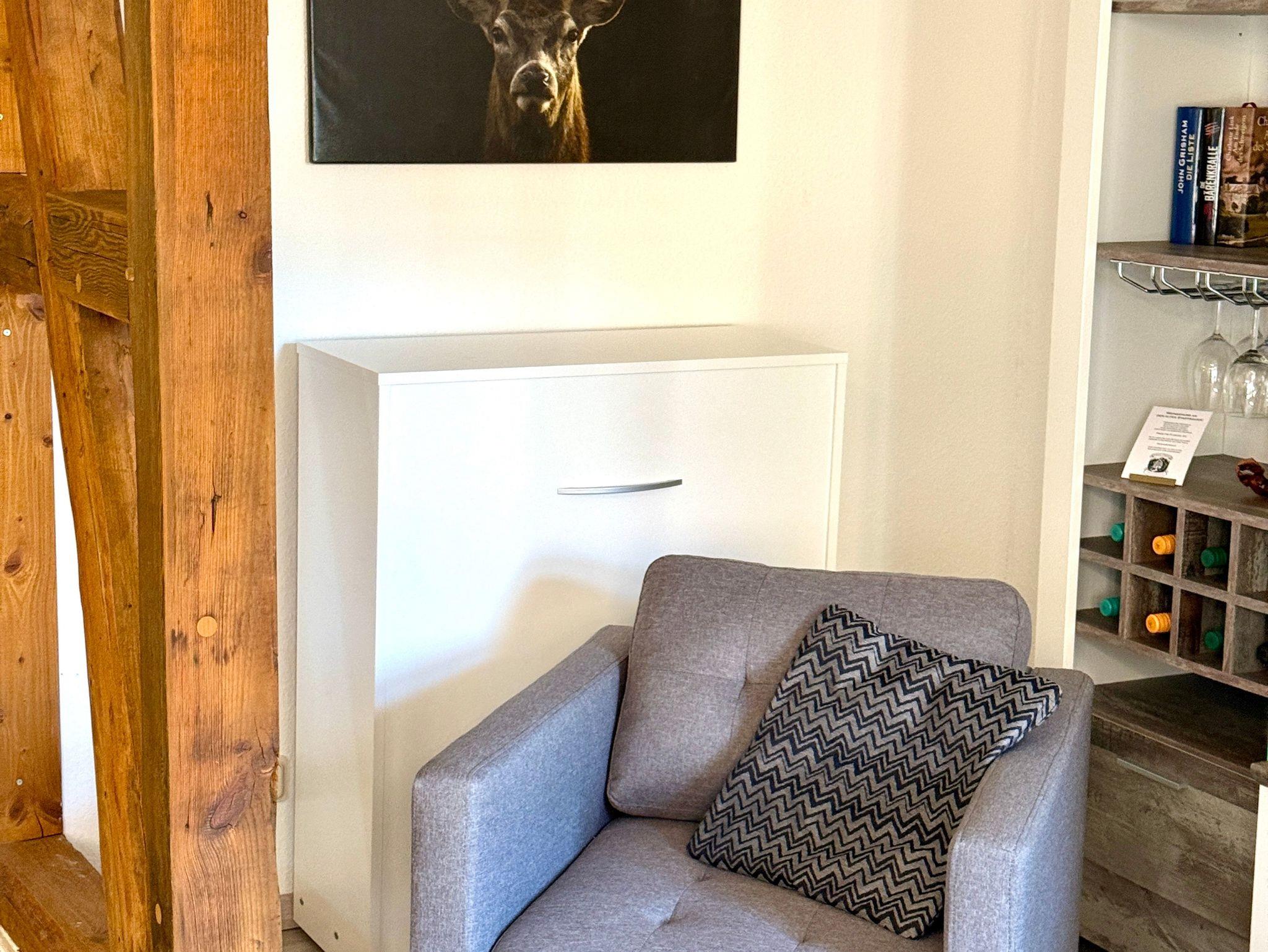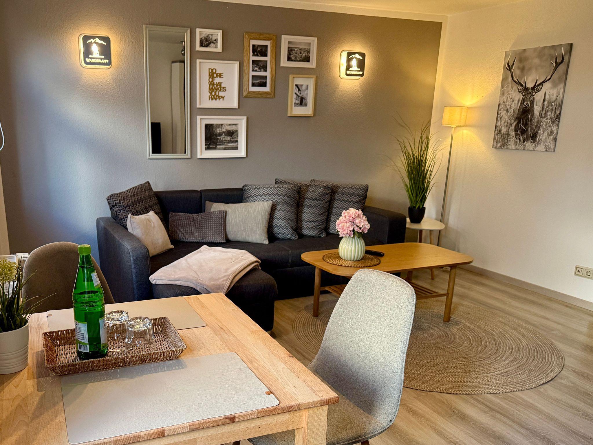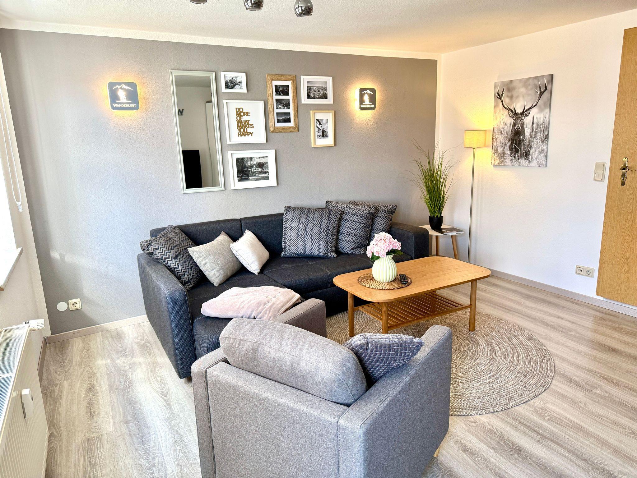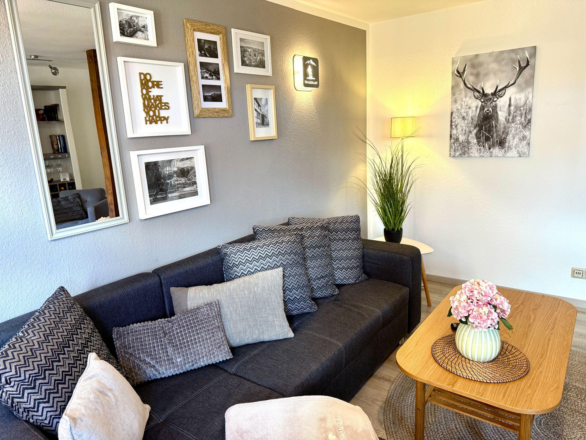 Unsere Ferienwohnung Wanderlust ist der ideale Rückzugsort nach einem Tag voller Erlebnisse im Harz. Das Wohnzimmer mit sichtbaren Fachwerkbalken versprüht historischen Charme, während im Schlafzimmer ein komfortables Boxspringbett für erholsame Nächte sorgt. Das helle Bad ist mit Dusche und WC ausgestattet, dazu gibt es eine praktische Küche mit Sitzecke sowie einen einladenden Flurbereich. Alle Räume sind liebevoll und wohnlich eingerichtet. Zur Wohnung gehört außerdem eine Sitzecke im Garten, die zum Entspannen im Freien einlädt.