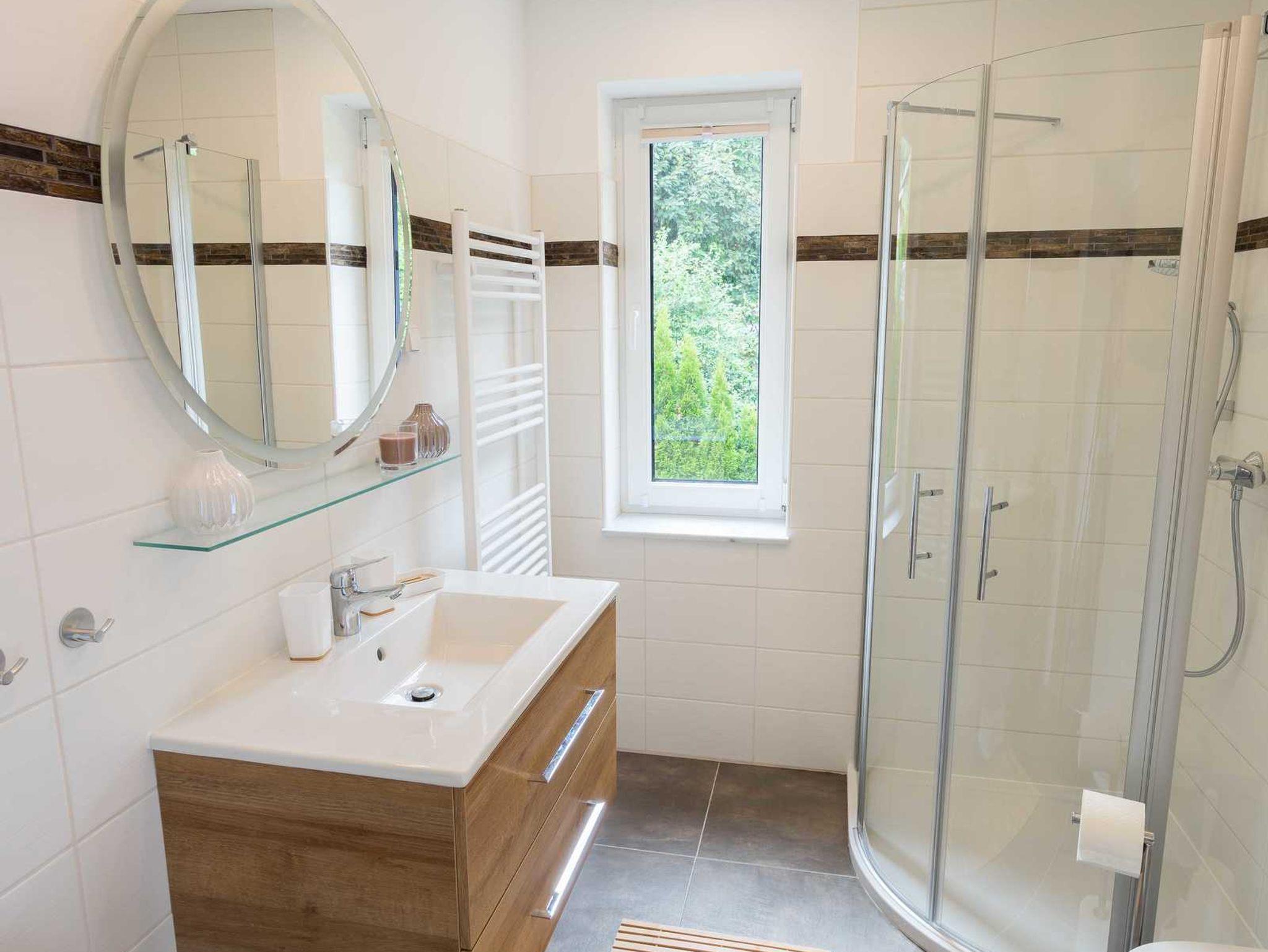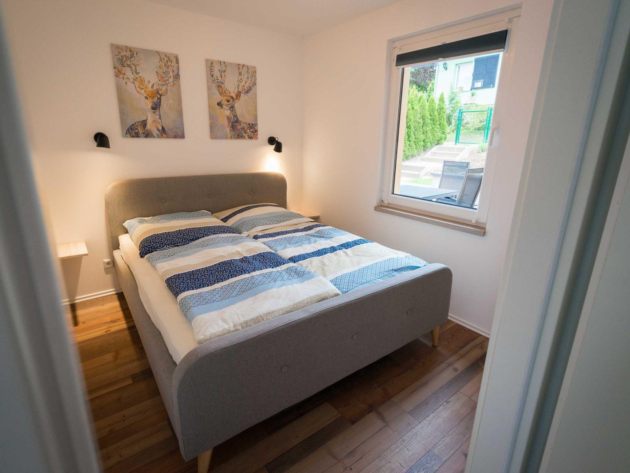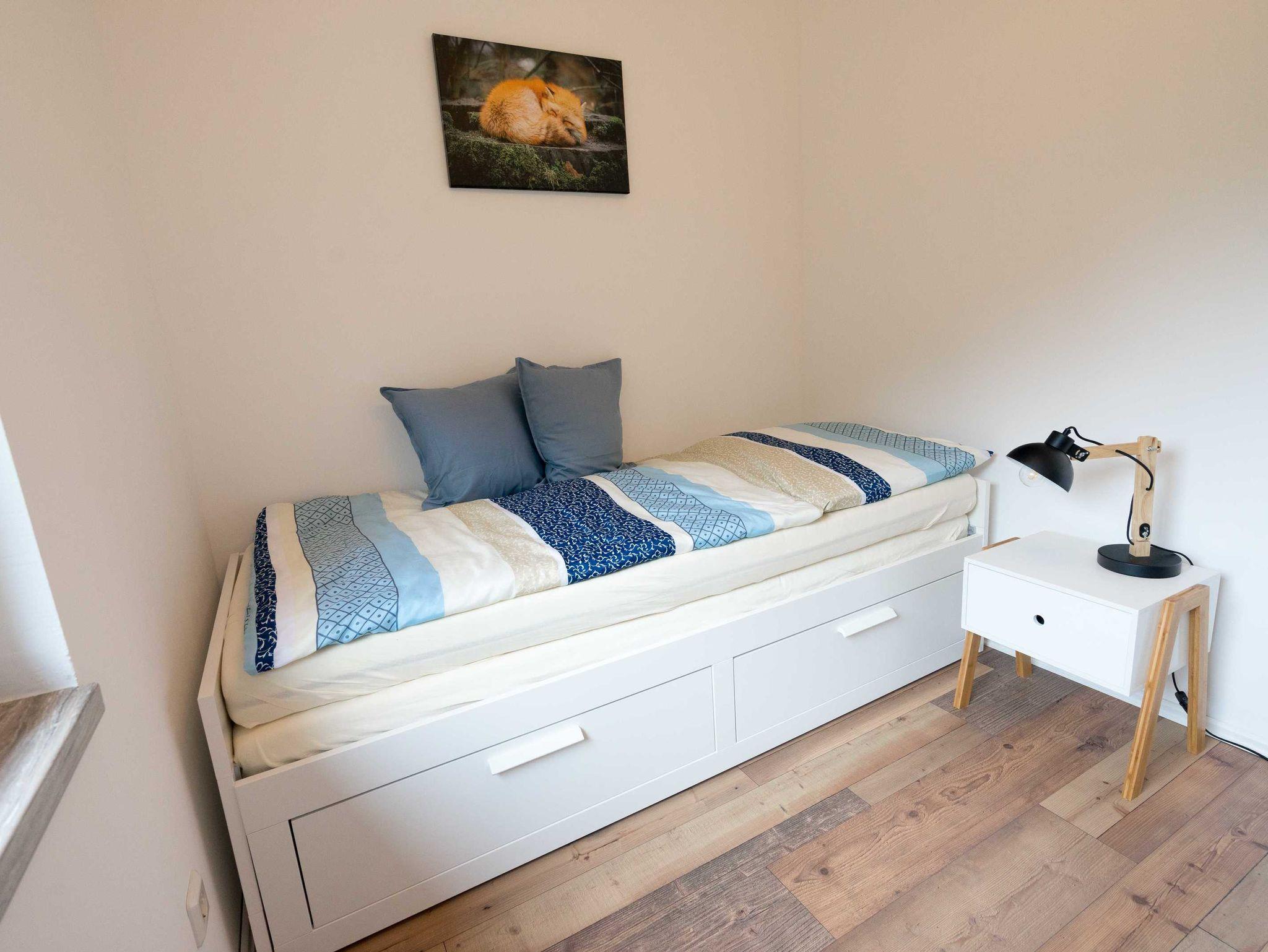 Eines der zwei separaten Schlafzimmer ist mit einem Doppelbett (1,60m) ausgestattet. In dem zweiten Schlafzimmer befindet sich ein Einzelbett, welches auf ein Doppelbett (1,60m) erweiterbar ist. Das geräumige Badezimmer mit Dusche ist vollausgestattet, auch ein Fön ist vorhanden. Die Küche im Wohn-/ Essbereich ist vollumfänglich ausgestattet, u.a. mit einem Ceran-Kochfeld, Backofen, Spülmaschine, Kaffeemaschine, Wasserkocher, Toaster, Kühlschrank mit Gefriereinheit und ausreichend Küchenutensilien.