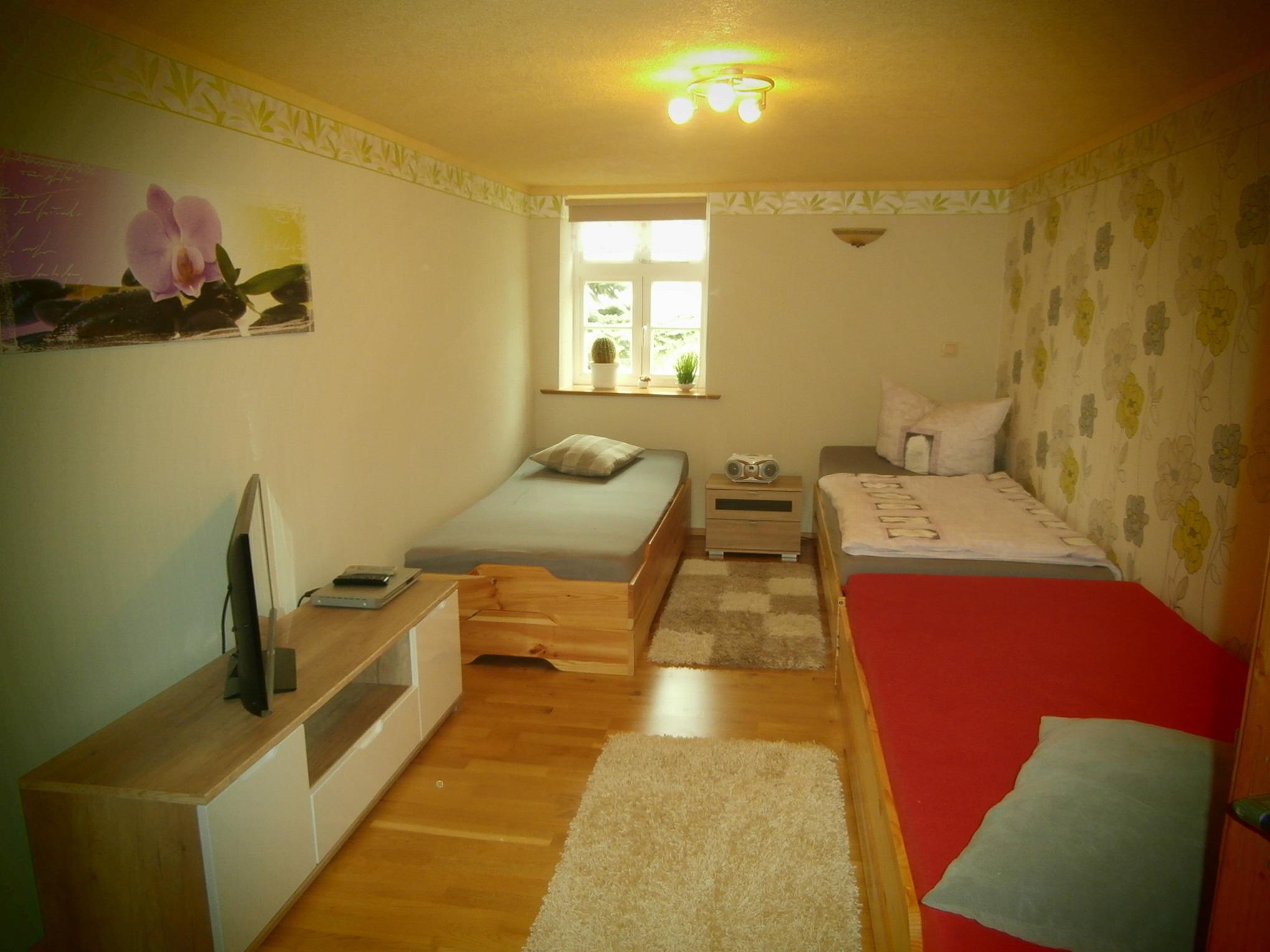 Die Unterkunft ist bis zu 5 Personen ausgeschrieben, d.h. es sind 5 normale Betten und ein Kinderbett vorhanden. Die Ferienwohnung liegt in der 1. Etage, die untere Etage wird durch uns genutzt.