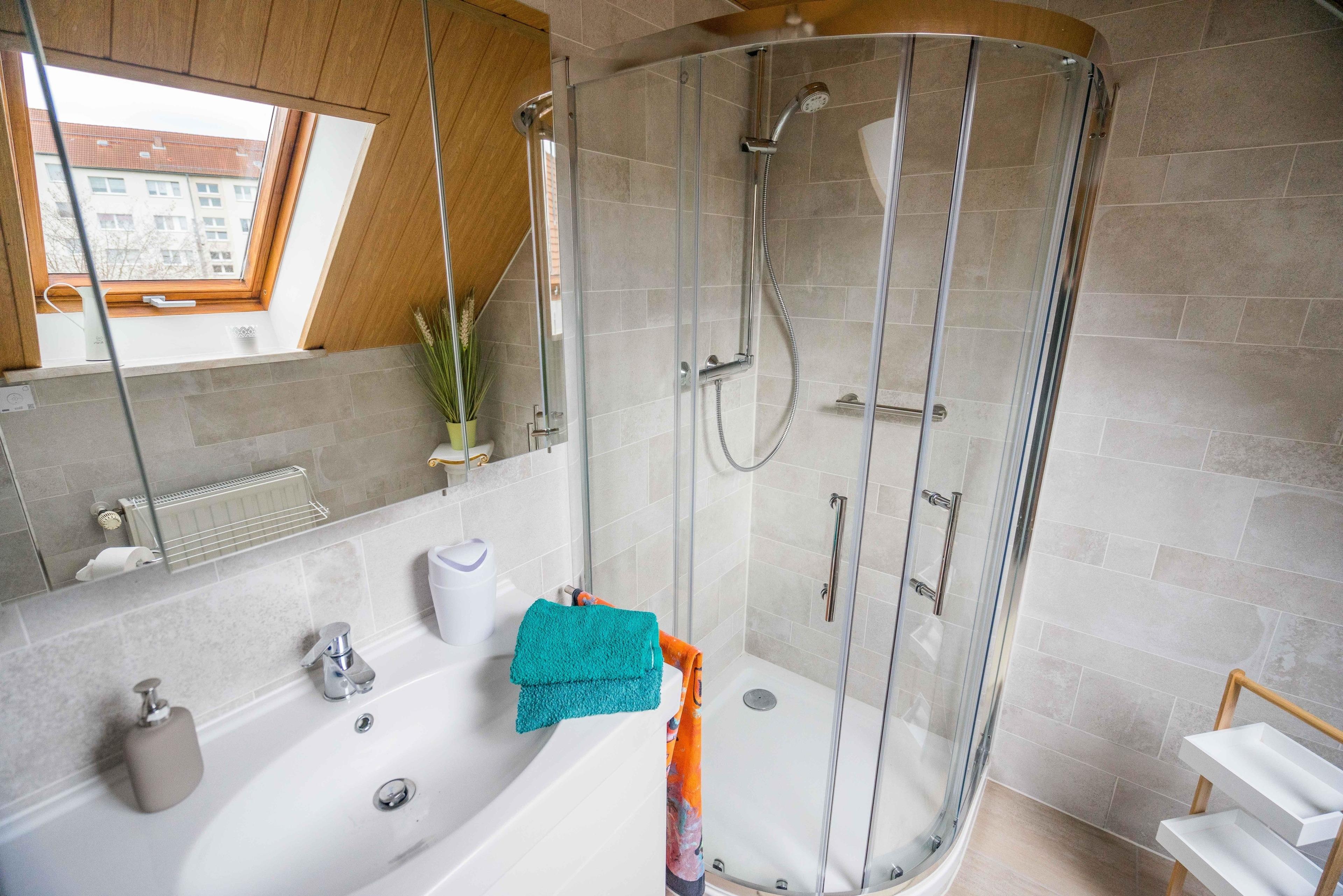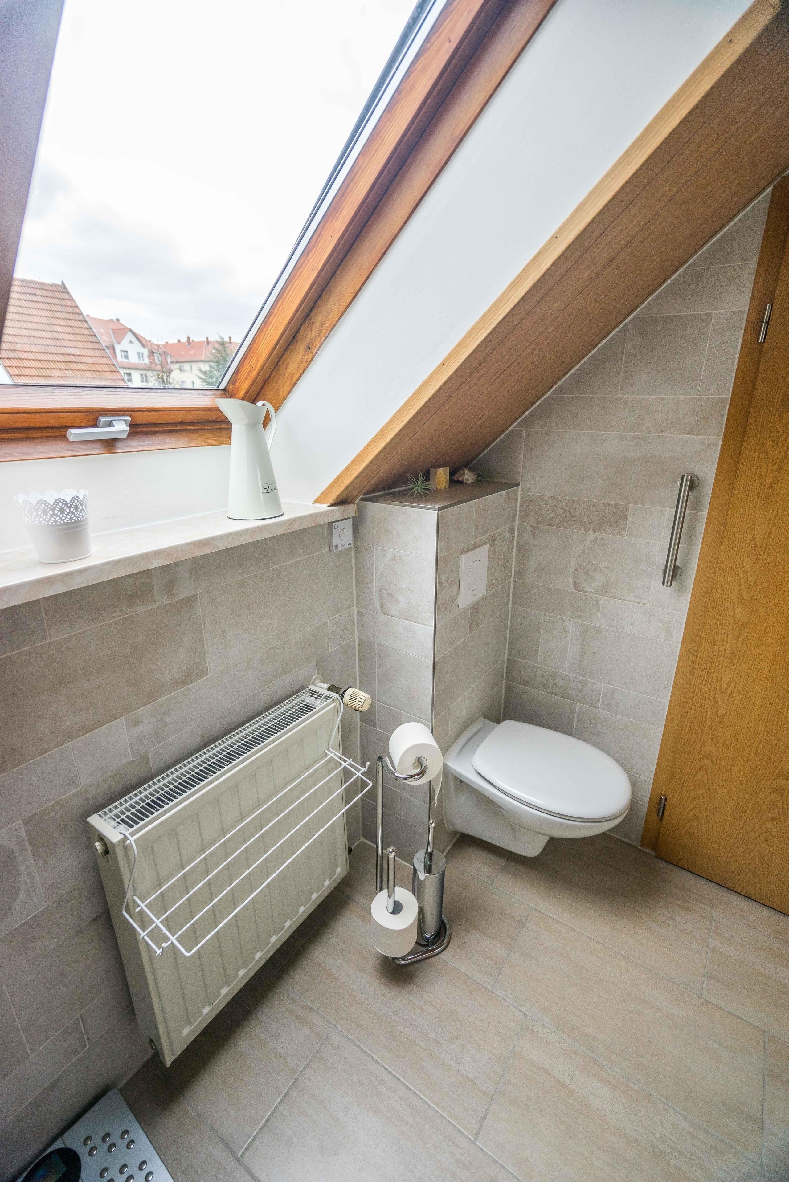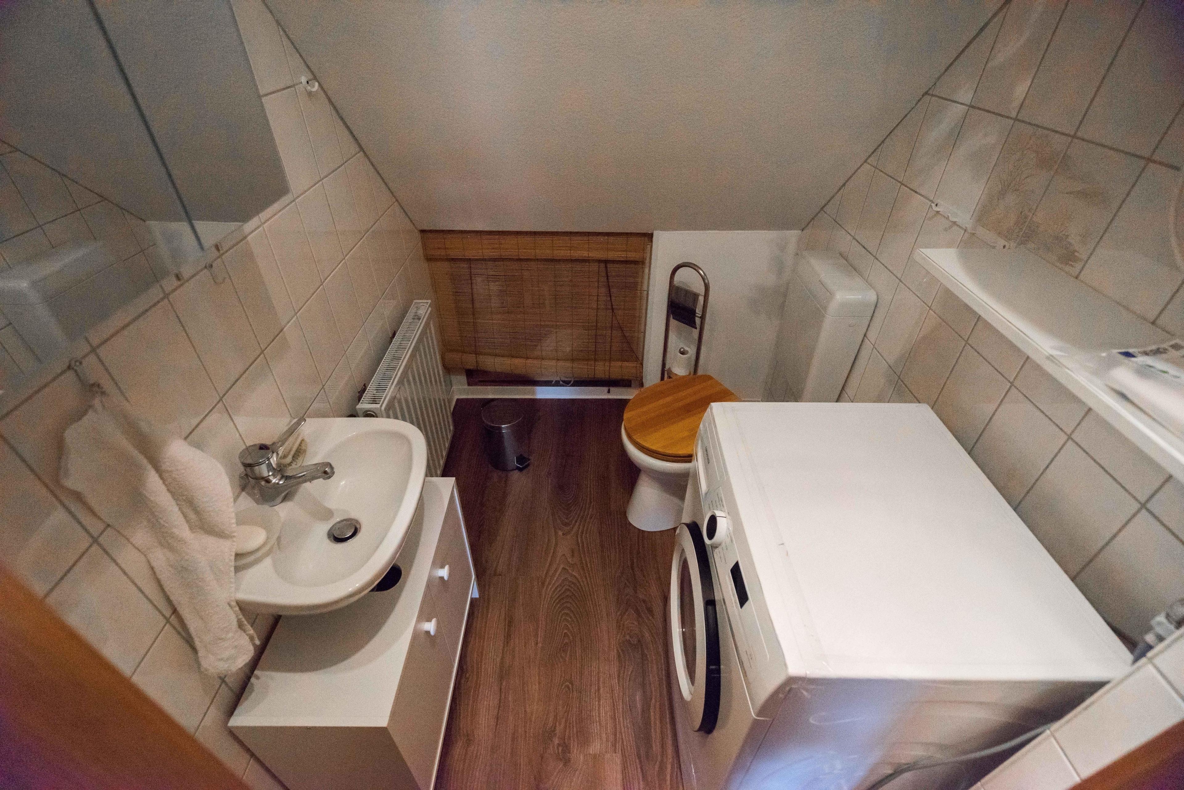 Im Obergeschoss befindet sich auch das Bad mit Dusche WC und Fußbodenheizung.