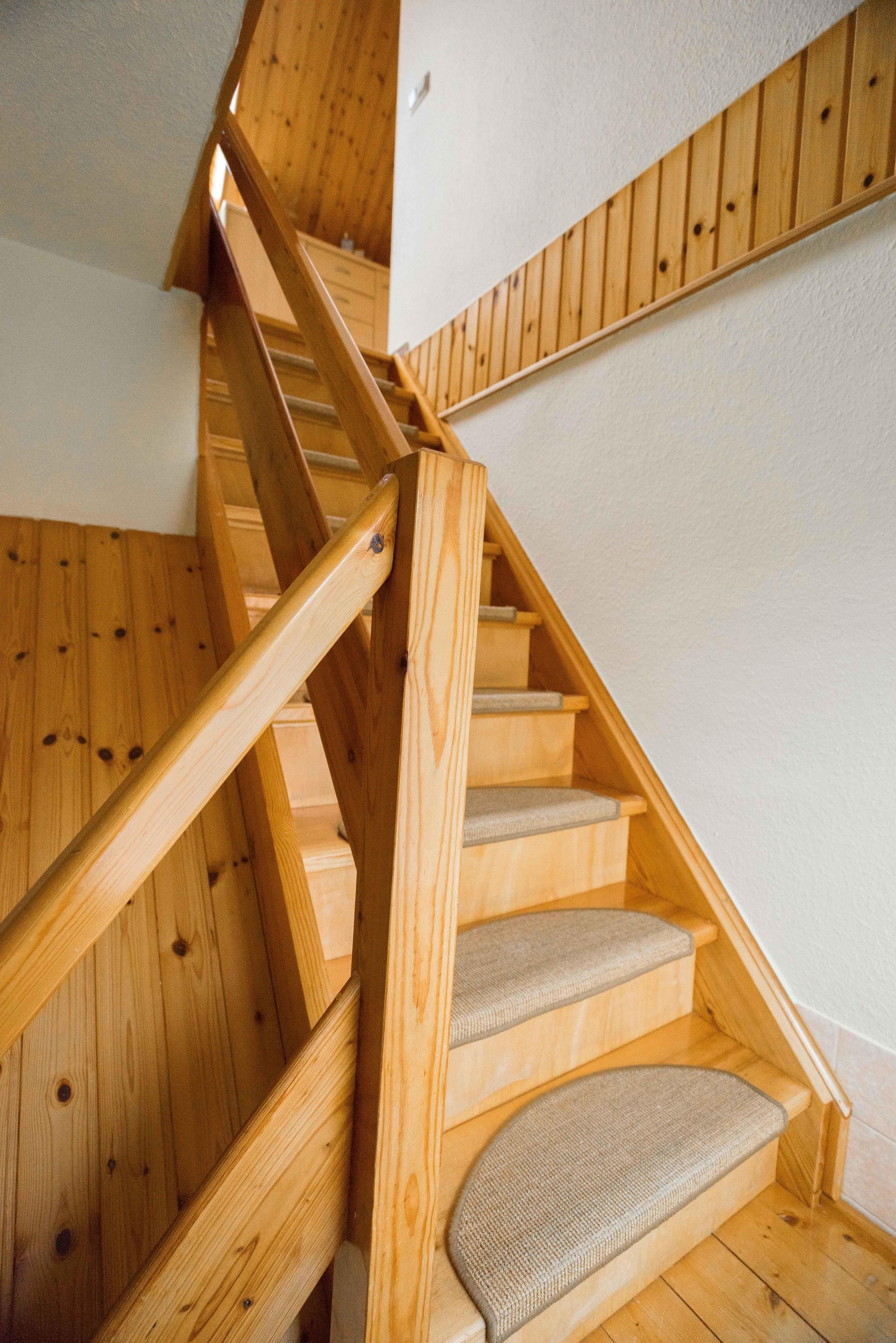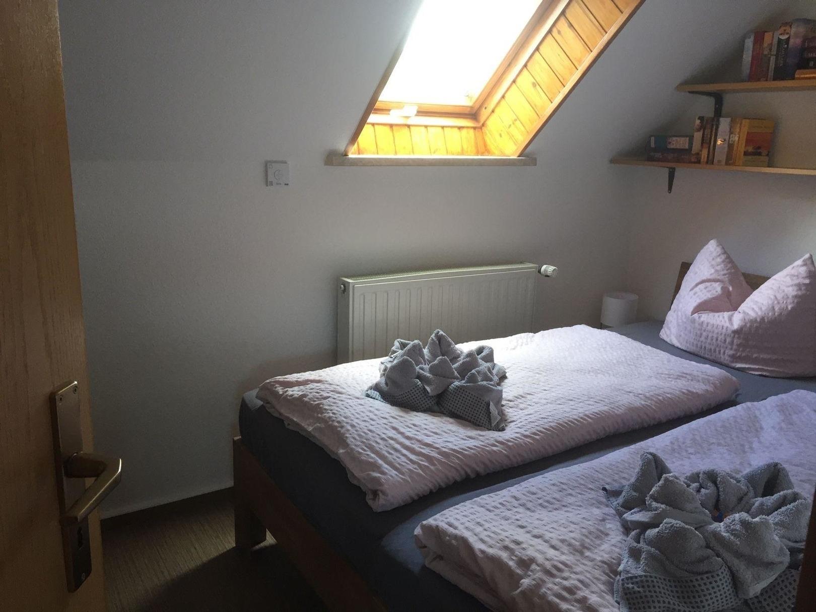 Im Obergeschoss erwarten sie zwei separate Schlafzimmer mit Doppelbetten und großem Einbau Kleiderschrank.