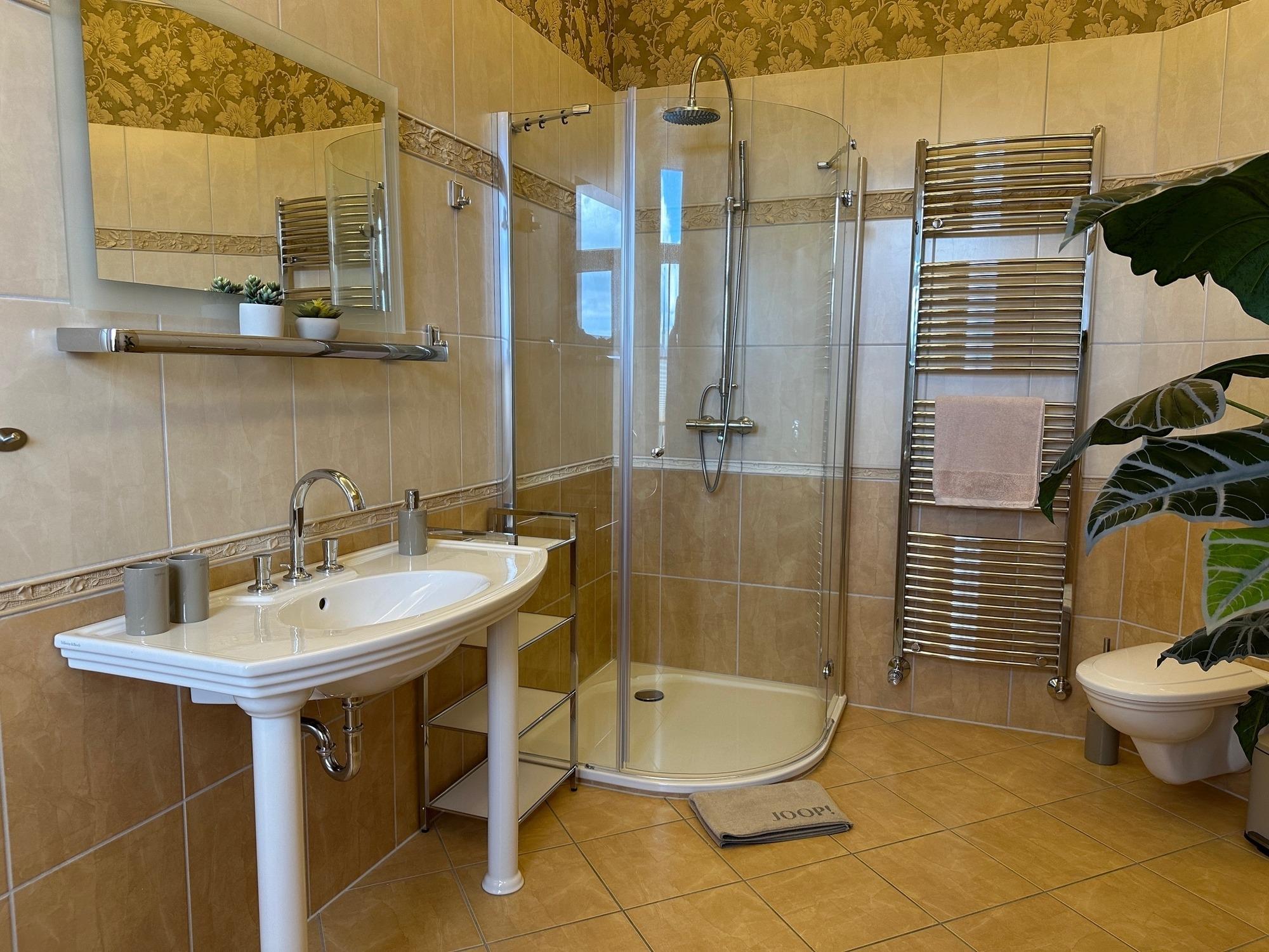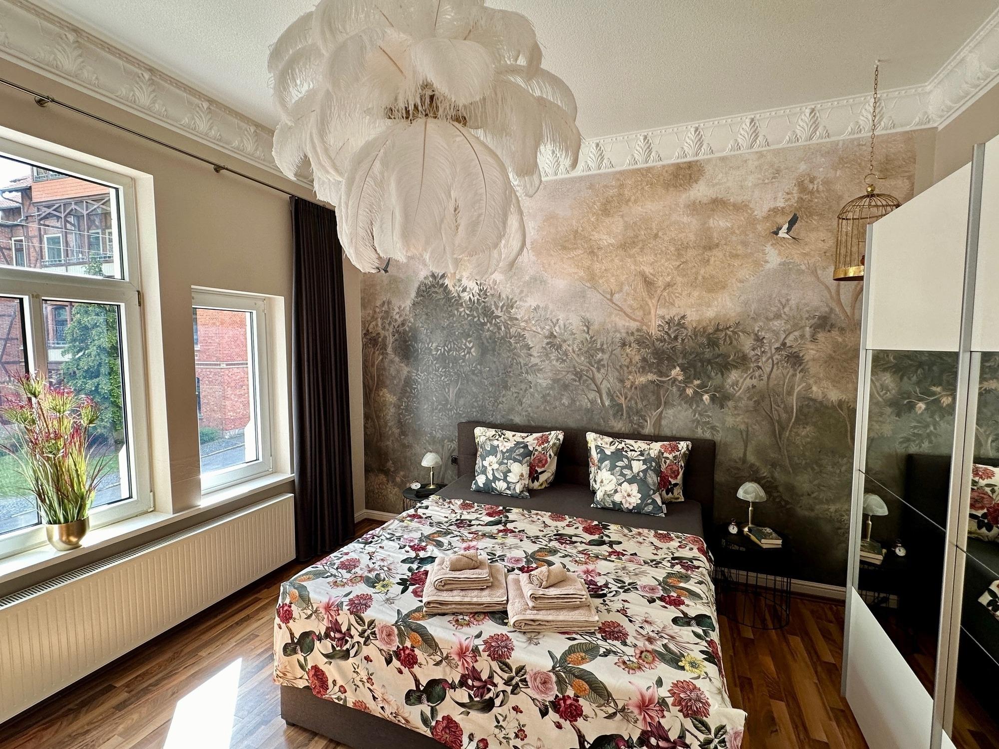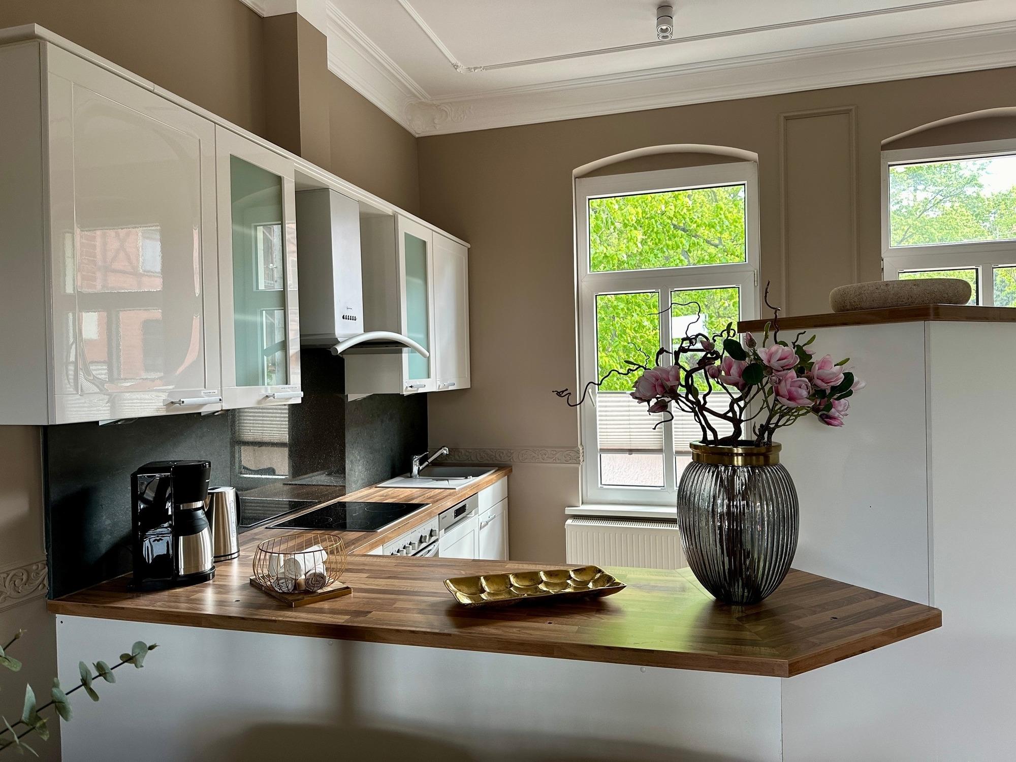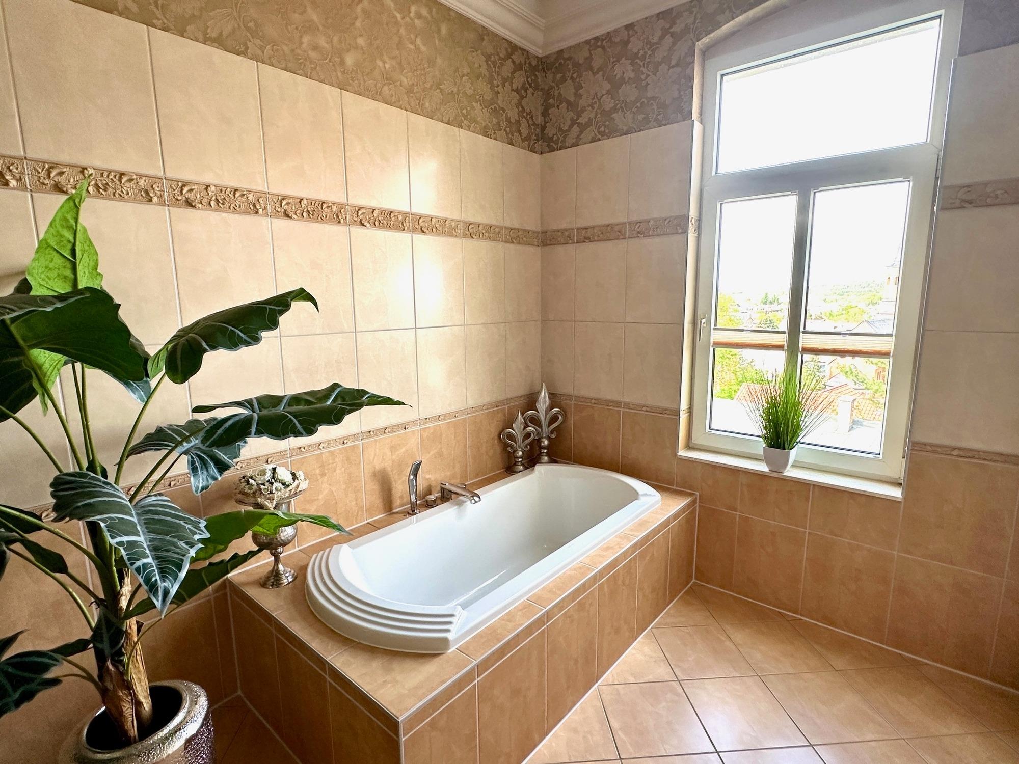 Genießen Sie das Joop Bad und die Badewanne, von der aus Sie einen Blick über die Stadt haben. Entspannen Sie sich auf einem der beiden Balkone - einer befindet sich auf der Südseite mit Blick auf den Wald und der andere auf der Nordseite, überdacht mit einem herrlichen Blick über die Stadt und das Harzvorland.