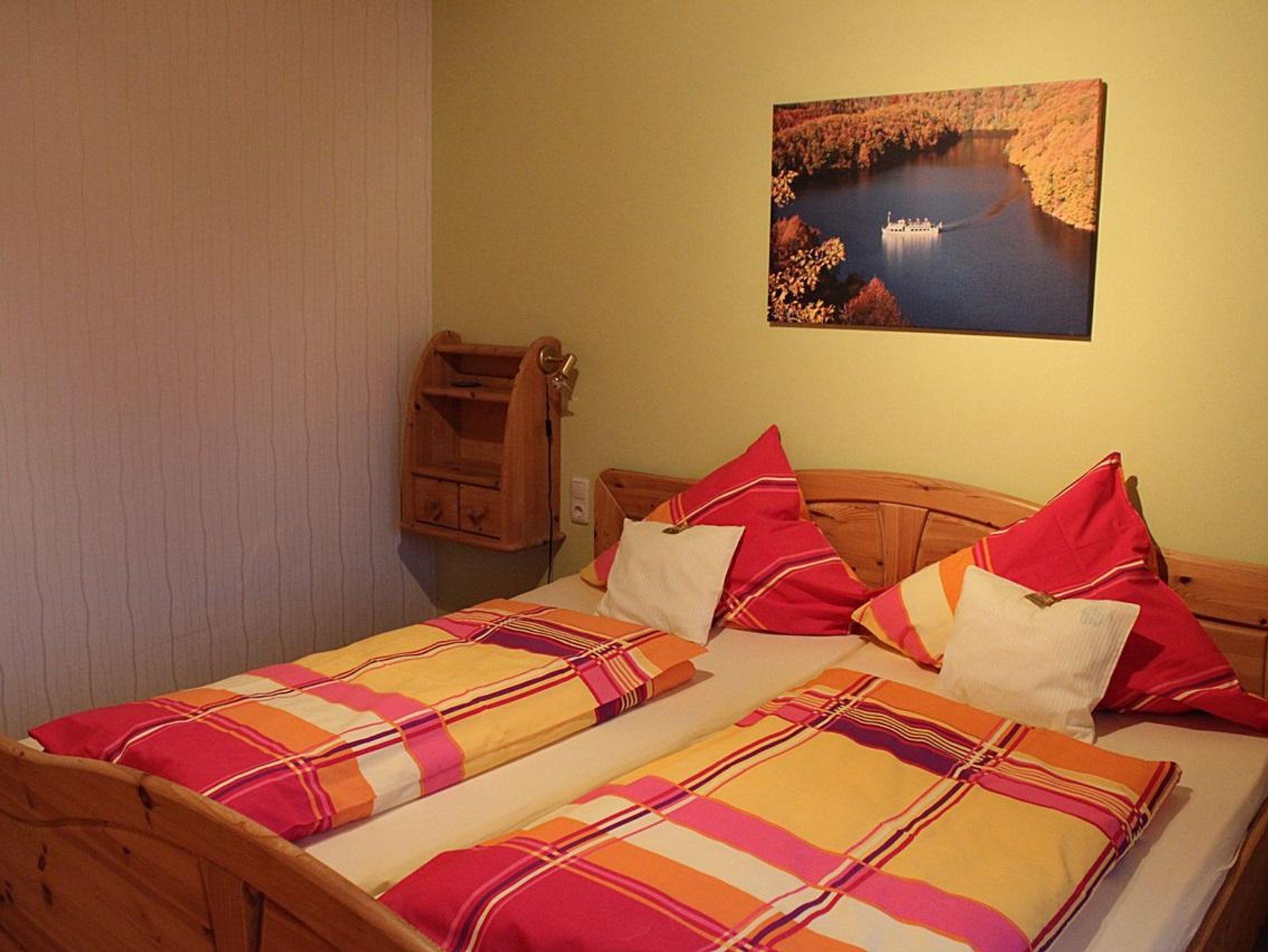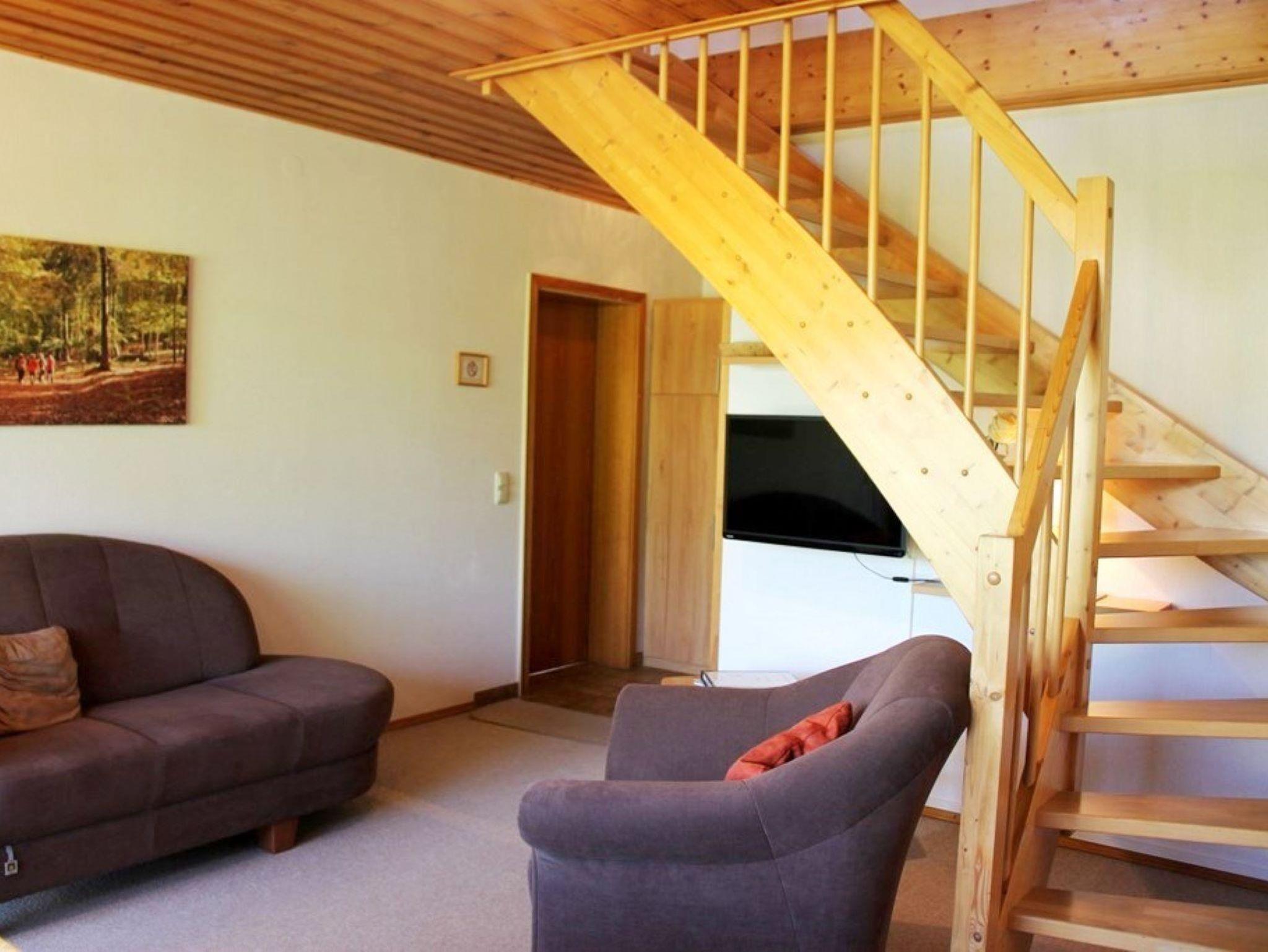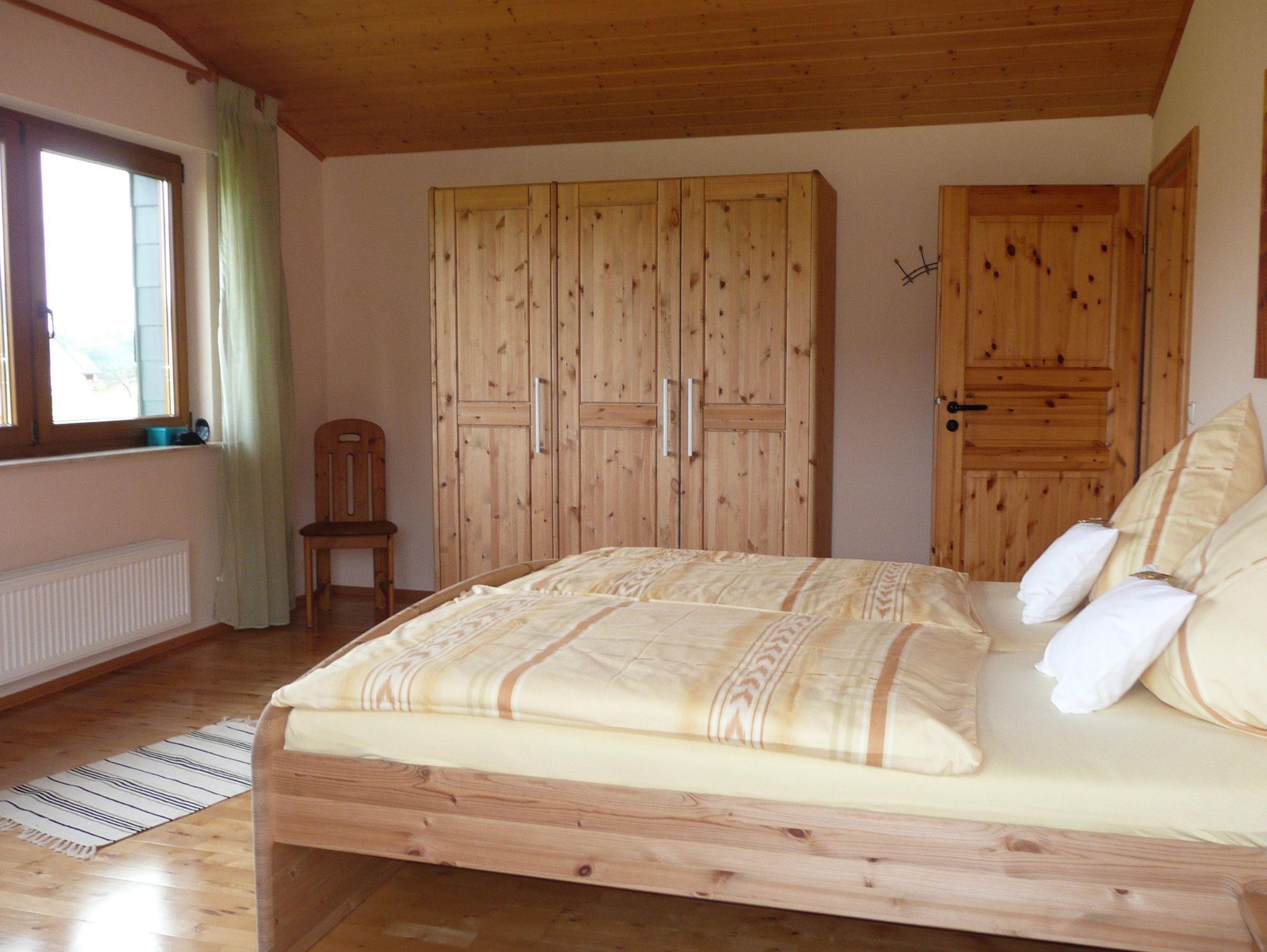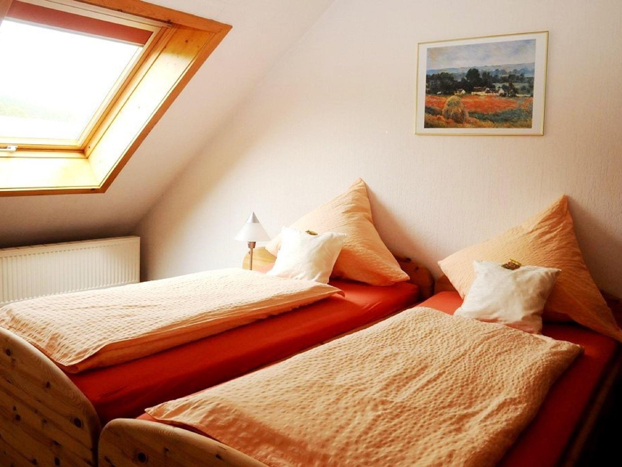 Die zwei 80 m² großen Ferienwohnungen liegen ruhig am Orts-und Waldrand. Sep. Eingang, über zwei Ebenen verteilt jeweils 1 Wohnraum mit Sitz- und Essecke, komplette Einbauküchenzeile, offene Empore als Ruhezone, 2 Schlafzimmer mit Du bzw. Bad/WC. Sat-TV.