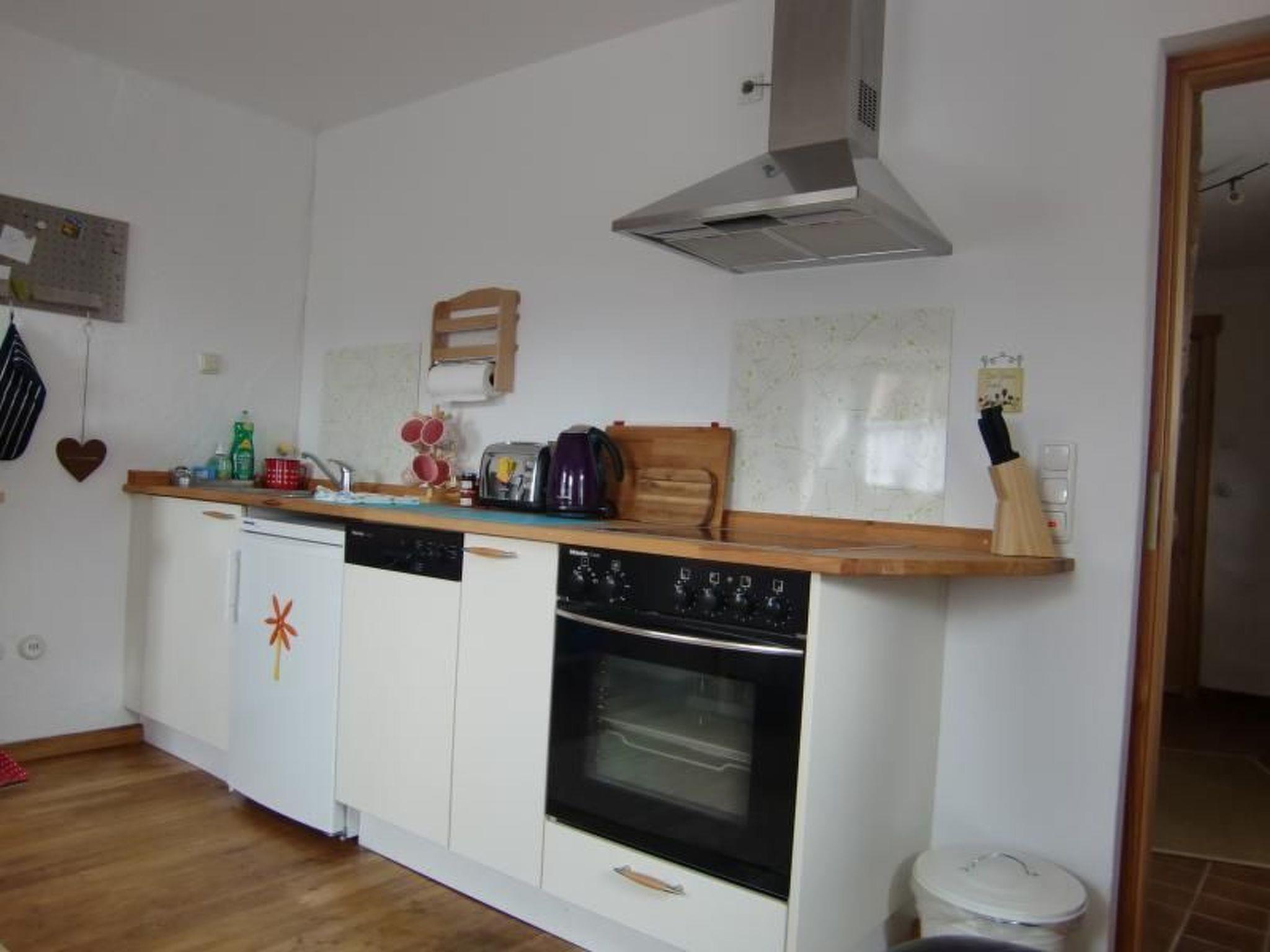 The interior of our holiday flat in the main house of a former farmhouse leaves nothing to be desired. From the spacious entrance area you enter the modern eat-in kitchen, equipped with a Miele cooker and oven on a ceramic hob, a Miele dishwasher and a Liebherr fridge with freezer compartment. A microwave, coffee machine, kettle and toaster are of course also available. A comfortable leather sofa, a flat screen with satellite TV, a DVD player and a stereo system with CD player provide entertainment. The upper floor houses the cosy bedroom with double bed and a bathroom with shower and WC, with bed linen and a set of towels provided. Wifi is of course also available.