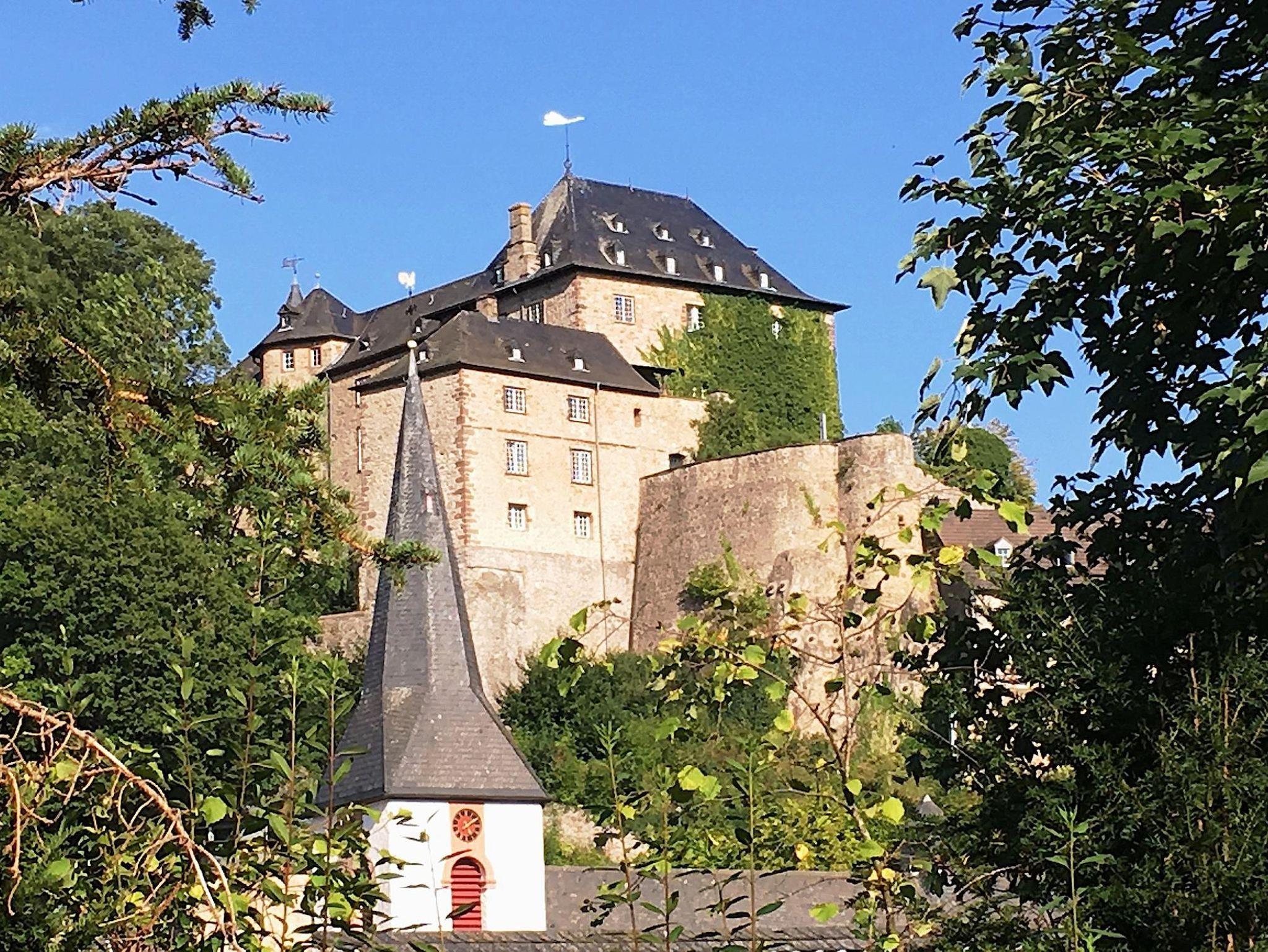 Unsere Gäste der Burg Maisonette haben Zugang zu der großen Außenterrasse mit großem Tisch und eigenem Grill. Die Terrasse liegt eine Etage tiefer und grenzt an den riesigen Garten, der in Hanglage einen grandiosen Blick auf die Burg Blankenheim bietet.