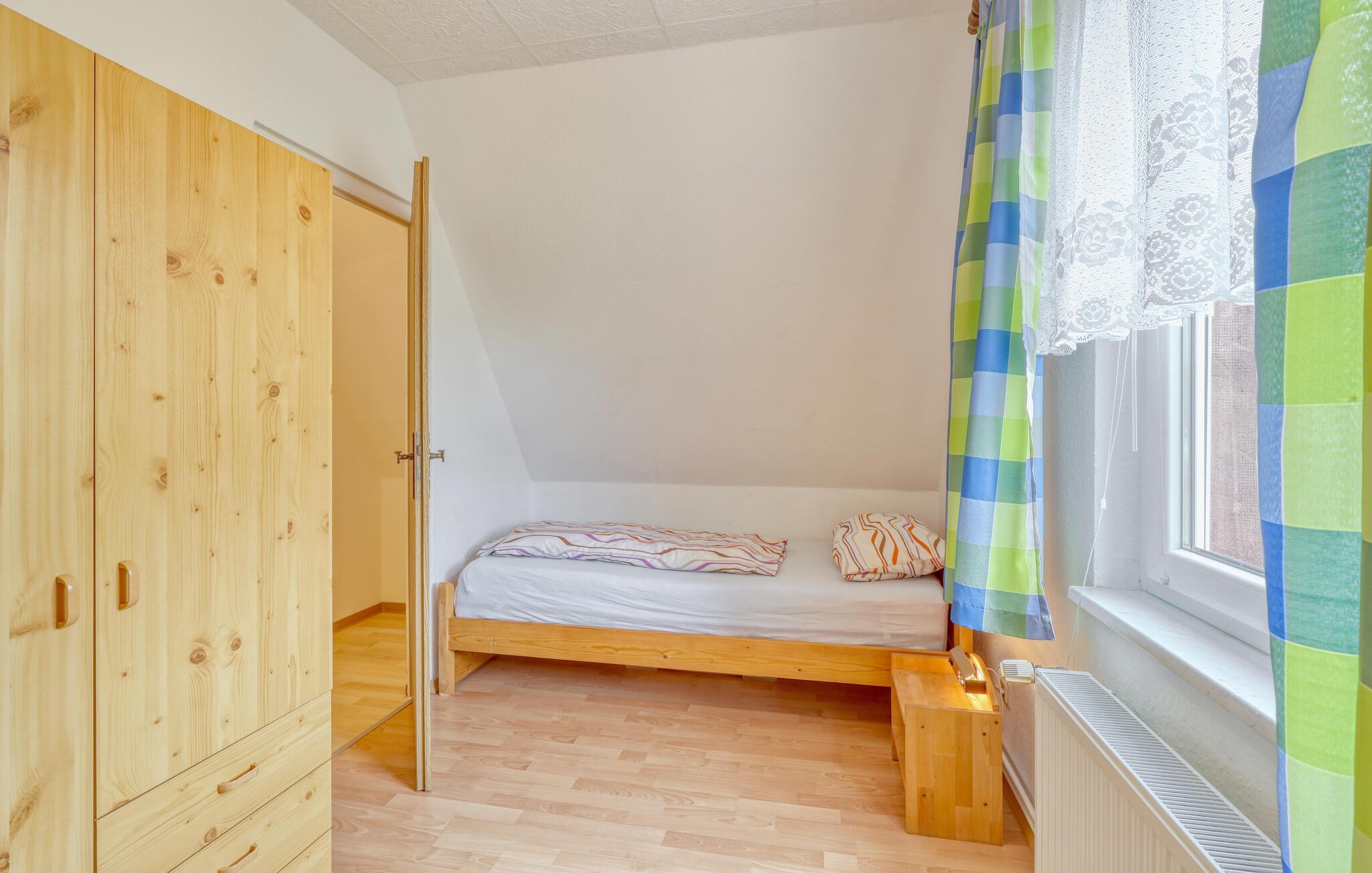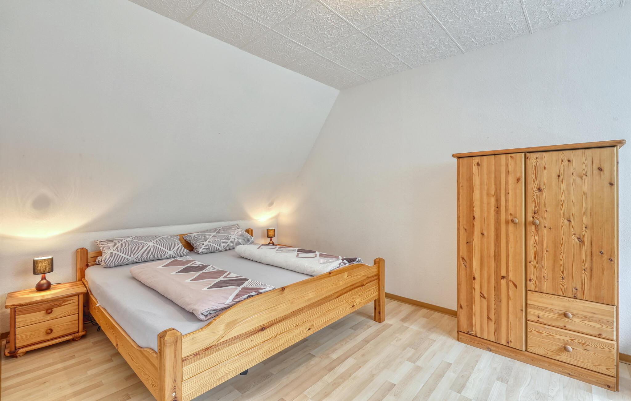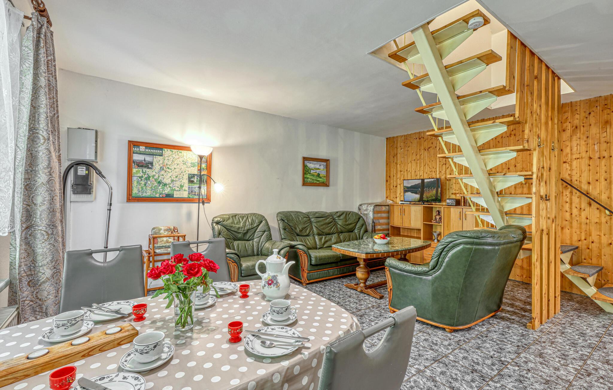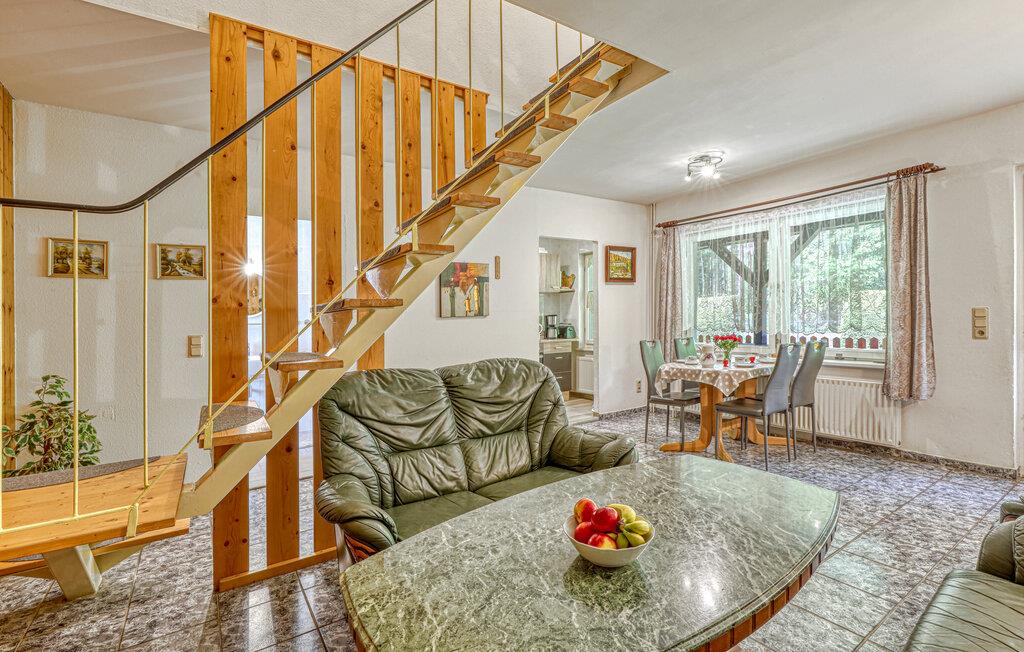De to ca. 60 kvm, centralt opvarmede lejligheder (hver en halvdel af huset) strækker sig over to etager og er udstyret med en stue (polstrede møbler, spiseplads, fladskærms-tv, radio), 2 soveværelser via trapper (1x dobbeltværelse). værelse). seng, 1x udtræksseng og liggestol), køkken (kogeplader eller el-komfur med ovn, køleskab, mikroovn, diverse små køkkenmaskiner) og badeværelse (renoveret i 2022, bruseniche i gulv, toilet, håndklæderadiator). Hver lejlighed har også en møbleret terrasse, liggestole, grill, parkeringsplads, bålplads, legeplads (for alle gæster) og efter anmodning vaskemaskine (mod betaling) Slutrengøring er inkluderet i den samlede pris. Medbring venligst eget sengelinned og håndklæder. Betales lokalt: energi og vand efter forbrug. Denne ejendom tillader en lille hund op til 40 cm i størrelse. Køkkenet, renoveret i 2020 og helt nyudstyret, har el-komfur med ovn. Rödlin er et distrikt i Blankensee kommune i et område rigt på skove og søer, cirka 15 km nordøst for den tidligere boligby Neustrelitz.