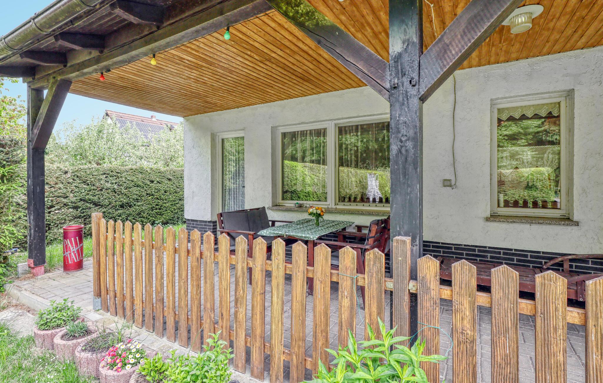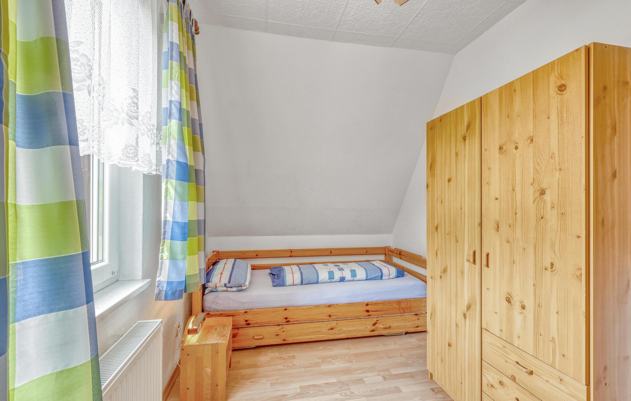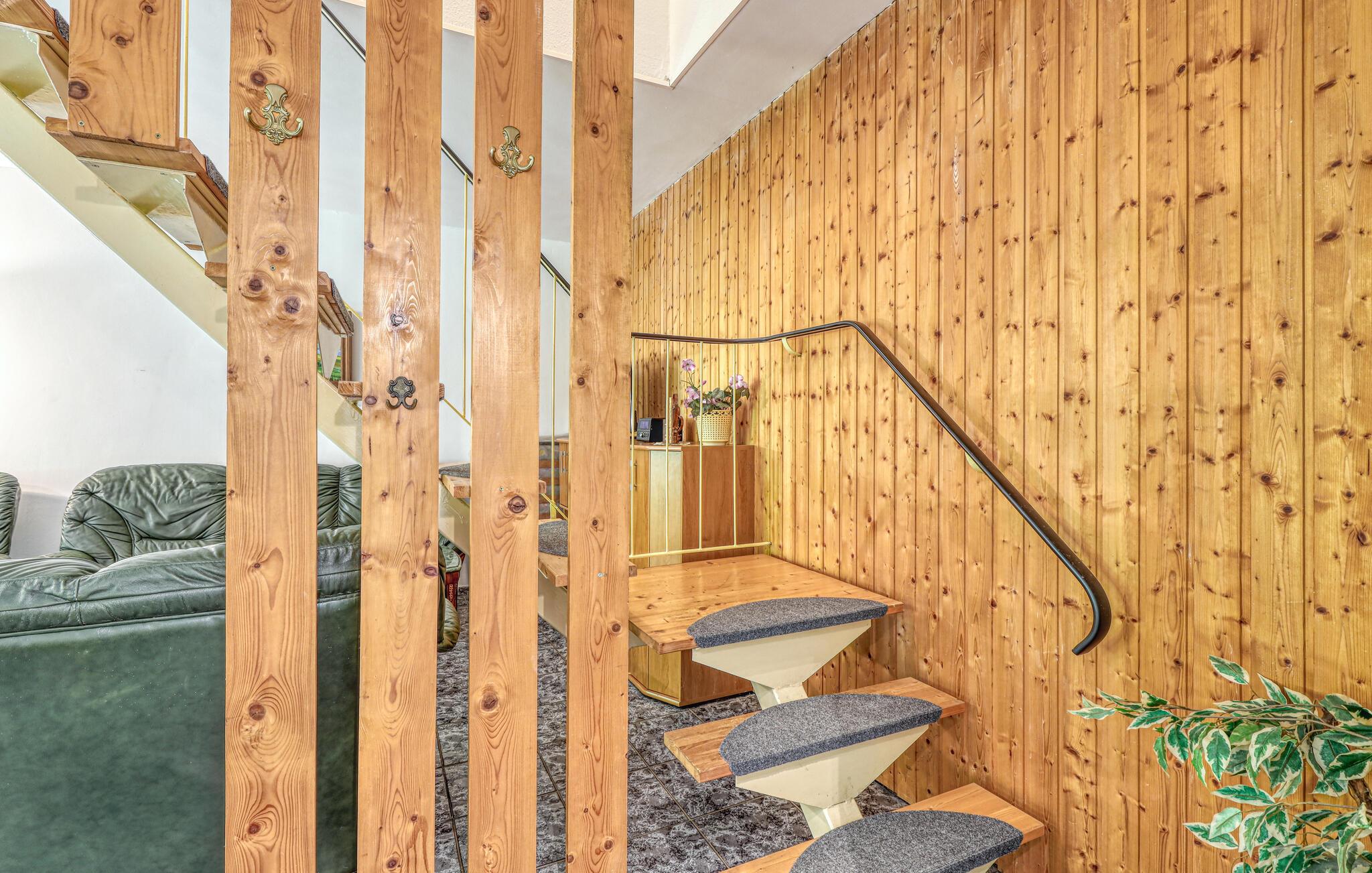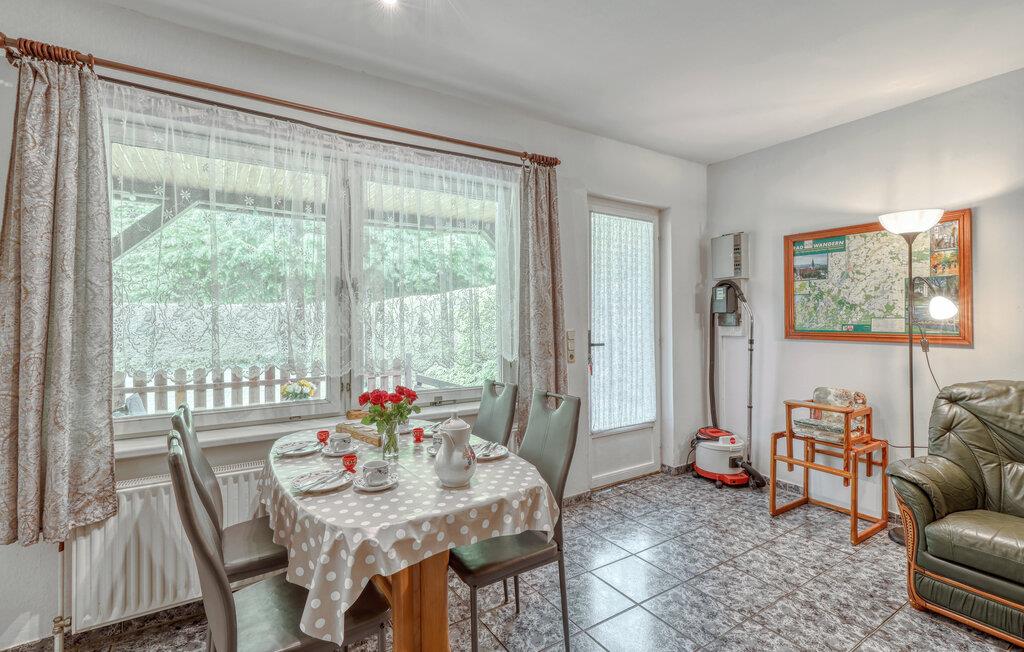 De to ca. 60 kvm, centralt opvarmede lejligheder (hver en halvdel af huset) strækker sig over to etager og er udstyret med en stue (polstrede møbler, spiseplads, fladskærms-tv, radio), 2 soveværelser via trapper (1x dobbeltværelse). værelse). seng, 1x udtræksseng og liggestol), køkken (kogeplader eller el-komfur med ovn, køleskab, mikroovn, diverse små køkkenmaskiner) og badeværelse (renoveret i 2022, bruseniche i gulv, toilet, håndklæderadiator). Hver lejlighed har også en møbleret terrasse, liggestole, grill, parkeringsplads, bålplads, legeplads (for alle gæster) og efter anmodning vaskemaskine (mod betaling) Slutrengøring er inkluderet i den samlede pris. Medbring venligst eget sengelinned og håndklæder. Betales lokalt: energi og vand efter forbrug. Denne ejendom tillader en lille hund op til 40 cm i størrelse. Køkkenet, renoveret i 2020 og helt nyudstyret, har el-komfur med ovn. Rödlin er et distrikt i Blankensee kommune i et område rigt på skove og søer, cirka 15 km nordøst for den tidligere boligby Neustrelitz.